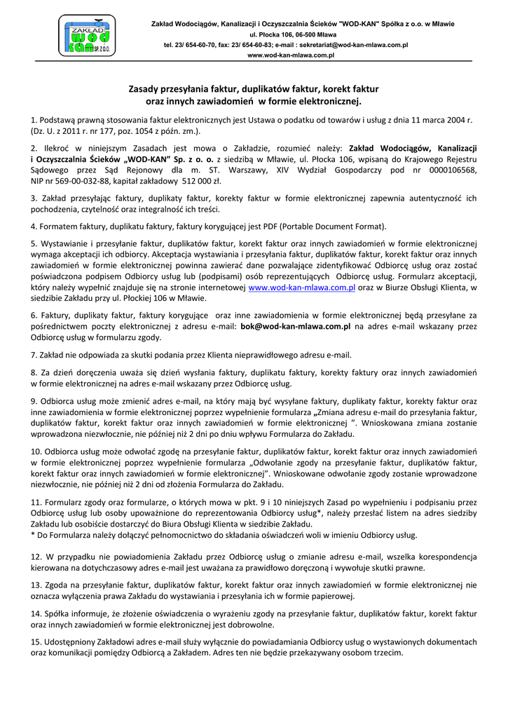 Zakład Wodociągów, Kanalizacji i Oczyszczalnia Ścieków "WOD-KAN" Spółka z o.o. w Mławie ul. Płocka 106, 06-500 Mława tel. 23/ 654-60-70, fax: 23/ 654-60-83; e-mail : [email protected] www.wod-kan-mlawa.com.pl Zasady przesyłania faktur, duplikatów faktur, korekt faktur oraz innych zawiadomień w formie elektronicznej. 1. Podstawą prawną stosowania faktur elektronicznych jest Ustawa o podatku od towarów i usług z dnia 11 marca 2004 r. (Dz. U. z 2011 r. nr 177, poz. 1054 z późn. zm.). 2. Ilekroć w niniejszym Zasadach jest mowa o Zakładzie, rozumieć należy: Zakład Wodociągów, Kanalizacji i Oczyszczalnia Ścieków „WOD-KAN” Sp. z o. o. z siedzibą w Mławie, ul. Płocka 106, wpisaną do Krajowego Rejestru Sądowego przez Sąd Rejonowy dla m. ST. Warszawy, XIV Wydział Gospodarczy pod nr 0000106568, NIP nr 569-00-032-88, kapitał zakładowy 512 000 zł. 3. Zakład przesyłając faktury, duplikaty faktur, korekty faktur w formie elektronicznej zapewnia autentyczność ich pochodzenia, czytelność oraz integralność ich treści. 4. Formatem faktury, duplikatu faktury, faktury korygującej jest PDF (Portable Document Format). 5. Wystawianie i przesyłanie faktur, duplikatów faktur, korekt faktur oraz innych zawiadomień w formie elektronicznej wymaga akceptacji ich odbiorcy. Akceptacja wystawiania i przesyłania faktur, duplikatów faktur, korekt faktur oraz innych zawiadomień w formie elektronicznej powinna zawierać dane pozwalające zidentyfikować Odbiorcę usług oraz zostać poświadczona podpisem Odbiorcy usług lub (podpisami) osób reprezentujących Odbiorcę usług. Formularz akceptacji, który należy wypełnić znajduje się na stronie internetowej www.wod-kan-mlawa.com.pl oraz w Biurze Obsługi Klienta, w siedzibie Zakładu przy ul. Płockiej 106 w Mławie. 6. Faktury, duplikaty faktur, faktury korygujące oraz inne zawiadomienia w formie elektronicznej będą przesyłane za pośrednictwem poczty elektronicznej z adresu e-mail: [email protected] na adres e-mail wskazany przez Odbiorcę usług w formularzu zgody. 7. Zakład nie odpowiada za skutki podania przez Klienta nieprawidłowego adresu e-mail. 8. Za dzień doręczenia uważa się dzień wysłania faktury, duplikatu faktury, korekty faktury oraz innych zawiadomień w formie elektronicznej na adres e-mail wskazany przez Odbiorcę usług. 9. Odbiorca usług może zmienić adres e-mail, na który mają być wysyłane faktury, duplikaty faktur, korekty faktur oraz inne zawiadomienia w formie elektronicznej poprzez wypełnienie formularza „Zmiana adresu e-mail do przesyłania faktur, duplikatów faktur, korekt faktur oraz innych zawiadomień w formie elektronicznej ”. Wnioskowana zmiana zostanie wprowadzona niezwłocznie, nie później niż 2 dni po dniu wpływu Formularza do Zakładu. 10. Odbiorca usług może odwołać zgodę na przesyłanie faktur, duplikatów faktur, korekt faktur oraz innych zawiadomień w formie elektronicznej poprzez wypełnienie formularza „Odwołanie zgody na przesyłanie faktur, duplikatów faktur, korekt faktur oraz innych zawiadomień w formie elektronicznej”. Wnioskowane odwołanie zgody zostanie wprowadzone niezwłocznie, nie później niż 2 dni od złożenia Formularza do Zakładu. 11. Formularz zgody oraz formularze, o których mowa w pkt. 9 i 10 niniejszych Zasad po wypełnieniu i podpisaniu przez Odbiorcę usług lub osoby upoważnione do reprezentowania Odbiorcy usług*, należy przesłać listem na adres siedziby Zakładu lub osobiście dostarczyć do Biura Obsługi Klienta w siedzibie Zakładu. * Do Formularza należy dołączyć pełnomocnictwo do składania oświadczeń woli w imieniu Odbiorcy usług. 12. W przypadku nie powiadomienia Zakładu przez Odbiorcę usług o zmianie adresu e-mail, wszelka korespondencja kierowana na dotychczasowy adres e-mail jest uważana za prawidłowo doręczoną i wywołuje skutki prawne. 13. Zgoda na przesyłanie faktur, duplikatów faktur, korekt faktur oraz innych zawiadomień w formie elektronicznej nie oznacza wyłączenia prawa Zakładu do wystawiania i przesyłania ich w formie papierowej. 14. Spółka informuje, że złożenie oświadczenia o wyrażeniu zgody na przesyłanie faktur, duplikatów faktur, korekt faktur oraz innych zawiadomień w formie elektronicznej jest dobrowolne. 15. Udostępniony Zakładowi adres e-mail służy wyłącznie do powiadamiania Odbiorcy usług o wystawionych dokumentach oraz komunikacji pomiędzy Odbiorcą a Zakładem. Adres ten nie będzie przekazywany osobom trzecim.