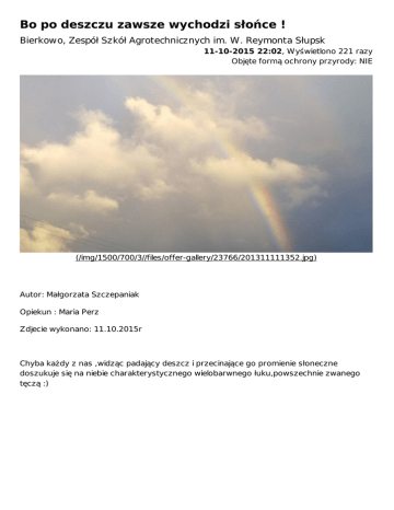 Bo po deszczu zawsze wychodzi słońce ! Bierkowo, Zespół Szkół Agrotechnicznych im. W. Reymonta Słupsk 11-10-2015 22:02, Wyświetlono 221 razy Objęte formą ochrony przyrody: NIE (/img/1500/700/3//files/offer-gallery/23766/201311111352.jpg) Autor: Małgorzata Szczepaniak Opiekun : Maria Perz Zdjecie wykonano: 11.10.2015r Chyba każdy z nas ,widząc padający deszcz i przecinające go promienie słoneczne doszukuje się na niebie charakterystycznego wielobarwnego łuku,powszechnie zwanego tęczą :)