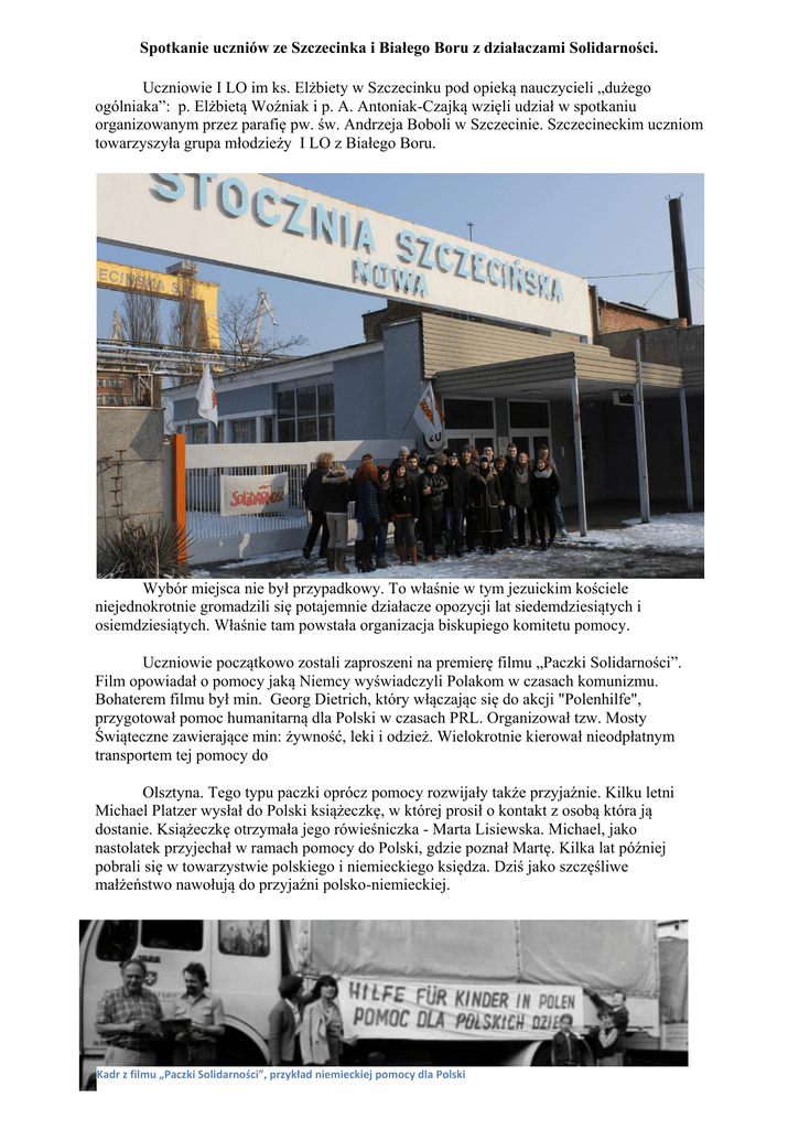 Spotkanie uczniów ze Szczecinka i Białego Boru z działaczami Solidarności. Uczniowie I LO im ks. Elżbiety w Szczecinku pod opieką nauczycieli „dużego ogólniaka”: p. Elżbietą Woźniak i p. A. Antoniak-Czajką wzięli udział w spotkaniu organizowanym przez parafię pw. św. Andrzeja Boboli w Szczecinie. Szczecineckim uczniom towarzyszyła grupa młodzieży I LO z Białego Boru. Wybór miejsca nie był przypadkowy. To właśnie w tym jezuickim kościele niejednokrotnie gromadzili się potajemnie działacze opozycji lat siedemdziesiątych i osiemdziesiątych. Właśnie tam powstała organizacja biskupiego komitetu pomocy. Uczniowie początkowo zostali zaproszeni na premierę filmu „Paczki Solidarności”. Film opowiadał o pomocy jaką Niemcy wyświadczyli Polakom w czasach komunizmu. Bohaterem filmu był min. Georg Dietrich, który włączając się do akcji "Polenhilfe", przygotował pomoc humanitarną dla Polski w czasach PRL. Organizował tzw. Mosty Świąteczne zawierające min: żywność, leki i odzież. Wielokrotnie kierował nieodpłatnym transportem tej pomocy do Olsztyna. Tego typu paczki oprócz pomocy rozwijały także przyjaźnie. Kilku letni Michael Platzer wysłał do Polski książeczkę, w której prosił o kontakt z osobą która ją dostanie. Książeczkę otrzymała jego rówieśniczka - Marta Lisiewska. Michael, jako nastolatek przyjechał w ramach pomocy do Polski, gdzie poznał Martę. Kilka lat później pobrali się w towarzystwie polskiego i niemieckiego księdza. Dziś jako szczęśliwe małżeństwo nawołują do przyjaźni polsko-niemieckiej. Kadr z filmu „Paczki Solidarności”, przykład niemieckiej pomocy dla Polski „Sytuacja w Polsce wzbudziła współczucie u ludzi z zagranicy, zwłaszcza z Niemiec, którzy niestety stereotypowo żywią niechęć do Polaków. Ten film właśnie obalił ten stereotyp.” – w wywiadzie dla TVP Szczecin wspomniał jeden z uczniów szczecineckiego LO. Punktem kulminacyjnym konferencji było spotkanie z p. prof. Teresą Dziembowską i p. prof. Sewerynem Wiechowskim, znanym i cenionym kardiochirurgiem. Pan Seweryn Wiechowski opowiadał o pomocy medycznej, jaką dla Polski wyświadczyły kraje ościenne, głównie Szwecja. Dzięki tej pomocy Szczeciński szpital mógł utrzymać wysoki poziom lecznictwa w dobie kryzysu w PRL. Po konferencji uczniowie wyruszyli pod bramę szczecińskiej stoczni, upamiętniającej ofiary grudnia 70 i 80r. Tam Aktualny wygląd szczecińskiej stoczni wysłuchali historii strajków w mieście, po czym udali się na Zamek Książąt Pomorskich. Mieli tam okazję zobaczyć wystawę upamiętniającą 150 rocznicę powstania styczniowego. Żywą lekcję historii uczniom ze Szczecinka i Białego Boru sponsorował marszałek województwa: Olgierd Geblewicz