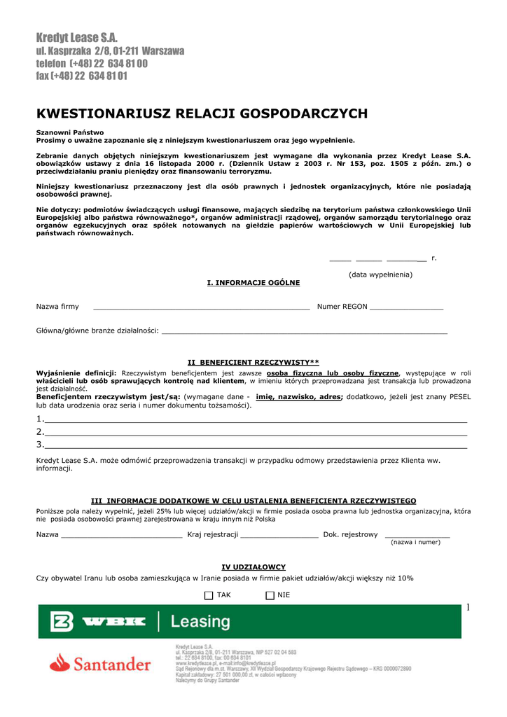Kredyt Lease S.A. ul. Kasprzaka 2/8, 01-211 Warszawa telefon (+48) 22 634 81 00 fax (+48) 22 634 81 01 KWESTIONARIUSZ RELACJI GOSPODARCZYCH Szanowni Państwo Prosimy o uważne zapoznanie się z niniejszym kwestionariuszem oraz jego wypełnienie. Zebranie danych objętych niniejszym kwestionariuszem jest wymagane dla wykonania przez Kredyt Lease S.A. obowiązków ustawy z dnia 16 listopada 2000 r. (Dziennik Ustaw z 2003 r. Nr 153, poz. 1505 z późn. zm.) o przeciwdziałaniu praniu pieniędzy oraz finansowaniu terroryzmu. Niniejszy kwestionariusz przeznaczony jest dla osób prawnych i jednostek organizacyjnych, które nie posiadają osobowości prawnej. Nie dotyczy: podmiotów świadczących usługi finansowe, mających siedzibę na terytorium państwa członkowskiego Unii Europejskiej albo państwa równoważnego*, organów administracji rządowej, organów samorządu terytorialnego oraz organów egzekucyjnych oraz spółek notowanych na giełdzie papierów wartościowych w Unii Europejskiej lub państwach równoważnych. _____ ______ _______ r. (data wypełnienia) I. INFORMACJE OGÓLNE Nazwa firmy __________________________________________________ Numer REGON _________________ Główna/główne branże działalności: __________________________________________________________________ II BENEFICIENT RZECZYWISTY** Wyjaśnienie definicji: Rzeczywistym beneficjentem jest zawsze osoba fizyczna lub osoby fizyczne, występujące w roli właścicieli lub osób sprawujących kontrolę nad klientem, w imieniu których przeprowadzana jest transakcja lub prowadzona jest działalność. Beneficjentem rzeczywistym jest/są: (wymagane dane - imię, nazwisko, adres; dodatkowo, jeżeli jest znany PESEL lub data urodzenia oraz seria i numer dokumentu tożsamości). 1.______________________________________________________________________________ 2.______________________________________________________________________________ 3.______________________________________________________________________________ Kredyt Lease S.A. może odmówić przeprowadzenia transakcji w przypadku odmowy przedstawienia przez Klienta ww. informacji. III INFORMACJE DODATKOWE W CELU USTALENIA BENEFICIENTA RZECZYWISTEGO Poniższe pola należy wypełnić, jeżeli 25% lub więcej udziałów/akcji w firmie posiada osoba prawna lub jednostka organizacyjna, która nie posiada osobowości prawnej zarejestrowana w kraju innym niż Polska Nazwa ____________________________ Kraj rejestracji __________________ Dok. rejestrowy _______________ (nazwa i numer) IV UDZIAŁOWCY Czy obywatel Iranu lub osoba zamieszkująca w Iranie posiada w firmie pakiet udziałów/akcji większy niż 10% TAK NIE 1 Kredyt Lease S.A. ul. Kasprzaka 2/8, 01-211 Warszawa telefon (+48) 22 634 81 00 fax (+48) 22 634 81 01 V GŁÓWNI KONTRAHENCI FIRMY Nazwa ____________________________ Branża ________________________ Kraj rejestracji _________________ Nazwa ____________________________ Branża ________________________ Kraj rejestracji _________________ Nazwa ____________________________ Branża ________________________ Kraj rejestracji ________________ VI OŚWIADCZENIE KLIENTA Niniejszym podpisem zaświadczam, że informacje podane powyżej w pkt. I-V są prawdziwe i podejmuję się niezwłocznie pisemnie powiadomić Kredyt Lease S.A. o wszelkich istotnych zmianach w zakresie podanych informacji. Oświadczam również, że Kredyt Lease S.A. może wnioskować o przedstawienie dokumentów potwierdzających dane i informacje dotyczące beneficjenta rzeczywistego i odmówić wykonania umowy w przypadku ich niedostarczenia. Kwestionariusz wypełnił/wypełnili _______________________________________ (Imię, nazwisko, sposób reprezentacji) __________________ (podpis) Przedstawiciel Kredyt Lease S.A. przyjmujący kwestionariusz: Weryfikacji beneficjenta rzeczywistego dokonano w oparciu o następujące dokumenty (zaznacz właściwe): KRS/dokument tożsamości/akt założycielski/sprawozdanie finansowe/niniejszy kwestionariusz/inne .......................................................... numer ............................................ Imię, nazwisko ______________________________________________ Podpis __________________________ Data przyjęcia __________________________ ________________________________________________________________________________________________ * Państwa równoważne: Związek Australijski, Federacyjna Republika Brazylii, Japonia, Kanada, Meksykańskie Stany Zjednoczone, Nowa Zelandia, Federacja Rosyjska, Republika Południowej Afryki, Republika Singapuru, Stany Zjednoczone Ameryki, Konfederacja Szwajcarska, terytoria Zamorskie Republiki Francuskiej (Mayotte, Nowa Kaledonia, Polinezja Francuska, Saint Pierre i Miquelon, Wallis i Futuna) ** Definicja beneficjenta rzeczywistego: a) osoba fizyczna lub osoby fizyczne, które są właścicielami osoby prawnej lub sprawują kontrolę nad klientem albo mają wpływ na osobę fizyczną, w imieniu której przeprowadzana jest transakcja lub prowadzona jest działalność, b) osoba fizyczną lub osoby fizyczne, które są udziałowcami lub akcjonariuszami lub posiadają prawo głosu na zgromadzeniu wspólników w wysokości powyżej 25 % w tej osobie prawnej, w tym za pomocą pakietów akcji na okaziciela, z wyjątkiem spółek, których papiery wartościowe są w obrocie zorganizowanym, podlegających lub stosujących przepisy prawa Unii Europejskiej w zakresie ujawniania informacji, a także podmiotów świadczących usługi finansowe na terytorium państwa członkowskiego Unii Europejskiej albo państwa równoważnego - w przypadku osób prawnych, c) osoba fizyczna lub osoby fizyczne, które sprawują kontrolę nad co najmniej 25 % majątku - w przypadku podmiotów, którym powierzono administrowanie wartościami majątkowymi oraz rozdzielanie takich wartości, z wyjątkiem podmiotów wykonujących czynności, o których mowa w art. 69 ust. 2 pkt 4 ustawy z dnia 29 lipca 2005 r. o obrocie instrumentami fina