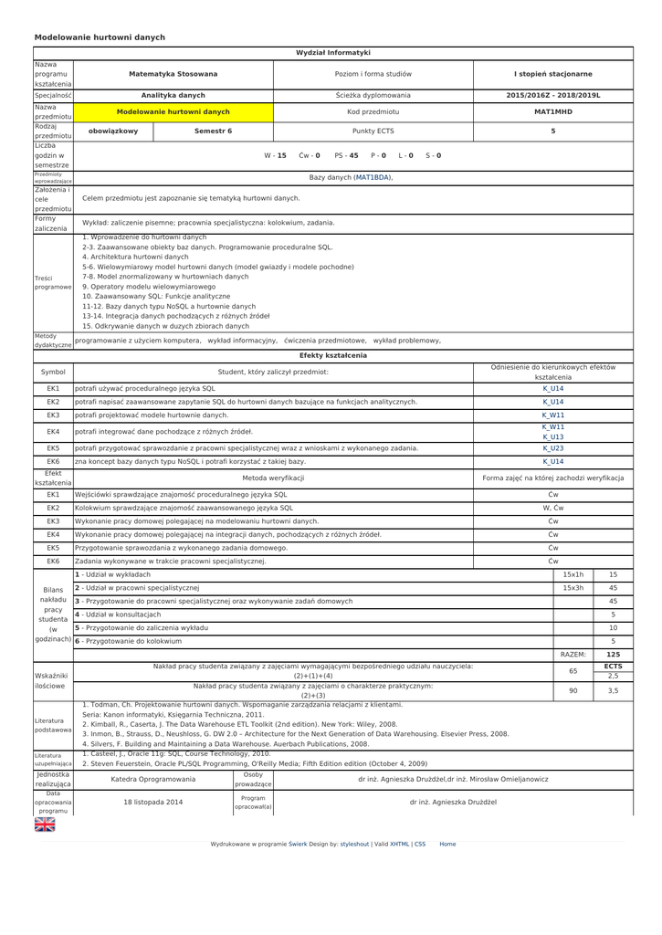 Modelowanie hurtowni danych Wydział Informatyki Nazwa programu kształcenia Matematyka Stosowana Poziom i forma studiów I stopień stacjonarne Analityka danych Ścieżka dyplomowania 2015/2016Z - 2018/2019L Modelowanie hurtowni danych Kod przedmiotu MAT1MHD Punkty ECTS 5 Specjalność Nazwa przedmiotu Rodzaj przedmiotu obowiązkowy Semestr 6 Liczba godzin w semestrze W - 15 Ćw - 0 PS - 45 P - 0 L - 0 S - 0 Przedmioty wprowadzające Bazy danych (MAT1BDA), Założenia i cele przedmiotu Celem przedmiotu jest zapoznanie się tematyką hurtowni danych. Formy zaliczenia Wykład: zaliczenie pisemne; pracownia specjalistyczna: kolokwium, zadania. Treści programowe 1. Wprowadzenie do hurtowni danych 2-3. Zaawansowane obiekty baz danych. Programowanie proceduralne SQL. 4. Architektura hurtowni danych 5-6. Wielowymiarowy model hurtowni danych (model gwiazdy i modele pochodne) 7-8. Model znormalizowany w hurtowniach danych 9. Operatory modelu wielowymiarowego 10. Zaawansowany SQL: Funkcje analityczne 11-12. Bazy danych typu NoSQL a hurtownie danych 13-14. Integracja danych pochodzących z różnych źródeł 15. Odkrywanie danych w duzych zbiorach danych Metody programowanie z użyciem komputera, wykład informacyjny, ćwiczenia przedmiotowe, wykład problemowy, dydaktyczne Efekty kształcenia Symbol Odniesienie do kierunkowych efektów kształcenia Student, który zaliczył przedmiot: EK1 potrafi używać proceduralnego języka SQL EK2 potrafi napisać zaawansowane zapytanie SQL do hurtowni danych bazujące na funkcjach analitycznych. K_U14 EK3 potrafi projektować modele hurtownie danych. K_W11 EK4 potrafi integrować dane pochodzące z różnych źródeł. K_W11 K_U13 EK5 potrafi przygotować sprawozdanie z pracowni specjalistycznej wraz z wnioskami z wykonanego zadania. K_U23 EK6 zna koncept bazy danych typu NoSQL i potrafi korzystać z takiej bazy. K_U14 Efekt kształcenia K_U14 Metoda weryfikacji Forma zajęć na której zachodzi weryfikacja EK1 Wejściówki sprawdzające znajomość proceduralnego języka SQL EK2 Kolokwium sprawdzające znajomość zaawansowanego języka SQL EK3 Wykonanie pracy domowej polegającej na modelowaniu hurtowni danych. Ćw EK4 Wykonanie pracy domowej polegającej na integracji danych, pochodzących z różnych źródeł. Ćw EK5 Przygotowanie sprawozdania z wykonanego zadania domowego. Ćw EK6 Zadania wykonywane w trakcie pracowni specjalistycznej. Ćw Bilans nakładu pracy studenta (w godzinach) Ćw W, Ćw 1 - Udział w wykładach 15x1h 15 2 - Udział w pracowni specjalistycznej 15x3h 45 3 - Przygotowanie do pracowni specjalistycznej oraz wykonywanie zadań domowych 45 4 - Udział w konsultacjach 5 5 - Przygotowanie do zaliczenia wykładu 10 6 - Przygotowanie do kolokwium 5 RAZEM: Wskaźniki ilościowe Literatura podstawowa Literatura uzupełniająca Jednostka realizująca Nakład pracy studenta związany z zajęciami wymagającymi bezpośredniego udziału nauczyciela: (2)+(1)+(4) Nakład pracy studenta związany z zajęciami o charakterze praktycznym: (2)+(3) 1. Todman, Ch. Projektowanie hurtowni danych. Wspomaganie zarządzania relacjami z klientami. Seria: Kanon informatyki, Księgarnia Techniczna, 2011. 2. Kimball, R., Caserta, J. The Data Warehouse ETL Toolkit (2nd edition). New York: Wiley, 2008. 3. Inmon, B., Strauss, D., Neushloss, G. DW 2.0 – Architecture for the Next Generation of Data Warehousing. Elsevier Press, 2008. 4. Silvers, F. Building and Maintaining a Data Warehouse. Auerbach Publications, 2008. 1. Casteel, J., Oracle 11g: SQL, Course Technology, 2010. 2. Steven Feuerstein, Oracle PL/SQL Programming, O'Reilly Media; Fifth Edition edition (October 4, 2009) Katedra Oprogramowania Osoby prowadzące dr inż. Agnieszka Drużdżel,dr inż. Mirosław Omieljanowicz 18 listopada 2014 Program opracował(a) dr inż. Agnieszka Drużdżel Data opracowania programu Wydrukowane w programie Świerk Design by: styleshout | Valid XHTML | CSS Home 65 90 125 ECTS 2,5 3,5