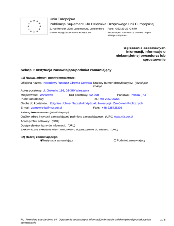 Unia Europejska Publikacja Suplementu do Dziennika Urzędowego Unii Europejskiej 2, rue Mercier, 2985 Luxembourg, Luksemburg Faks: +352 29 29 42 670 E-mail: [email protected] Informacje i formularze on-line: http:// simap.europa.eu Ogłoszenie dodatkowych informacji, informacje o niekompletnej procedurze lub sprostowanie Sekcja I: Instytucja zamawiająca/podmiot zamawiający I.1) Nazwa, adresy i punkty kontaktowe: Oficjalna nazwa: Narodowy Fundusz Zdrowia Centrala Krajowy numer identyfikacyjny: (jeżeli jest znany) _____ Adres pocztowy: ul. Grójecka 186, 02-390 Warszawa Miejscowość: Warszawa Kod pocztowy: 02-390 Punkt kontaktowy: _____ Państwo: Polska (PL) Tel.: +48 225726265 Osoba do kontaktów: Zbigniew Johne- Naczelnik Wydziału Inwestycji i Zamówień Publicznych E-mail: [email protected] Faks: +48 225726305 Adresy internetowe: (jeżeli dotyczy) Ogólny adres instytucji zamawiającej/ podmiotu zamawiającego: (URL) www.nfz.gov.pl Adres profilu nabywcy: (URL) _____ Dostęp elektroniczny do informacji: (URL) _____ Elektroniczne składanie ofert i wniosków o dopuszczenie do udziału: (URL) _____ I.2) Rodzaj zamawiającego: Instytucja zamawiająca Podmiot zamawiający PL Formularz standardowy 14 - Ogłoszenie dodatkowych informacji, informacje o niekompletnej procedurze lub sprostowanie 1/6 Sekcja II: Przedmiot zamówienia II.1.1) Nazwa nadana zamówieniu: Usługi serwisowe dla środowiska serwerów HP wraz z osprzętem w Centrali NFZ i Oddziałach wojewódzkich NFZ II.1.2) Krótki opis zamówienia lub zakupu: (podano w pierwotnym ogłoszeniu) 1. Ogólne zasady świadczenia serwisu pogwarancyjnego • Zamawiający wymaga, aby czas świadczenia serwisu trwał 24 miesiące od dnia podpisania umowy. • Usługi serwisowe świadczone będą dla następujących jednostek organizacyjnych Narodowego Funduszu Zdrowia: o Centrala Narodowego Funduszu Zdrowia, ul. Grójecka 186, 02-390 Warszawa o Podkarpacki Oddział Wojewódzki NFZ, ul. Zamkowa 8, 35-032 Rzeszów o Pomorski Oddział Wojewódzki NFZ, Marynarki Polskiej 148, 80-865 Gdańsk o Opolski Oddział Wojewódzki NFZ, ul. Głogowska 37, 45-315 Opole o Śląski Oddział Wojewódzki NFZ, ul. Kossutha 13, 40-844 Katowice o Małopolski Oddział Wojewódzki NFZ, ul. Józefa 21, 31-056 Kraków o Dolnośląski Oddział Wojewódzki NFZ, ul. Joannitów 6, 50-525 Wrocław o Lubuski Oddział Wojewódzki NFZ, ul. Podgórna 9b, 65-057 Zielona Góra o Podlaski Oddział Wojewódzki NFZ, ul. Pałacowe 3, 15-042 Białystok o Świętokrzyski Oddział Wojewódzki NFZ, ul. Jana Pawła II 9, 25-025 Kielce o Lubelski Oddział Wojewódzki NFZ, ul. Szkolna 16, 20-124 Lublin • Usługi serwisowe będą świadczone w miejscu użytkowania sprzętu, z możliwością naprawy w serwisie Wykonawcy, jeśli naprawa u użytkownika okaże się niemożliwa. • Wykonawca zapewni bezpośredni dostęp do poprawek i uaktualnień oraz nowych wersji oprogramowania objętego kontraktem serwisowym w sposób nie naruszający praw majątkowych. • Obsługa zgłoszeń dotyczących sprzętu i oprogramowania prowadzona będzie w języku polskim. • Konsultacje i warsztaty prowadzone będą w języku polskim. • Wszystkie części zamienne musza pochodzić z oficjalnego kanału dystrybucji • W przypadku uszkodzenia dysku twardego zostaje on wymieniony w siedzibie Oddziału na nowy bez konieczności zwracania uszkodzonego. • W przypadku wycofania serwera z bieżącej eksploatacji zamawiający może wycofać z umowy serwer z 3 miesięcznym okresem wypowiedzenia. • Wszelkie koszty związane z dostawą i wymianą części, naprawą oprogramowania ponosi Wykonawca. • W ramach świadczonego serwisu Wykonawca zapewnia dostęp do portalu internetowego Producenta sprzętu i oprogramowania HP zawierającego narzędzia wsparcia elektronicznego. W szczególności narzędzia te muszą umożliwiać: o Przeszukiwanie bazy wiedzy producenta dotyczącej sprzętu i oprogramowania objętego wsparciem zawierającej wykaz znanych symptomów nieprawidłowego działania systemów oraz sposobów naprawy, jak również opisy i specyfikacje produktów oraz dokumentację techniczną. o Pobieranie poprawek i nowych wersji oprogramowania objętego serwisem o Uzyskiwanie informacji o zgłoszeniach serwisowych i statusie napraw o Uzyskiwanie informacji o statusie umowy serwisowej oraz o urządzeniach nią objętych • Strony powołają Głównych Koordynatorów Umowy oraz przypisanych do każdego Oddziału Wojewódzkich Koordynatorów Lokalnych, których zadaniem będzie koordynacja prac świadczonych na rzecz Zamawiającego oraz współpraca z innymi dostawcami w ramach umów posiadanych przez Zamawiającego. PL Formularz standardowy 14 - Ogłoszenie dodatkowych informacji, informacje o niekompletnej procedurze lub sprostowanie 2/6 • Koordynator Lokalny Wykonawcy będzie główną osobą kontaktową dla Oddziału Wojewódzkiego Zamawiającego w sprawach bieżącej pomocy technicznej w zakresie infrastruktury informatycznej. Współpracuje on z personelem technicznym i z kierownictwem Zamawiającego w ramach ustalonych kompetencji. Ponadto zapewnia dodatkowe wsparcie specjalistów w sytuacjach, w których niezbędne są specyficzne kwalifikacje z zakresu określonej technologii, jak np. systemy operacyjne czy SAN. Koordynator Lokalny Wykonawcy opracowuje i uzgadnia z Koordynatorem Lokalnym Zamawiającego plan obsługi serwisowej, a także koordynuje i świadczy usługi techniczne, przeprowadza okresowe podsumowania, zarządza projektami, w razie potrzeby uczestniczy w wewnętrznych zebraniach, informuje o najlepszych praktykach i zasadach postępowania oraz organizuje inne formy współpracy, jeśli jest to niezbędne. • Wszelkie interpretacje i wyjaśnianie wątpliwości z zakresu przedmiotu umowy leżą w kompetencjach Głównych Koordynatorów stron. • W ramach przedmiotu zamówienia, Wykonawca zapewni Zamawiającemu 400 osobodni dedykowanych warsztatów, które będą wykonywane na rzecz Zamaw
