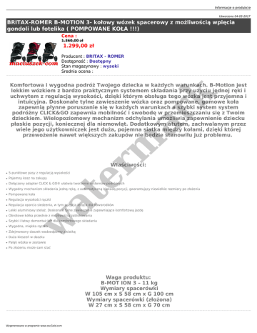 Informacje o produkcie Utworzono 04-03-2017 BRITAX-ROMER B-MOTION 3- kołowy wózek spacerowy z możliwością wpięcia gondoli lub fotelika ( POMPOWANE KOŁA !!!) Cena : 1.360,00 zł 1.299,00 zł Producent : BRITAX - ROMER Dostępność : Dostępny Stan magazynowy : wysoki Średnia ocena : er m ar k Komfortowa i wygodna podróż Twojego dziecka w każdych warunkach. B-Motion jest lekkim wózkiem z bardzo praktycznym systemem składania przy użyciu jednej ręki i uchwytem z regulacją wysokości, dzięki którym obsługa tego wózka jest przyjemna i intuicyjna. Doskonałe tylne zawieszenie wózka oraz pompowane, gumowe koła zapewnią płynne poruszanie się w każdych warunkach a szybki system system podróżny CLICK&GO zapewnia mobilność i swobodę w przemieszczaniu się z Twoim dzieckiem. Wielopoziomowy mechanizm odchylania umożliwia zapewnienie dziecku płaskie pozycji, koniecznej dla niemowląt. Dodatkowym atutem, zachwalanym przez wiele jego użytkowniczek jest duża, pojemna siatka między kołami, dzięki której przewożenie nawet większych zakupów nie będzie stanowiłu już problemu. Właściwości: 5-punktowe pasy z regulacją wysokości ● Pojemny kosz na zakupy ● Dołączony adapter CLICK & GO® ułatwia tworzenie systemów podróżnych ● Wygodny mechanizm składania jedną ręką, z automatyczną blokadą pozycji, gwarantujący niewielkie rozmiary po złożeniu ● Pompowane koła ● Regulacja wysokości rączki ● Regulacja oparcia siedzenia, w tym pozycja leżąca dla noworodków ● Lekki aluminiowy stelaż. Doskonałe tylne zawieszenie zapewniające komfortową jazdę ● Obrotowe kółka przednie z możliwością zablokowania ● Szybki i łatwy demontaż kół dla komfortowego składania ● Wygodna, miękka rączka ● Zdejmowany daszek wodoodporny z siatką ● Duża kieszeń w daszku ● Pałąk wózka w zestawie ● Po złożeniu może sam stać w at ● Waga produktu: B-MOT ION 3 – 11 kg Wymiary spacerówki W 105 cm x S 58 cm x G 100 cm Wymiary spacerówki (złożona) W 27 cm x S 58 cm x G 70 cm Wygenerowano w programie www.oscGold.com Dostępne opcje BRITAX-ROMER B-MOTION 3- kołowy wózek spacerowy z możliwością wpięcia gondoli lub fotelika ( POMPOWANE KOŁA !!!) w at er m ar k » BRITAX-ROMER: BM 3 BLACK, BM 3 BROWN, BM 3 CHILI.