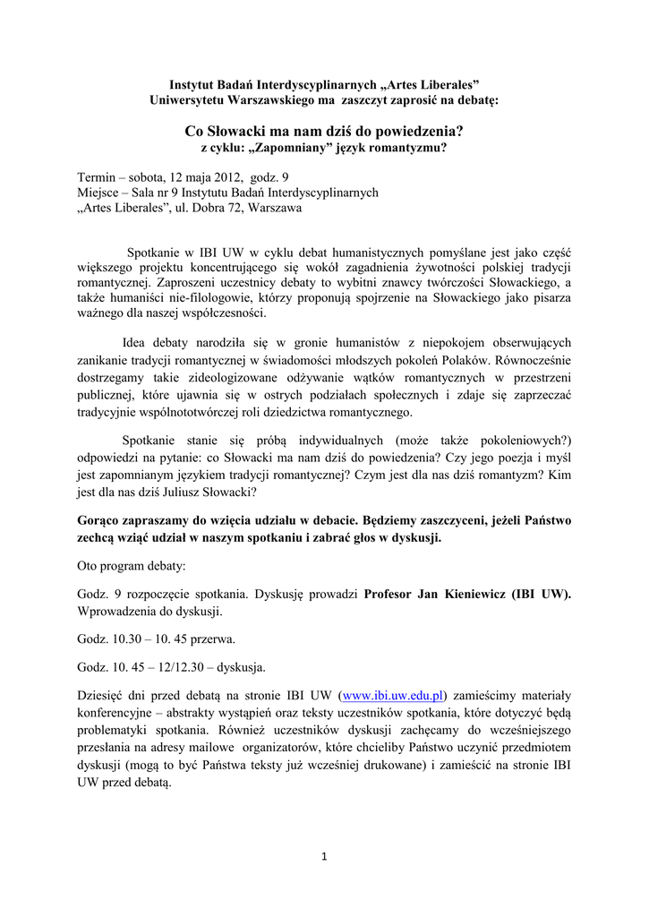 Instytut Badań Interdyscyplinarnych „Artes Liberales” Uniwersytetu Warszawskiego ma zaszczyt zaprosić na debatę: Co Słowacki ma nam dziś do powiedzenia? z cyklu: „Zapomniany” język romantyzmu? Termin – sobota, 12 maja 2012, godz. 9 Miejsce – Sala nr 9 Instytutu Badań Interdyscyplinarnych „Artes Liberales”, ul. Dobra 72, Warszawa Spotkanie w IBI UW w cyklu debat humanistycznych pomyślane jest jako część większego projektu koncentrującego się wokół zagadnienia żywotności polskiej tradycji romantycznej. Zaproszeni uczestnicy debaty to wybitni znawcy twórczości Słowackiego, a także humaniści nie-filologowie, którzy proponują spojrzenie na Słowackiego jako pisarza ważnego dla naszej współczesności. Idea debaty narodziła się w gronie humanistów z niepokojem obserwujących zanikanie tradycji romantycznej w świadomości młodszych pokoleń Polaków. Równocześnie dostrzegamy takie zideologizowane odżywanie wątków romantycznych w przestrzeni publicznej, które ujawnia się w ostrych podziałach społecznych i zdaje się zaprzeczać tradycyjnie wspólnototwórczej roli dziedzictwa romantycznego. Spotkanie stanie się próbą indywidualnych (może także pokoleniowych?) odpowiedzi na pytanie: co Słowacki ma nam dziś do powiedzenia? Czy jego poezja i myśl jest zapomnianym językiem tradycji romantycznej? Czym jest dla nas dziś romantyzm? Kim jest dla nas dziś Juliusz Słowacki? Gorąco zapraszamy do wzięcia udziału w debacie. Będziemy zaszczyceni, jeżeli Państwo zechcą wziąć udział w naszym spotkaniu i zabrać głos w dyskusji. Oto program debaty: Godz. 9 rozpoczęcie spotkania. Dyskusję prowadzi Profesor Jan Kieniewicz (IBI UW). Wprowadzenia do dyskusji. Godz. 10.30 – 10. 45 przerwa. Godz. 10. 45 – 12/12.30 – dyskusja. Dziesięć dni przed debatą na stronie IBI UW (www.ibi.uw.edu.pl) zamieścimy materiały konferencyjne – abstrakty wystąpień oraz teksty uczestników spotkania, które dotyczyć będą problematyki spotkania. Również uczestników dyskusji zachęcamy do wcześniejszego przesłania na adresy mailowe organizatorów, które chcieliby Państwo uczynić przedmiotem dyskusji (mogą to być Państwa teksty już wcześniej drukowane) i zamieścić na stronie IBI UW przed debatą. 1 Wprowadzenia do dyskusji wygłoszą: Profesor Alina Kowalczykowa IBL PAN, Kontrowersyjne ukrainizmy Dr hab. Michał Kuziak, prof. UW, Poeta, który przychodzi później Profesor Aleksander Nawarecki UŚ, Słowacki jako marzyciel, konstruktor i prorok własnej sławy Profesor Zbigniew Przychodniak UAM, Juliusz Słowacki w świecie odczarowanym Dr Krzysztof Korotkich UwB, Słowackiego pojedynki z Bogiem Profesor Maria Prussak IBL PAN, Czy wiersz dramatów Słowackiego ma szansę we współczesnym teatrze? Paweł Wodziński (reżyser), Samotnie i we wspólnocie Dr hab. Magdalena Saganiak prof. UKSW, Inność i obcość jako wartość poezji Słowackiego Profesor Maria Kalinowska UMK/ IBI, O idei polskiej i heroizmie egzystencjalnym Będziemy wielce zobowiązani, jeżeli Państwo zechcą wziąć udział w naszym spotkaniu. W załączeniu przesyłamy sformułowane przez organizatorów tezy, które proponujemy rozważyć w czasie spotkania. Profesor Maria Kalinowska [email protected] Profesor Jan Kieniewicz [email protected] Instytut Badań Interdyscyplinarnych „Artes Liberales” Uniwersytet Warszawski ul. Nowy Świat 69 00-046 Warszawa Uwaga! Miejsce debaty: Sala nr 9 IBI UW, Warszawa, ul. Dobra 72 2 Profesor Maria Kalinowska Propozycja tez do rozważenia podczas debaty poświęconej obecności Słowackiego we współczesnej kulturze Kim jest dziś Słowacki dla profesjonalnych badaczy zajmujących się jego twórczością? Kim jest w świadomości elit intelektualnych? Kim w odbiorze szerszych kręgów czytelniczych? Jaki obraz twórczości Słowackiego funkcjonuje w nauczaniu szkolnym? Czy tradycja romantyczna zanika w świadomości młodszych pokoleń Polaków? Co się dzieje z językiem tradycji, ale też komunikacji społecznej, jeżeli pojęcia tradycyjnie ją ustanawiające, przestają być rozumiane? Jak tradycja romantyczna funkcjonuje dziś w przestrzeni społecznej – w języku dyskursu społecznego i politycznego oraz w sferze wartości? Jakie jest miejsce Słowackiego w tym dyskursie? Jak jest wykorzystywana dziś jego twórczość – jego słowo poetyckie i świat jego idei? Czy zideologizowane odżywanie wątków romantycznych w przestrzeni publicznej, które ujawnia się w ostrych podziałach społecznych, zaprzecza tradycyjnie wspólnototwórczej roli dziedzictwa romantyzmu? Na czym miałaby polegać dziś jej rola? Co może oznaczać (i jakie nieść konsekwencje) zniknięcie twórczości Słowackiego z obszaru szeroko przyswojonego dziedzictwa narodowego? Jest uwolnieniem się od martyrologii i megalomanii narodowej czy utratą ważnych idei egzystencjalnych i społecznych? Czym jest twórczość Słowackiego odczytywana w rzeczywistości humanistycznej, w której słowo „narodowy” zostaje zastąpione terminem „nacjonalistyczny” albo ideologicznie zawłaszczone? Czym jest Słowackiego projekt polskości i idei polskiej? Jak rozumieć dziś Słowackiego myślenie o narodzie i jego dziejach, o Polsce i o wielokulturowej Rzeczypospolitej? Jak czytać jego refleksję historiozoficzną: w kategoriach zideologizowanych, np. w języku dyskursu postkolonialnego, czy w innym porządku? Jakim? Jak uczyć młodzież Słowackiego? Funkcjonowanie dziś twórczości Słowackiego a rola teatru jako „przekaźnika” tradycji, ale też największego krytyka skostniałych formuł tradycji? Jak najnowsze dzieła wybitnych twórców teatru, ale też młodych reżyserów wpisują się w dialog o tradycji romantycznej? Jak każą nam czytać Słowackiego? Jak „sprawdzają” nośność artystyczną i semantyczną dzieła Słowackiego? 3 Profesor Jan Kieniewicz SŁOWACKI… CZY MA NAM COŚ DO POWIEDZENIA W XXI WIEKU? Słowacki