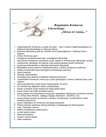 Regulamin Konkursu Literackiego „Słowa też ranią...” 1. Organizatorem Konkursu „Ludzie do ludzi...” jest I Liceum Ogólnokształcące im. Edwarda Dembowskiego w Zielonej Górze. 2. Konkurs skierowany jest do uczniów szkół gimnazjalnych z Zielonej Góry i regionu. 3. Celem Konkursu jest: rozwijanie wyobraźni twórczej i wrażliwości literackiej; stworzenie możliwości wyrażania myśli, sądów w formie prozy literackiej i poezji; zachęcanie młodzieży do pisania oraz prezentowania swoich dokonań; promocja debiutantów w zakresie twórczości literackiej. 4. Nadsyłane prace powinny realizować jedno z dwóch podanych kryteriów: dzieło prozatorskie (bez wymogów konkretnego gatunku) utwór poetycki 5. Zasady uczestnictwa: tematyka prac dotyczy kontaktów interpersonalnych; uczestnikiem Konkursu może być uczeń gimnazjum z terenu Zielonej Góry oraz regionu. praca prozatorska może liczyć maksymalnie 10 stron; nie określa się objętości utworu poetyckiego każdy uczestnik może dostarczyć tylko jeden tekst; praca może mieć tylko jednego autora; prace pisane na komputerze muszą być specjalnie edytowane (czcionka rozmiar 12, Times New Roman, odstępy między wierszami - interlinia 1,5); prace pisane ręcznie muszą być czytelne i przejrzyste, w przeciwnym razie zostaną odrzucone; prace nadesłane do Konkursu nie będą zwracane. 6. Prace powinny zawierać stronę tytułową z następującymi informacjami: imię i nazwisko autora; telefon kontaktowy autora pracy; e-mail autora pracy; klasa gimnazjum; nazwa i adres szkoły; dane opiekuna. 7. Udział w Konkursie jest równoznaczny z wyrażeniem zgody na przetwarzanie przez organizatorów danych osobowych autorów zgodnie z ustawą z dnia 29 września 1997 o ochronie danych osobowych (Dz.U. nr 101 z 2002 r. z późniejszymi zmianami) oraz publikację pracy literackiej, imienia i nazwiska autora oraz nazwy gimnazjum, z którego pochodzi na stronie internetowej I LO. 8. Termin składania prac do 31 marca 2016 roku. 9. Rozstrzygnięcie Konkursu i uroczysta gala rozdania nagród odbędzie się w I Liceum Ogólnokształcącym w Zielonej Górze przy ulicy Kilińskiego 7, dnia 23 kwietnia 2016 roku podczas Dnia Otwartego w I LO. 10. Miejsce składania prac: I Liceum Ogólnokształcące im. Edwarda Dembowskiego w Zielonej Górze ul. Kilińskiego 7, 65-508 Zielona Góra (osobiście lub pocztą – decyduje data stempla pocztowego); poczta elektroniczna [email protected] w temacie: Konkurs Literacki. 11. Oceny prac dokona jury powołane przez organizatorów Konkursu. 12. Nagrody zostaną przyznane w dwóch kategoriach: utwór prozatorski i utwór poetycki. 13. Wykorzystanie nagrodzonych prac i ochrona danych osobowych: uczestnik Konkursu, poprzez udział w nim, wyraża zgodę na nieodpłatne wykorzystywanie przez organizatora zgłoszonych prac z poszanowaniem praw autorskich na cele związane z organizacją, przebiegiem i promocją Konkursu; autorzy zgłaszanych do Konkursu prac udzielają I LO nieodpłatnej i bezterminowej licencji na wykorzystanie prac w celach marketingowych i promocyjnych I LO. 14. Niezgłoszenie się uczestników Konkursu Literackiego na uroczystą galę wręczenia nagród skutkuje przekazaniem nagrody do wykorzystania w następnej edycji Konkursu. 15. Postanowienia końcowe: zgłoszenie do Konkursu jest równoznaczne z przyjęciem warunków Regulaminu; organizator zastrzega sobie prawo do przerwania i odwołania Konkursu; w kwestiach nieuregulowanych Regulaminem stosuje się przepisy Kodeksu Cywilnego; ostateczna interpretacja Regulaminu należy do organizatora; informacji o konkursie udziela: Aneta Napierała ([email protected]). Organizatorzy