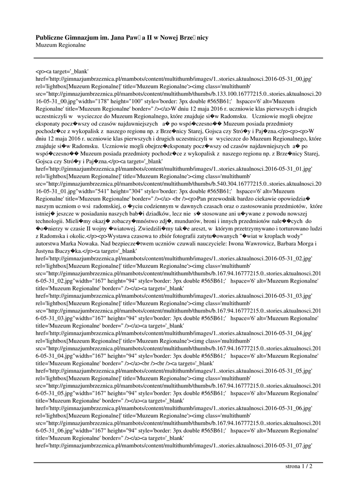Publiczne Gimnazjum im. Jana Paw�a II w Nowej Brze�nicy Muzeum Regionalne <p><a target='_blank' href='http://gimnazjumbrzeznica.pl/mambots/content/multithumb/images/1..stories.aktualnosci.2016-05-31_00.jpg' rel='lightbox[Muzeum Regionalne]' title='Muzeum Regionalne'><img class='multithumb' src="http://gimnazjumbrzeznica.pl/mambots/content/multithumb/thumbs/b.133.100.16777215.0..stories.aktualnosci.20 16-05-31_00.jpg"width="178" height="100" style='border: 3px double #565B61;' hspace='6' alt='Muzeum Regionalne' title='Muzeum Regionalne' border='' /></a>W dniu 12 maja 2016 r. uczniowie klas pierwszych i drugich uczestniczyli w wycieczce do Muzeum Regionalnego, które znajduje si�w Radomsku. Uczniowie mogli obejrze eksponaty pocz�wszy od czasów najdawniejszych a� po wspó�czesno�� Muzeum posiada przedmioty pochodz�ce z wykopalisk z naszego regionu np. z Brze�nicy Starej, Gojsca czy Stró�y i Paj�zna.</p><p><p>W dniu 12 maja 2016 r. uczniowie klas pierwszych i drugich uczestniczyli w wycieczce do Muzeum Regionalnego, które znajduje si�w Radomsku. Uczniowie mogli obejrze�eksponaty pocz�wszy od czasów najdawniejszych a� po wspó�czesno�� Muzeum posiada przedmioty pochodz�ce z wykopalisk z naszego regionu np. z Brze�nicy Starej, Gojsca czy Stró�y i Paj�zna.</p><a target='_blank' href='http://gimnazjumbrzeznica.pl/mambots/content/multithumb/images/1..stories.aktualnosci.2016-05-31_01.jpg' rel='lightbox[Muzeum Regionalne]' title='Muzeum Regionalne'><img class='multithumb' src="http://gimnazjumbrzeznica.pl/mambots/content/multithumb/thumbs/b.540.304.16777215.0..stories.aktualnosci.20 16-05-31_01.jpg"width="541" height="304" style='border: 3px double #565B61;' hspace='6' alt='Muzeum Regionalne' title='Muzeum Regionalne' border='' /></a> <br /><p>Pan przewodnik bardzo ciekawie opowiedzia� naszym uczniom o wsi radomskiej, o �yciu codziennym w dawnych czasach oraz o zastosowaniu przedmiotów, które istniej� jeszcze w posiadaniu naszych bab�i dziadków, lecz nie s� stosowane ani u�ywane z powodu nowszej technologii. Mieli�my okazj� zobaczy�mnóstwo zdj�, mundurów, broni i innych przedmiotów nale��cych do �o�nierzy w czasie II wojny �wiatowej. Zwiedzili�my tak�e areszt, w którym przetrzymywano i torturowano ludzi z Radomska i okolic.</p><p>Wystawa czasowa to zbiór fotografii zatytu�owanych "�wiat w kroplach wody" autorstwa Marka Nowaka. Nad bezpiecze�twem uczniów czuwali nauczyciele: Iwona Wawrowicz, Barbara Morga i Justyna Buczy�ka.</p><a target='_blank' href='http://gimnazjumbrzeznica.pl/mambots/content/multithumb/images/1..stories.aktualnosci.2016-05-31_02.jpg' rel='lightbox[Muzeum Regionalne]' title='Muzeum Regionalne'><img class='multithumb' src="http://gimnazjumbrzeznica.pl/mambots/content/multithumb/thumbs/b.167.94.16777215.0..stories.aktualnosci.201 6-05-31_02.jpg"width="167" height="94" style='border: 3px double #565B61;' hspace='6' alt='Muzeum Regionalne' title='Muzeum Regionalne' border='' /></a><a target='_blank' href='http://gimnazjumbrzeznica.pl/mambots/content/multithumb/images/1..stories.aktualnosci.2016-05-31_03.jpg' rel='lightbox[Muzeum Regionalne]' title='Muzeum Regionalne'><img class='multithumb' src="http://gimnazjumbrzeznica.pl/mambots/content/multithumb/thumbs/b.167.94.16777215.0..stories.aktualnosci.201 6-05-31_03.jpg"width="167" height="94" style='border: 3px double #565B61;' hspace='6' alt='Muzeum Regionalne' title='Muzeum Regionalne' border='' /></a><a target='_blank' href='http://gimnazjumbrzeznica.pl/mambots/content/multithumb/images/1..stories.aktualnosci.2016-05-31_04.jpg' rel='lightbox[Muzeum Regionalne]' title='Muzeum Regionalne'><img class='multithumb' src="http://gimnazjumbrzeznica.pl/mambots/content/multithumb/thumbs/b.167.94.16777215.0..stories.aktualnosci.201 6-05-31_04.jpg"width="167" height="94" style='border: 3px double #565B61;' hspace='6' alt='Muzeum Regionalne' title='Muzeum Regionalne' border='' /></a><br /><br /><a target='_blank' href='http://gimnazjumbrzeznica.pl/mambots/content/multithumb/images/1..stories.aktualnosci.2016-05-31_05.jpg' rel='lightbox[Muzeum Regionalne]' title='Muzeum Regionalne'><img class='multithumb' src="http://gimnazjumbrzeznica.pl/mambots/content/multithumb/thumbs/b.167.94.16777215.0..stories.aktualnosci.201 6-05-31_05.jpg"width="167" height="94" style='border: 3px double #565B61;' hspace='6' alt='Muzeum Regionalne' title='Muzeum Regionalne' border='' /></a><a target='_blank' href='http://gimnazjumbrzeznica.pl/mambots/content/multithumb/images/1..stories.aktualnosci.2016-05-31_06.jpg' rel='lightbox[Muzeum Regionalne]' title='Muzeum Regionalne'><img class='multithumb' src="http://gimnazjumbrzeznica.pl/mambots/content/multithumb/thumbs/b.167.94.16777215.0..stories.aktualnosci.201 6-05-31_06.jpg"width="167" height="94" style='border: 3px double #565B61;' hspace='6' alt='Muzeum Regionalne' title='Muzeum Regionalne' border='' /></a><a target='_blank' href='http://gimnazjumbrzeznica.pl/mambots/content/multithumb/images/1..stories.aktualnosci.2016-05-31_07.jpg' strona 1 / 2 Publiczne Gimnazjum im. Jana Paw�a II w Nowej Brze�nicy Muzeum Regionalne rel='lightbox[Muzeum Regionalne]' title='Muzeum Regionalne'><img class='multithumb' src="http://gimnazjumbrzeznica.pl/mambots/content/multithumb/thumbs/b.167.94.16777215.0..stories.aktualnosci.201 6-05-31_07.jpg"width="167" height="94" style='border: 3px double #565B61;' hspace='6' alt='Muzeum Regionalne' title='Muzeum Regionalne' border='' /></a><br /><br /><a target='_blank' href='http://gimnazjumbrzeznica.pl/mambots/content/multithumb/images/1..stories.aktualnosci.2016-05-31_08.jpg' rel='lightbox[Muzeum Regionalne]' title='Muzeum Regionalne'><img class='multithumb' src="http://gimnazjumbrzeznica.pl/mambots/content/multithumb/thumbs/b.167.94.16777215.0..stories.aktualnosci.201 6-05-31_08.jpg"width="167" height="94" style='border: 3px double #565B61;' hspace='6' alt='Muzeum Regionalne' title='Muze