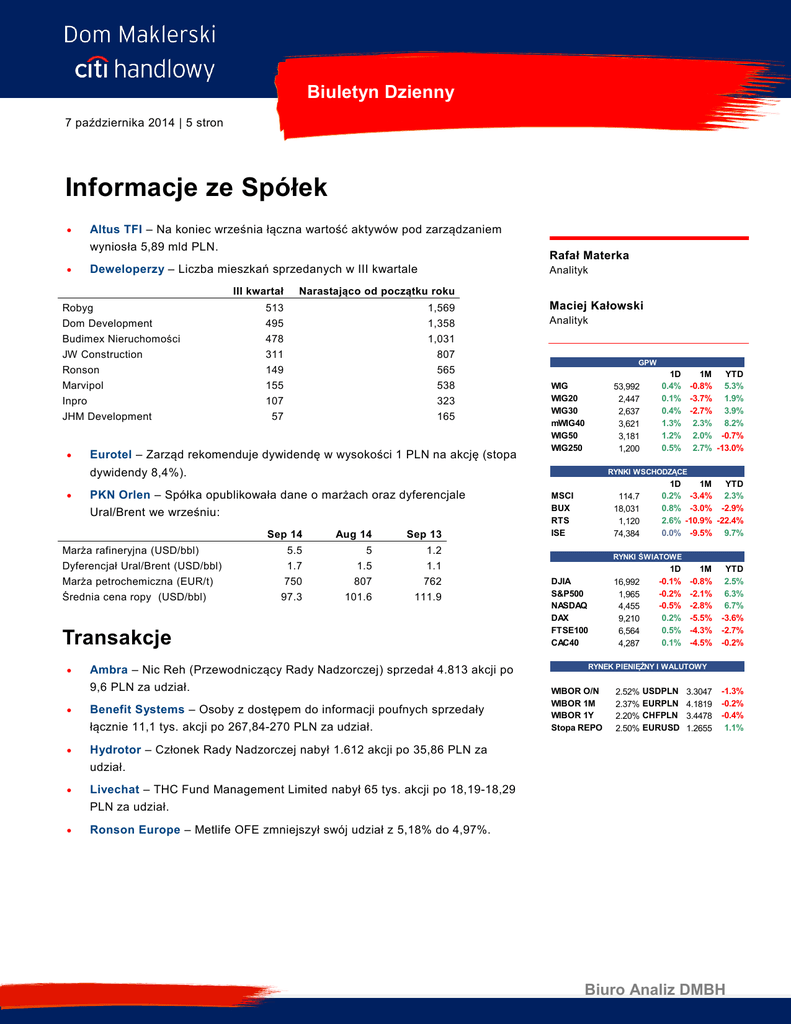 Biuletyn Dzienny 7 października 2014 | 5 stron Informacje ze Spółek Altus TFI – Na koniec września łączna wartość aktywów pod zarządzaniem wyniosła 5,89 mld PLN. Robyg Dom Development Budimex Nieruchomości JW Construction Ronson Marvipol Inpro JHM Development Rafał Materka Deweloperzy – Liczba mieszkań sprzedanych w III kwartale Analityk III kwartał Narastająco od początku roku 513 495 478 311 149 155 107 57 1,569 1,358 1,031 807 565 538 323 165 Eurotel – Zarząd rekomenduje dywidendę w wysokości 1 PLN na akcję (stopa Maciej Kałowski Analityk GPW WIG WIG20 WIG30 mWIG40 WIG50 WIG250 53,992 2,447 2,637 3,621 3,181 1,200 RYNKI WSCHODZĄCE dywidendy 8,4%). PKN Orlen – Spółka opublikowała dane o marżach oraz dyferencjale Ural/Brent we wrześniu: Marża rafineryjna (USD/bbl) Dyferencjał Ural/Brent (USD/bbl) Marża petrochemiczna (EUR/t) Średnia cena ropy (USD/bbl) Sep 14 Aug 14 Sep 13 5.5 1.7 750 97.3 5 1.5 807 101.6 1.2 1.1 762 111.9 Transakcje Ambra – Nic Reh (Przewodniczący Rady Nadzorczej) sprzedał 4.813 akcji po 9,6 PLN za udział. Benefit Systems – Osoby z dostępem do informacji poufnych sprzedały łącznie 11,1 tys. akcji po 267,84-270 PLN za udział. 1D 1M YTD 0.4% -0.8% 5.3% 0.1% -3.7% 1.9% 0.4% -2.7% 3.9% 1.3% 2.3% 8.2% 1.2% 2.0% -0.7% 0.5% 2.7% -13.0% MSCI BUX RTS ISE 114.7 18,031 1,120 74,384 1D 0.2% 0.8% 2.6% 0.0% 1M YTD -3.4% 2.3% -3.0% -2.9% -10.9% -22.4% -9.5% 9.7% RYNKI ŚWIATOWE DJIA S&P500 NASDAQ DAX FTSE100 CAC40 16,992 1,965 4,455 9,210 6,564 4,287 1D -0.1% -0.2% -0.5% 0.2% 0.5% 0.1% 1M -0.8% -2.1% -2.8% -5.5% -4.3% -4.5% YTD 2.5% 6.3% 6.7% -3.6% -2.7% -0.2% RYNEK PIENIĘŻNY I WALUTOWY WIBOR O/N WIBOR 1M WIBOR 1Y Stopa REPO 2.52% 2.37% 2.20% 2.50% USDPLN EURPLN CHFPLN EURUSD 3.3047 4.1819 3.4478 1.2655 -1.3% -0.2% -0.4% 1.1% Hydrotor – Członek Rady Nadzorczej nabył 1.612 akcji po 35,86 PLN za udział. Livechat – THC Fund Management Limited nabył 65 tys. akcji po 18,19-18,29 PLN za udział. Ronson Europe – Metlife OFE zmniejszył swój udział z 5,18% do 4,97%. Biuro Analiz DMBH Biuletyn dzienny 7 października 2014 Kalendarium Spółki ATM Grupa – NWZA ws. zmian w statucie. Betomax – Dzień wypłaty dywidendy wysokości 0,1 PLN na akcję. CDRL – Ostatni dzień zapisów na akcje serii D w transzy dla inwestorów detalicznych. Ferro – NWZA. Genesis Energy – NWZA ws. zmian w Radzie Nadzorczej. PFN – NWZA ws. zmian w Radzie Nadzorczej. Pylon – Ostatni dzień notowania na New Connect 6.617.054 praw do akcji serii G. Unimot – NWZA ws. podwyższenia kapitału, zmian w statucie oraz zmian w Radzie Nadzorczej. Wezwania Aplisens – Spółka ogłosiła ofertę zakupu 713.940 akcji własnych (5,3% głosów na WZA), oferowana cena 14,5 PLN za udział, oferty sprzedaży przyjmowane będą od 13 do 27 października. Duda – Cedrob ogłosił wezwanie do sprzedaży 6.394.051 PKM Duda (23% kapitału akcyjnego), oferowana cena 7,4 PLN za udział. Zamiarem wzywającego jest uzyskanie 32,99% akcji spółki. Zapisy potrwają od 13 października do 4 listopada. Hutmen – Boryszew, SPV Boryszew, Impex-Invest i Impexmetal ogłosiły wezwanie do sprzedaży 8.869.415 akcji Hutmenu (3,65% kapitału akcyjnego), oferowana cena 4,9 PLN za udział. Zapisy potrwają od 15 października do 13 listopada. Celem wzywających jest wycofanie akcji Hutmenu z obrotu na GPW. Mediatel – Hawe ogłosiło wezwanie do sprzedaży 10.180.596 akcji Mediatela, oferowana cena 0,86 PLN za udzi ał. Hawe posiada obecnie 98,4439% udziałów spółki. Zapisy będą prowadzone od 6 października do 4 listopada. Mieszko – Bisantio Investments ogłosił wezwanie do sprzedaży 13,894,506 akcji (34,01% kapitału), oferowana cena 3,69 PLN za udział. Wzywający zamierza uzyskać 100% akcji spółki, nie wyklucza wycofania spółki z obrotu na GPW. Zapisy potrwają od 18 września do 20 października. Netmedia – Spółka ogłosiła skup akcji własnych w wysokości 1,8 mln akcji po cenie 3,6 PLN. Spółka zamierza osiągnąć poziom 3 mln akcji własnych (24,69% kapitałów). Zapisy będą prowadzone w dniach 1-15 października. Biuletyn dzienny 7 października 2014 Wskaźniki Spółek (1) C/Z Spółka C/WK EV/EBITDA Kurs 2014 2015 2016 2014 2015 2016 2014 2015 2016 113.7 16.1 11.4 10.8 1.6 1.4 1.3 6.7 5.6 5.3 136.40 19.9 19.6 16.9 7.0 6.9 6.5 9.5 9.7 8.0 ELECTRICA 12.6 17.0 14.5 12.7 0.8 0.7 0.7 5.4 3.9 3.9 ENEA 16.3 10.7 12.8 17.1 0.6 0.6 0.6 5.3 6.6 7.8 ENERGA 23.89 10.3 10.3 13.2 1.2 1.1 1.1 6.3 6.3 7.0 EUROCASH 32.95 22.2 17.1 14.2 4.5 3.8 3.2 12.4 10.5 9.1 FARMACOL 52.88 11.7 10.9 10.2 1.1 1.0 0.9 7.8 6.7 5.6 GRUPA AZOTY 63.05 35.3 15.1 14.6 1.1 1.0 1.0 10.0 7.0 6.7 202 16.2 14.8 13.0 2.7 2.3 2.0 12.1 11.2 10.0 BOGDANKA BUDIMEX INTERCARS JSW 32.46 -4.1 -3.0 -3.2 0.5 0.6 0.8 27.2 43.5 25.0 KETY 263.70 13.8 13.2 12.6 2.0 1.9 1.8 8.6 8.2 7.8 KGHM 124.40 12.0 8.7 7.9 1.0 1.0 0.9 4.7 4.1 3.7 9350 30.5 25.1 20.3 9.1 7.3 5.8 18.7 15.2 12.4 LPP NEUCA 222.05 13.4 10.7 9.1 2.1 1.8 1.5 9.0 7.2 6.0 CCC 131.2 22.7 17.9 14.5 6.7 5.4 4.4 18.9 15.0 12.5 ORANGE POLSKA 11.25 35.3 36.3 32.5 1.2 1.2 1.3 4.8 5.0 4.9 ORBIS 42.90 22.7 21.0 19.3 1.0 1.0 1.0 8.0 7.5 6.9 PELION 75.49 9.0 8.3 7.8 1.3 1.2 1.1 7.1 6.6 6.1 PGE 20.21 9.2 11.6 11.5 0.8 0.8 0.8 5.1 6.2 6.5 PGNIG 5.06 9.4 13.0 11.8 1.0 0.9 0.9 5.0 5.3 5.0 PKN 41.6 12.7 12.4 8.7 0.7 0.6 0.6 6.0 5.8 4.7 ROVESE 1.4 -118.1 67.8 26.3 0.6 0.6 0.6 8.8 7.8 6.5 TAURON 5.07 6.9 9.6 11.2 0.5 0.5 0.5 4.9 5.8 6.4 30 8.8 11.2 7.8 0.4 0.4 0.4 4.9 5.5 5.3 Kurs 2014 2015 2016 2014 2015 2016 2014 2015 2016 8.77 16.4 14.5 12.9 1.8 1.7 1.6 12% 12% 13% m BANK 487.5 15.4 14.2 12.0 1.9 1.8 1.7 13% 13% 15% BZ WBK 395 16.2 17.0 13.5 2.2 2.0 1.8 15% 12% 14% ING BSK 144.00 16.9 15.6 13.8 1.9 1.9 1.8 12% 12% 13% ALIOR BANK 83.80 18.1 14.9 11.9 2.0 1.8 1.5 12% 13% 14% PEKAO 189.2 18.4 16.9 14.7 2.1 2.1 2.0 11% 12% 14% PKO BP 38.1 15.0 13.7 11.2 1.7 1.6 1.5 12% 12% 14% GETIN NOBLE BANK 2.75 13.4 11.5 10.8 1.4 1.2 1.1 11% 11% 11% GETIN HOLDING 2.79 
