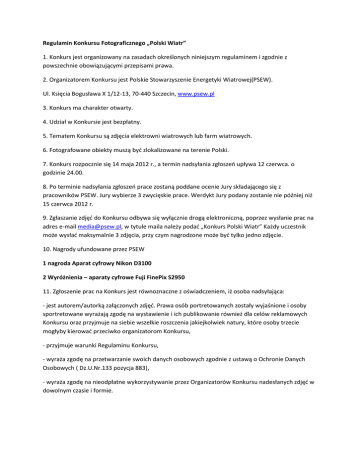 Regulamin Konkursu Fotograficznego „Polski Wiatr” 1. Konkurs jest organizowany na zasadach określonych niniejszym regulaminem i zgodnie z powszechnie obowiązującymi przepisami prawa. 2. Organizatorem Konkursu jest Polskie Stowarzyszenie Energetyki Wiatrowej(PSEW). Ul. Księcia Bogusława X 1/12-13, 70-440 Szczecin, www.psew.pl 3. Konkurs ma charakter otwarty. 4. Udział w Konkursie jest bezpłatny. 5. Tematem Konkursu są zdjęcia elektrowni wiatrowych lub farm wiatrowych. 6. Fotografowane obiekty muszą być zlokalizowane na terenie Polski. 7. Konkurs rozpocznie się 14 maja 2012 r., a termin nadsyłania zgłoszeń upływa 12 czerwca. o godzinie 24.00. 8. Po terminie nadsyłania zgłoszeń prace zostaną poddane ocenie Jury składającego się z pracowników PSEW. Jury wybierze 3 zwycięskie prace. Werdykt Jury podany zostanie nie później niż 15 czerwca 2012 r. 9. Zgłaszanie zdjęć do Konkursu odbywa się wyłącznie drogą elektroniczną, poprzez wysłanie prac na adres e-mail [email protected], w tytule maila należy podać „Konkurs Polski Wiatr” Każdy uczestnik może wysłać maksymalnie 3 zdjęcia, przy czym nagrodzone może być tylko jedno zdjęcie. 10. Nagrody ufundowane przez PSEW 1 nagroda Aparat cyfrowy Nikon D3100 2 Wyróżnienia – aparaty cyfrowe Fuji FinePix S2950 11. Zgłoszenie prac na Konkurs jest równoznaczne z oświadczeniem, iż osoba nadsyłająca: - jest autorem/autorką załączonych zdjęć. Prawa osób portretowanych zostały wyjaśnione i osoby sportretowane wyrażają zgodę na wystawienie i ich publikowanie również dla celów reklamowych Konkursu oraz przyjmuje na siebie wszelkie roszczenia jakiejkolwiek natury, które osoby trzecie mogłyby kierować przeciwko organizatorom Konkursu, - przyjmuje warunki Regulaminu Konkursu, - wyraża zgodę na przetwarzanie swoich danych osobowych zgodnie z ustawą o Ochronie Danych Osobowych ( Dz.U.Nr.133 pozycja 883), - wyraża zgodę na nieodpłatne wykorzystywanie przez Organizatorów Konkursu nadesłanych zdjęć w dowolnym czasie i formie. 12. Organizatorzy zastrzegają sobie prawo do usuwania fotografii o treści powszechnie uznawanej za obraźliwą, naruszającą prawa osób trzecich lub prawo polskie, zawierających treści pornograficzne lub w sposób oczywisty godzące w uczucia religijne. Decyzja o usunięciu takich treści jest niepodważalna i ostateczna. 13. Organizatorzy zastrzegają sobie prawo zmiany postanowień niniejszego Regulaminu w przypadku zmian przepisów prawnych lub innych istotnych zdarzeń mających wpływ na organizowanie Konkursu. 14. Konkurs nie podlega przepisom ustawy z dnia 29 lipca 1992 roku o grach i zakładach wzajemnych (Dz. U. z 2004 roku Nr 4, poz. 27 z późn. zm.). 15. Niniejszy Regulamin wchodzi w życie z dniem rozpoczęcia Konkursu i obowiązuje do czasu jego zakończenia.