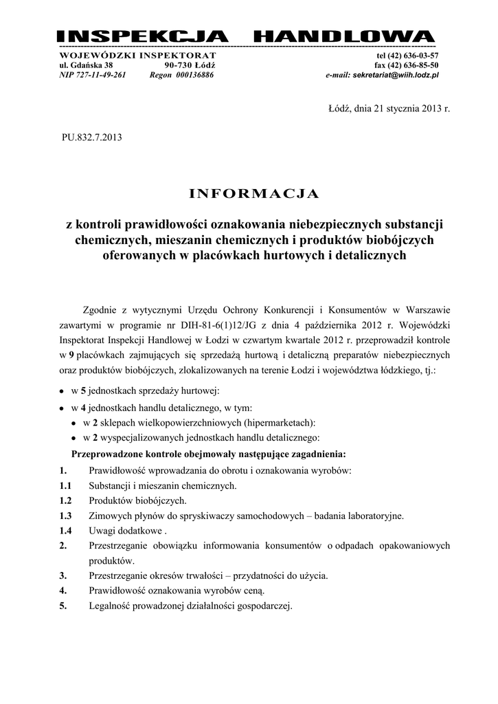 --------------------------------------------------------------------------------------------------------------------------WOJEWÓDZKI INSPEKTORAT ul. Gdańska 38 90-730 Łódź NIP 727-11-49-261 Regon 000136886 tel (42) 636-03-57 fax (42) 636-85-50 e-mail: [email protected] Łódź, dnia 21 stycznia 2013 r. PU.832.7.2013 INF O RM A CJ A z kontroli prawidłowości oznakowania niebezpiecznych substancji chemicznych, mieszanin chemicznych i produktów biobójczych oferowanych w placówkach hurtowych i detalicznych Zgodnie z wytycznymi Urzędu Ochrony Konkurencji i Konsumentów w Warszawie zawartymi w programie nr DIH-81-6(1)12/JG z dnia 4 października 2012 r. Wojewódzki Inspektorat Inspekcji Handlowej w Łodzi w czwartym kwartale 2012 r. przeprowadził kontrole w 9 placówkach zajmujących się sprzedażą hurtową i detaliczną preparatów niebezpiecznych oraz produktów biobójczych, zlokalizowanych na terenie Łodzi i województwa łódzkiego, tj.: w 5 jednostkach sprzedaży hurtowej: w 4 jednostkach handlu detalicznego, w tym: w 2 sklepach wielkopowierzchniowych (hipermarketach): w 2 wyspecjalizowanych jednostkach handlu detalicznego: Przeprowadzone kontrole obejmowały następujące zagadnienia: 1. 1.1 1.2 1.3 1.4 2. 3. 4. 5. Prawidłowość wprowadzania do obrotu i oznakowania wyrobów: Substancji i mieszanin chemicznych. Produktów biobójczych. Zimowych płynów do spryskiwaczy samochodowych – badania laboratoryjne. Uwagi dodatkowe . Przestrzeganie obowiązku informowania konsumentów o odpadach opakowaniowych produktów. Przestrzeganie okresów trwałości – przydatności do użycia. Prawidłowość oznakowania wyrobów ceną. Legalność prowadzonej działalności gospodarczej. Ogółem w 9 placówkach skontrolowano 77 partii produktów w tym 23 partie produktów biobójczych. Ogółem zakwestionowano 1 partię wyrobów z powodu nieprawidłowego oznakowania. Nieprawidłowości stwierdzono w 3 placówkach. Stwierdzone nieprawidłowości polegały na: nieprawidłowym oznakowaniu mieszaniny chemicznej co stanowiło naruszenie art. 20 ust.2 pkt 5 i 6 ustawy z dnia 25 lutego 2011 r. o substancjach chemicznych i ich mieszaninach (Dz. U. nr 63, poz.322 z późn. zm.). braku uwidocznienia dla użytkowników informacji wymaganych przepisami art. 12 ustawy z dnia 11 maja 2001r. o opakowaniach i odpadach opakowaniowych (Dz. U. Nr 63, poz. 638 ze zm.). braku określenia cen jednostkowych na wywieszkach umieszczonych przy towarach co stanowiło naruszenie przepisów określonych w §8 ust. 1 rozporządzenia Ministra Finansów z dnia 10 czerwca 2002 r. w sprawie szczegółowych zasad uwidaczniania cen towarów i usług oraz sposobu oznaczania ceną towarów przeznaczonych do sprzedaży (Dz. U. Nr 99, Poz. 894 ze zm.). USTALENIA KONTROLI 1. Prawidłowość wprowadzania do obrotu i oznakowania wyrobów. Prawidłowość oznakowania opakowań jednostkowych preparatów chemicznych niebezpiecznych oraz produktów biobójczych sprawdzono w oparciu o przepisy: - ustawy z dnia 7 października 1999 r. o języku polskim (Dz. U. Nr 90, poz. 999 ze zm.), - ustawy z dnia 11 stycznia 2001 r. o substancjach i preparatach chemicznych (Dz. U. Nr 11, poz. 84 ze zm.), - ustawy z dnia 2 lipca 2004r. o swobodzie działalności gospodarczej(Dz. U. z 2007 r. Nr 155, poz. 1095 ze zm.), - rozporządzenia Ministra Zdrowia z dnia 5 marca 2009 r. w sprawie oznakowania opakowań substancji niebezpiecznych i preparatów niebezpiecznych (Dz. U. Nr 53, poz. 439), - rozporządzenia (WE) Nr 648/2004 Parlamentu Europejskiego i Rady z dnia 31 marca 2004 r. w sprawie detergentów (Dz. U. UE.L.2004.104.1), - rozporządzenia Komisji (WE)nr 907/2006 z dnia 20 czerwca 2006 r. zmieniającego rozporządzenie (WE) nr 648/2004 Parlamentu Europejskiego i Rady w sprawie detergentów w celu dostosowania jego załączników III i VII (Dz. U. UE.L.2006.168.5), - rozporządzenia Ministra Zdrowia z dnia 29 kwietnia 2010 r. w sprawie rodzajów substancji niebezpiecznych i preparatów niebezpiecznych, których opakowania zaopatruje się w zamknięcie utrudniające otwarcie przez dzieci i wyczuwalne dotykiem ostrzeżenie o niebezpieczeństwie (Dz. U. Nr 83, poz. 544). 2 Ocenie poddano w 9 placówkach 77 partii produktów w tym 23 partie produktów biobójczych, z których 4 partie zostały zaklasyfikowane również jako mieszaniny niebezpieczne 1.1 Substancje i mieszaniny chemiczne A. Obowiązek dokonania wymaganej rejestracji substancji oraz obowiązek dostarczania odbiorcy substancji lub mieszaniny wymaganej karty charakterystyki. Badaniom poddano w 7 kontrolowanych placówkach 54 partie mieszanin niebezpiecznych, w tym 4 partie zostały zaklasyfikowane również jako preparaty biobójcze. W trakcie kontroli ustalono, że dostawcy wszystkich partii mieszanin niebezpiecznych dostarczyli karty charakterystyki tych preparatów, zgodnie z wymaganiami art. 31 ust. 1 pkt a rozporządzenia (WE) Nr 1907/2006 Parlamentu Europejskiego i Rady z dnia 18 grudnia 2006 r. w sprawie rejestracji, oceny, udzielania zezwoleń i stosowanych ograniczeń w zakresie chemikaliów (Dz. U. UE L 396). W przedmiotowych dokumentach podane były informacje dotyczące numeru rejestracji substancji lub informacje o treści: ” Numer rejestracji właściwej: substancje podlegają przepisom okresu przejściowego” B. Prawidłowość oznakowania substancji i mieszanin oraz ich opakowań. W omawianym zakresie w 7 placówkach oceniono 54 partie mieszanin niebezpiecznych, w tym: 50 partii - produktów zaklasyfikowanych do mieszanin niebezpiecznych, 4 partie - produktów spełniających równocześnie kryteria mieszanin niebezpiecznych i produktów biobójczych. Sprawdzono zgodność oznakowania opakowań mieszanin niebezpiecznych z wymaganiami określonymi w: ustawie z dnia 25 lutego 2011 r. o substancjach chemicznych i ich mieszaninach (Dz.U. nr 63, poz. 322 z późn. zm.), rozporządzeniu Ministra Zdrowia z dnia 20 kwietnia 2012 r. w sprawie oznakowania opakowań substancji 