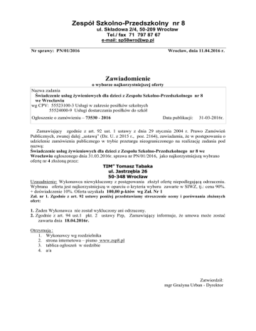 Zespół Szkolno-Przedszkolny nr 8 ul. Składowa 2/4, 50-209 Wrocław Tel./ fax 71 797 87 67 e-mail: [email protected] Wrocław, dnia 11.04.2016 r. Nr sprawy: PN/01/2016 Zawiadomienie o wyborze najkorzystniejszej oferty Nazwa zadania Świadczenie usług żywieniowych dla dzieci z Zespołu Szkolno-Przedszkolnego nr 8 we Wrocławiu wg CPV: 55523100-3 Usługi w zakresie posiłków szkolnych 55524000-9 Usługi dostarczania posiłków do szkół Ogłoszenie o zamówieniu – 73530 - 2016 Data publikacji: 31-03-2016r. Zamawiający zgodnie z art. 92 ust. 1 ustawy z dnia 29 stycznia 2004 r. Prawo Zamówień Publicznych, zwanej dalej „ustawą” (Dz. U. z 2015 r., poz. 2164), zawiadamia, że w postępowaniu o udzielenie zamówienia publicznego w trybie przetargu nieograniczonego na realizację zadania pod nazwą: Świadczenie usług żywieniowych dla dzieci z Zespołu Szkolno-Przedszkolnego nr 8 we Wrocławiu ogłoszonego dnia 31.03.2016r. sprawa nr PN/01/2016, jako najkorzystniejszą wybrano ofertę nr 4 złożoną przez: TIM” Tomasz Tabaka ul. Jastrzębia 26 50-348 Wrocław Uzasadnienie: Wykonawca niewykluczony z postępowania złożył ofertę niepodlegającą odrzuceniu. Wybrana oferta jest najkorzystniejszą w oparciu o kryteria wyboru zawarte w SIWZ, tj.: cena 90%. + doświadczenie 10%. Oferta uzyskała 100,00 p-któw wg Zał. Nr 1 Zał. nr 1. Zgodnie z art. 92 ustawy poniżej przedstawiamy streszczenie oceny i porównania złożonych ofert: 1. Żaden Wykonawca nie został wykluczony ani odrzucony. 2. Zgodnie z art. 94 ust.1 pkt. 2 ustawy Pzp, Zamawiający informuje, że umowa może zostać zawarta dnia 18.04.2016r. Otrzymują : 1. Wykonawcy wg rozdzielnika 2. strona internetowa – pismo www.zsp8.pl 3. tablica ogłoszeń w siedzibie 4. a/a Zatwierdził: mgr Grażyna Urban - Dyrektor Zał. nr 1. Zgodnie z art. 92 ustawy poniżej przedstawiamy streszczenie oceny i porównania złożonych ofert: Nr ofer ty Nazwa firmy (adres) 1 Bogdan Nowacki NBI „Angela” ul. Stalowowolska 19/2, 53-404 Wrocław 2 B&G Catering Marcin Budzisz i Magdalena Budzisz ul. M. Reja 3 50-354 Wrocław 3 Firma „Kasia” Sławomir Grabowski, ul. Traugutta 79/7 50-417 Wrocław 4 TIM” Tomasz Tabaka, ul. Jastrzębia 26, 50-348 Wrocław 5 Catering Horyzonty Smaku s.c. ul. Strzegomska 42K/21 53-611 Wrocław 6 DGP CATERING PARTNER Sp. z o. o. ul. Najświętszej Marii Panny 14, lok. 1 59-220 Legnica Doświadcz enie zawodowe (liczba punktów) max 10 Liczba osób dodatkowo wyznaczo nych do wydawani a posiłków 5 -p Jakość urozmaice nie jadłospisu 15 -p 57,63 8,00 5,00 15,00 85,63 64,84 10,00 0,00 15,00 89,84 68,64 10,00 5,00 15,00 98,64 70,00 10,00 5,00 15,00 100,00 64,44 10,00 5,00 15,00 94,44 Cena (liczba punktów) max 70 62,60 4,00 5,00 15,00 Razem (liczba punktów) 86,60 Uzasadnienie 1. kryterium: A(x) cena –70% Zgodnie ze wzorem w SIWZ: C min L. pkt. A(x) = --------- x 70% C bad gdzie: L pkt – liczba punktów A(x) 1% = 1 pkt, Cmin – cena najniższej oferty, Cbad – cena badanej ofert 2. B(x) kryterium: doświadczenie zawodowe – 10%, gdzie 1% = 1 pkt, Wykonawca, który wykaże największą ilość usług otrzyma maksymalnie 10 pkt. gdzie: każda dodatkowa usługa powyżej 2 to dwa punkty – max jest przy 7 i więcej usługach można uzyskać 10 pkt. 3. Liczba osób dodatkowo wyznaczonych do wydawania posiłków (Cx), C: 5%, gdzie 1 % = 1 pkt. 4. Jakość - urozmaicenie jadłospisu (Dx), D: 15%, gdzie 1 % = 1 pkt. Łączna ocena oferty: Zamawiający uzna za najkorzystniejszą ofertę, która uzyskała najwyższą ilość punktów za sumę wszystkich kryteriów wg wzoru (tj. najwyższą wartość wskaźnika W): W(x) = A(x) + B(x) +C(x)+D(x) gdzie: W(x) – wskaźnik oceny oferty, A(x) – ilość punktów przyznana ofercie „x” za cenę ofertową, B(x) – ilość punktów przyznana ofercie „x” za doświadczenie zawodowe C(x) ilość punktów przyznana ofercie „x” za liczbę osób wyznaczonych do wydawania posiłków D(x) ilość punktów przyznana ofercie „x” za jakość urozmaicenie jadłospisu Do adresatów: a podstawie art. 27 ust. 2 ustawy z dnia 29.01.2004r (tekst jednolity Dz. U. z 2013 r. poz. 907 ze. zm) - Prawo zamówień publicznych, prosimy o przesłanie zwrotnej informacji potwierdzającej otrzymanie niniejszego pisma oraz potwierdzenia, że pismo otrzymaliście Państwo w sposób czytelny, umożliwiający zapoznanie się z jego treścią.