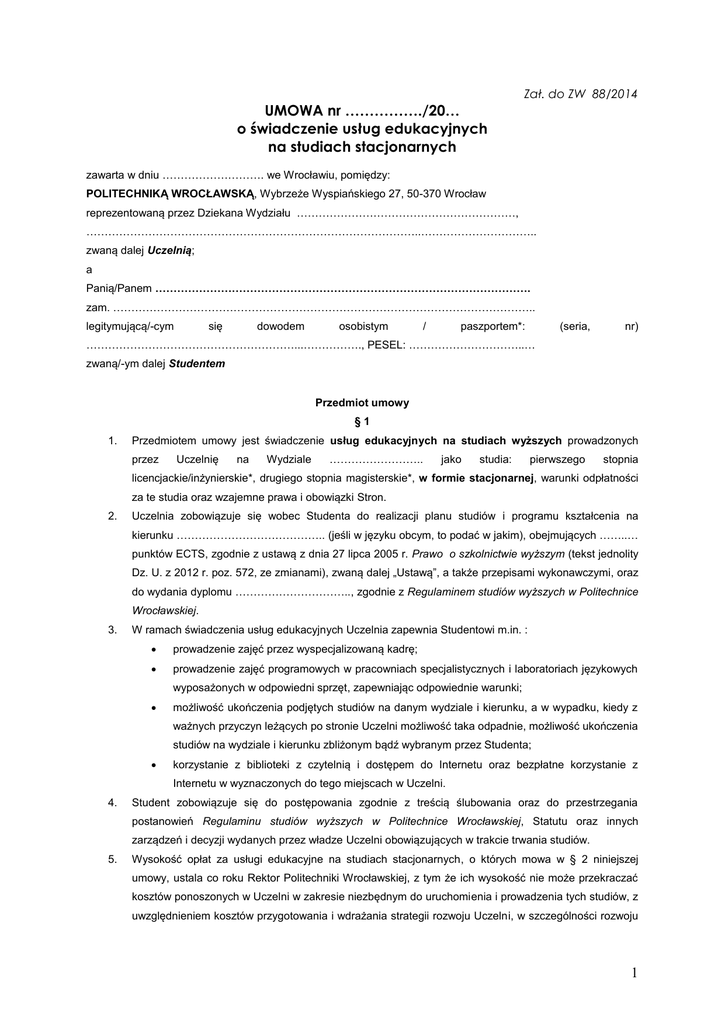 Zał. do ZW 88/2014 UMOWA nr ……………./20… o świadczenie usług edukacyjnych na studiach stacjonarnych zawarta w dniu ………………………. we Wrocławiu, pomiędzy: POLITECHNIKĄ WROCŁAWSKĄ, Wybrzeże Wyspiańskiego 27, 50-370 Wrocław reprezentowaną przez Dziekana Wydziału ……………………………………………………, ………………………………………………………………………………..………………………….. zwaną dalej Uczelnią; a Panią/Panem …………………………………………………………………………………………. zam. …………………………………………………………………………………………………….. legitymującą/-cym się dowodem osobistym / paszportem*: (seria, nr) …………………………………………………...……………., PESEL: …………………………..… zwaną/-ym dalej Studentem Przedmiot umowy §1 1. Przedmiotem umowy jest świadczenie usług edukacyjnych na studiach wyższych prowadzonych przez Uczelnię na Wydziale …………………….. jako studia: pierwszego stopnia licencjackie/inżynierskie*, drugiego stopnia magisterskie*, w formie stacjonarnej, warunki odpłatności za te studia oraz wzajemne prawa i obowiązki Stron. 2. Uczelnia zobowiązuje się wobec Studenta do realizacji planu studiów i programu kształcenia na kierunku ………………………………….. (jeśli w języku obcym, to podać w jakim), obejmujących ……..… punktów ECTS, zgodnie z ustawą z dnia 27 lipca 2005 r. Prawo o szkolnictwie wyższym (tekst jednolity Dz. U. z 2012 r. poz. 572, ze zmianami), zwaną dalej „Ustawą”, a także przepisami wykonawczymi, oraz do wydania dyplomu ………………………….., zgodnie z Regulaminem studiów wyższych w Politechnice Wrocławskiej. 3. W ramach świadczenia usług edukacyjnych Uczelnia zapewnia Studentowi m.in. : prowadzenie zajęć przez wyspecjalizowaną kadrę; prowadzenie zajęć programowych w pracowniach specjalistycznych i laboratoriach językowych wyposażonych w odpowiedni sprzęt, zapewniając odpowiednie warunki; możliwość ukończenia podjętych studiów na danym wydziale i kierunku, a w wypadku, kiedy z ważnych przyczyn leżących po stronie Uczelni możliwość taka odpadnie, możliwość ukończenia studiów na wydziale i kierunku zbliżonym bądź wybranym przez Studenta; korzystanie z biblioteki z czytelnią i dostępem do Internetu oraz bezpłatne korzystanie z Internetu w wyznaczonych do tego miejscach w Uczelni. 4. Student zobowiązuje się do postępowania zgodnie z treścią ślubowania oraz do przestrzegania postanowień Regulaminu studiów wyższych w Politechnice Wrocławskiej, Statutu oraz innych zarządzeń i decyzji wydanych przez władze Uczelni obowiązujących w trakcie trwania studiów. 5. Wysokość opłat za usługi edukacyjne na studiach stacjonarnych, o których mowa w § 2 niniejszej umowy, ustala co roku Rektor Politechniki Wrocławskiej, z tym że ich wysokość nie może przekraczać kosztów ponoszonych w Uczelni w zakresie niezbędnym do uruchomienia i prowadzenia tych studiów, z uwzględnieniem kosztów przygotowania i wdrażania strategii rozwoju Uczelni, w szczególności rozwoju 1 kadr naukowych i infrastruktury dydaktyczno-naukowej, w tym amortyzacji i remontów (art. 99 ust. 2 ustawy Prawo o szkolnictwie wyższym). 6. Student zobowiązuje się wobec Uczelni do terminowego uiszczania opłat za usługi edukacyjne, o których mowa w § 2 ust. 1 niniejszej umowy. Opłaty za usługi edukacyjne §2 1. Uczelnia pobiera a Student zobowiązuje się wnosić opłaty za powtarzanie kursów z powodu niezadowalających wyników w nauce. 2. Student, w miarę wolnych miejsc, ma prawo bez wnoszenia opłaty do kształcenia w ramach zajęć nieobjętych planem studiów, spośród wszystkich kursów realizowanych przez wydziały Politechniki Wrocławskiej albo przez Studium Języków Obcych, Studium Nauk Humanistycznych i Społecznych oraz Studium Wychowania Fizycznego i Sportu. Student może realizować te zajęcia za zgodą Dziekana własnego Wydziału i za zgodą Dziekana Wydziału oferującego kursy nieobjęte planem studiów Studenta albo za zgodą dyrektorów studiów. Student może odpłatnie korzystać z zajęć prowadzonych komercyjnie przez Wydziały, Studium Języków Obcych, Studium Nauk Humanistycznych i Społecznych oraz Studium Wychowania Fizycznego i Sportu. 3. Wysokość opłaty za powtarzanie kursów z powodu niezadowalających wyników w nauce w roku akademickim 2014/2015 wynosi: a) za powtarzanie kursu „projekt inżynierski”, „praca dyplomowa inżynierska/licencjacka”, itp. (na studiach I stopnia) rozumianego jako dzieło 600,00 zł b) za powtarzanie kursu „praca dyplomowa magisterska” (na studiach II stopnia) rozumianego jako dzieło 900,00 zł c) za powtarzanie 1 godziny tygodniowo: wykładu, lektoratu języka obcego 3,50 zł np.za 15 godzin semestralnie 52,50 zł za powtarzanie 1 godziny tygodniowo: ćwiczeń, laboratorium, projektu, seminarium, zajęć sportowych lub innego kursu 4,00 zł np. za 15 godzin semestralnie 60,00 zł W kolejnych latach akademickich wysokość opłat za powtarzanie kursów z powodu niezadowalających d) 4. wyników w nauce będzie wynikać z Zarządzenia Wewnętrznego Rektora i będzie obowiązywała Strony bez konieczności sporządzania aneksu do umowy. 5. Opłata za powtarzanie kursów z powodu niezadowalających wyników w nauce musi być wniesiona przez Studenta w terminie do 31 października w semestrze zimowym roku akademickiego 2014/2015 i do 15 października w kolejnych latach akademickich oraz do 10 marca w semestrze letnim w każdym roku akademickim. 6. Opłata za powtarzanie kursów z powodu niezadowalających wyników w nauce może być rozłożona na 2/4 raty, na podstawie pisemnego uzgodnienia przez Strony, na wniosek Studenta. 7. W przypadku rozłożenia op
