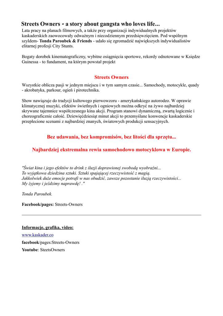 Streets Owners - a story about gangsta who loves life... Lata pracy na planach filmowych, a także przy organizacji indywidualnych projektów kaskaderskich zaowocowały odważnym i niecodziennym przedsięwzięciem. Pod wspólnym szyldem- Tonda Paroubek & Friends - udało się zgromadzić największych indywidualistów elitarnej profesji City Stunts. Bogaty dorobek kinematograficzny, wybitne osiągnięcia sportowe, rekordy odnotowane w Księdze Guinessa - to fundament, na którym powstał projekt Streets Owners Wszystkie oblicza pasji w jednym miejscu i w tym samym czasie... Samochody, motocykle, quady - akrobatyka, parkour, ogień i pirotechnika. Show nawiązuje do tradycji kultowego pierwowzoru - amerykańskiego autorodeo. W oprawie klimatycznej muzyki, efektów świetlnych i ogniowych można odkryć na żywo najbardziej skrywane tajemnice współczesnego kina akcji. Program stanowi dynamiczną, zwartą logicznie i choreograficznie całość. Dziewięćdziesiąt minut akcji to przemyślane konwencje kaskaderskie przeplecione scenami z najbardziej znanych, światowych produkcji sensacyjnych. Bez udawania, bez kompromisów, bez litości dla sprzętu... Najbardziej ekstremalna rewia samochodowo motocyklowa w Europie. "Świat kina i jego efektów to drink z iluzji doprawionej swobodą wyobraźni... To wyjątkowa dziedzina sztuki. Sztuki spajającej rzeczywistość z magią. Jakkolwiek duże emocje potrafi w nas obudzić, zawsze pozostanie iluzją rzeczywistości... My żyjemy i jeździmy naprawdę! ." Tonda Paroubek. Facebook/pages: Streets-Owners Informacje, grafika, video: www.kaskader.co facebook/pages:Streets-Owners Youtube: SteetsOwners