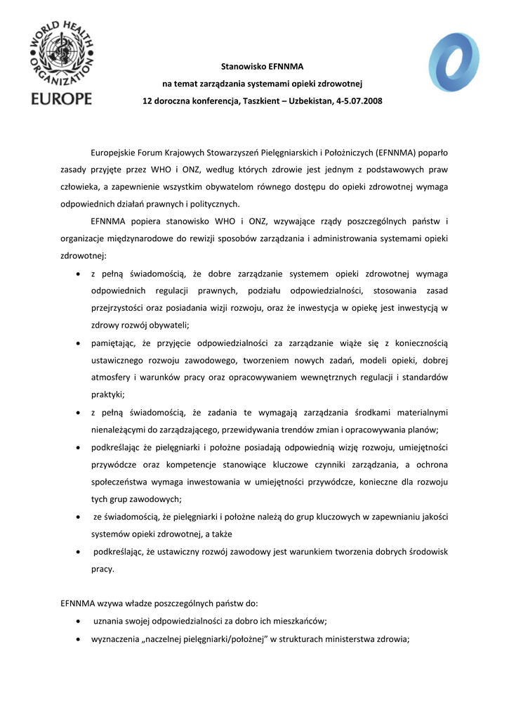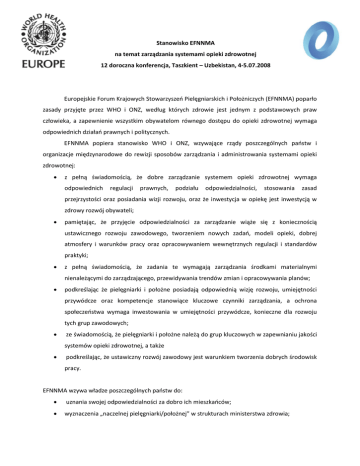 Stanowisko EFNNMA na temat zarządzania systemami opieki zdrowotnej 12 doroczna konferencja, Taszkient – Uzbekistan, 4-5.07.2008 Europejskie Forum Krajowych Stowarzyszeo Pielęgniarskich i Położniczych (EFNNMA) poparło zasady przyjęte przez WHO i ONZ, według których zdrowie jest jednym z podstawowych praw człowieka, a zapewnienie wszystkim obywatelom równego dostępu do opieki zdrowotnej wymaga odpowiednich działao prawnych i politycznych. EFNNMA popiera stanowisko WHO i ONZ, wzywające rządy poszczególnych paostw i organizacje międzynarodowe do rewizji sposobów zarządzania i administrowania systemami opieki zdrowotnej: z pełną świadomością, że dobre zarządzanie systemem opieki zdrowotnej wymaga odpowiednich regulacji prawnych, podziału odpowiedzialności, stosowania zasad przejrzystości oraz posiadania wizji rozwoju, oraz że inwestycja w opiekę jest inwestycją w zdrowy rozwój obywateli; pamiętając, że przyjęcie odpowiedzialności za zarządzanie wiąże się z koniecznością ustawicznego rozwoju zawodowego, tworzeniem nowych zadao, modeli opieki, dobrej atmosfery i warunków pracy oraz opracowywaniem wewnętrznych regulacji i standardów praktyki; z pełną świadomością, że zadania te wymagają zarządzania środkami materialnymi nienależącymi do zarządzającego, przewidywania trendów zmian i opracowywania planów; podkreślając że pielęgniarki i położne posiadają odpowiednią wizję rozwoju, umiejętności przywódcze oraz kompetencje stanowiące kluczowe czynniki zarządzania, a ochrona społeczeostwa wymaga inwestowania w umiejętności przywódcze, konieczne dla rozwoju tych grup zawodowych; ze świadomością, że pielęgniarki i położne należą do grup kluczowych w zapewnianiu jakości systemów opieki zdrowotnej, a także podkreślając, że ustawiczny rozwój zawodowy jest warunkiem tworzenia dobrych środowisk pracy. EFNNMA wzywa władze poszczególnych paostw do: uznania swojej odpowiedzialności za dobro ich mieszkaoców; wyznaczenia „naczelnej pielęgniarki/położnej” w strukturach ministerstwa zdrowia; zajęcia się problemami naboru i zwolnieo odpowiednio wykwalifikowanego personelu opieki zdrowotnej oraz informowania obywateli o ich prawach, odpowiedzialności i obowiązkach w odniesieniu do korzystania z dostępnych usług. EFNNMA wzywa organizacje różnego typu do zajęcia się podstawowymi problemami i wyzwaniami, takimi jak: zrównoważenie wzajemnych wpływów, wchodzenie w koalicje dla potrzeb realizacji podstawowych celów opieki zdrowotnej; wypracowanie jasnych priorytetów politycznych, z uwzględnieniem interesów społecznych; opracowanie odpowiednich regulacji (dotyczących cen usług, wykształcenia i praktyki zawodowej pracowników opieki zdrowotnej – np. poprzez system licencji i akredytacji itd.) oraz budowanie atmosfery wspólnej odpowiedzialności, przestrzeganie zasad (przejrzystośd) – poprzez m.in. ocenę działalności i dostęp do potrzebnych danych. EFNNMA zachęca pielęgniarki i położne do: indywidualnego zaangażowania się w zarządzanie opieką zdrowotną, poprzez udział w kształceniu ustawicznym, proponowanie nowych zadao i modeli opieki, tworzenie pozytywnego środowiska pracy, udział w opracowywaniu regulacji prawnych, przestrzeganie standardów praktyki. „12 doroczna konferencja EFNNMA, Taszkient – Uzbekistan, 4-5.07.2008, Zarządzanie systemami opieki zdrowotnej” Polskie Towarzystwo Pielęgniarskie luty 2010 12 doroczna konferencja EFNNMA, Taszkient – Uzbekistan, 4-5.07.2008 Zarządzanie systemami opieki zdrowotnej Region Europejski WHO uznał, że równośd obywateli w dostępie do ochrony zdrowia i wdrażanie prawa do zdrowia jako jednego z podstawowych praw człowieka według ONZ wymaga realizacji odpowiedniej polityki i podstaw prawnych. Punktem wyjścia działalności WHO w zakresie praw pacjentów jest system podstawowych praw człowieka. (1) Wprowadzenie Termin „zarządzanie/władanie” (ang. stewardship, dosł. posługiwanie, przyjęcie odpowiedzialności za określoną sferę działalności) można definiowad na kilka sposobów, czasami jest on trudny do przetłumaczenia. WHO i ONZ uznały, że poprawa stanu zdrowia ludzkości wymaga od władz paostwowych i organizacji międzynarodowej analizy sposobów zarządzania i administrowania systemami opieki zdrowotnej. Zarządzanie i administrowanie opieką pielęgniarską i położniczą zakłada współpracę władz rządowych, społeczeostwa i wskazanych grup zawodowych w zakresie zapewniania jakości opieki (2). Pielęgniarki i położne odgrywają w tych działaniach kluczową rolę. Zarządzanie/władanie Zarządzanie/władanie – pojęcie szersze niż „regulowanie” realizacji pewnych zadao – może byd definiowane jako pełne troski przyjęcie odpowiedzialności za coś, co zostało powierzone czyjejś opiece. Można je również interpretowad jako dobrą praktykę zarządzania, opartą na otwartości, dzieleniu się informacją, zasadach etycznych. Do zadao takiego zarządzania należy oddziaływanie na te decyzje polityczne i działania (w obrębie wszystkich sektorów), które mogą wpłynąd na stan zdrowia populacji (3). Tak rozumiane zarządzanie wiąże się z możliwością opracowywania strategii politycznej, zapewnieniem dobrych podstaw prawnych, narzędzi ich realizacji, zgromadzenia odpowiednich danych dotyczących funkcjonowania systemu opieki zdrowotnej. Podstawowe problemy i wyzwania to: zrównoważenie wzajemnych wpływów, wchodzenie w koalicje dla potrzeb realizacji podstawowych celów opieki zdrowotnej; wypracowanie jasnych priorytetów politycznych, z uwzględnieniem interesów społecznych; „12 doroczna konferencja EFNNMA, Taszkient – Uzbekistan, 4-5.07.2008, Zarządzanie systemami opieki zdrowotnej” Polskie Towarzystwo Pielęgniarskie luty 2010 opracowanie odpowiednich regulacji (dotyczących cen usług, wykształcenia i praktyki zawodowej pracowników opieki zdrowotnej 