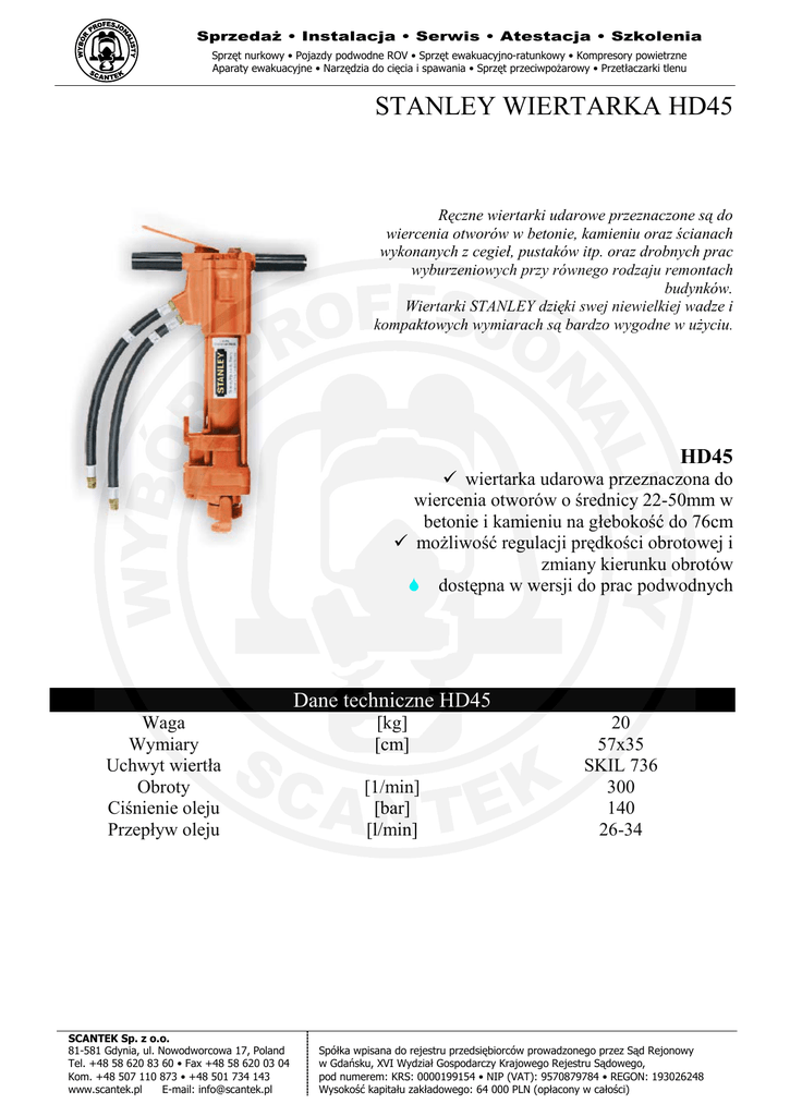 Sprzedaż • Instalacja • Serwis • Atestacja • Szkolenia Sprzęt nurkowy • Pojazdy podwodne ROV • Sprzęt ewakuacyjno-ratunkowy • Kompresory powietrzne Aparaty ewakuacyjne • Narzędzia do cięcia i spawania • Sprzęt przeciwpożarowy • Przetłaczarki tlenu STANLEY WIERTARKA HD45 Ręczne wiertarki udarowe przeznaczone są do wiercenia otworów w betonie, kamieniu oraz ścianach wykonanych z cegieł, pustaków itp. oraz drobnych prac wyburzeniowych przy równego rodzaju remontach budynków. Wiertarki STANLEY dzięki swej niewielkiej wadze i kompaktowych wymiarach są bardzo wygodne w użyciu. HD45 wiertarka udarowa przeznaczona do wiercenia otworów o średnicy 22-50mm w betonie i kamieniu na głebokość do 76cm możliwość regulacji prędkości obrotowej i zmiany kierunku obrotów dostępna w wersji do prac podwodnych Dane techniczne HD45 Waga Wymiary Uchwyt wiertła Obroty Ciśnienie oleju Przepływ oleju SCANTEK Sp. z o.o. 81-581 Gdynia, ul. Nowodworcowa 17, Poland Tel. +48 58 620 83 60 • Fax +48 58 620 03 04 Kom. +48 507 110 873 • +48 501 734 143 www.scantek.pl E-mail: [email protected] [kg] [cm] [1/min] [bar] [l/min] 20 57x35 SKIL 736 300 140 26-34 Spółka wpisana do rejestru przedsiębiorców prowadzonego przez Sąd Rejonowy w Gdańsku, XVI Wydział Gospodarczy Krajowego Rejestru Sądowego, pod numerem: KRS: 0000199154 • NIP (VAT): 9570879784 • REGON: 193026248 Wysokość kapitału zakładowego: 64 000 PLN (opłacony w całości)