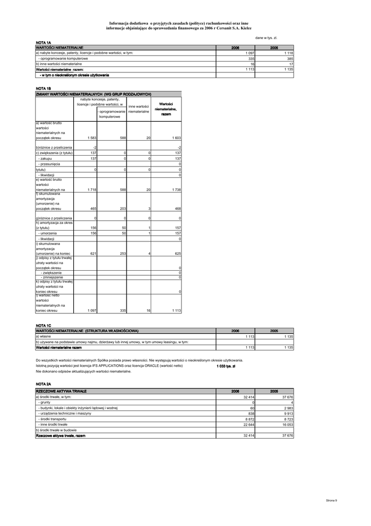 Informacja dodatkowa o przyjętych zasadach (polityce) rachunkowości oraz inne informacje objaśniające do sprawozdania finansowego za 2006 r Cersanit S.A. Kielce dane w tys. zl. NOTA 1A WARTOŚCI NIEMATERIALNE 2006 a) nabyte koncesje, patenty, licencje i podobne wartości, w tym: - oprogramowanie komputerowe b) inne wartości niematerialne Wartości niematerialne razem: 2005 1 097 1 118 335 385 16 1 113 17 1 135 - w tym o nieokreślonym okresie użytkowania NOTA 1B ZMIANY WARTOŚCI NIEMATERIALNYCH (WG GRUP RODZAJOWYCH) nabyte koncesje, patenty, licencje i podobne wartości, w inne wartości - oprogramowanie niematerialne komputerowe a) wartość brutto wartości niematerialnych na początek okresu 1 583 Wartości niematerialne, razem 588 20 1 603 b)różnice z przeliczenia -2 c) zwiększenia (z tytułu) 137 0 0 137 137 0 0 137 0 0 0 0 - zakupu przesunięcia (z d)- zmniejszenia tytułu) - likwidacji e) wartość brutto wartości niematerialnych na f) skumulowana amortyzacja (umorzenie) na początek okresu g)różnice z przeliczenia h) amortyzacja za okres (z tytułu) - umorzenia - likwidacji i) skumulowana amortyzacja (umorzenie) na koniec j) odpisy z tytułu trwałej utraty wartości na początek okresu - zwiększenie - zmniejszenie k) odpisy z tytułu trwałej utraty wartości na koniec okresu l) wartość netto wartości niematerialnych na koniec okresu -2 0 0 1 718 588 20 1 738 465 0 203 3 468 0 0 0 156 50 1 157 156 50 1 157 0 621 253 4 625 0 0 0 0 1 097 335 16 1 113 NOTA 1C WARTOŚCI NIEMATERIALNE (STRUKTURA WŁASNOŚCIOWA) 2006 a) własne 2005 1 113 1 135 1 113 1 135 b) używane na podstawie umowy najmu, dzierżawy lub innej umowy, w tym umowy leasingu, w tym: Wartości niematerialne razem Do wszystkich wartości niematerialnych Spółka posiada prawo własności. Nie występują wartości o nieokreślonym okresie użytkowania. Istotną pozycją wartości jest licencja IFS APPLICATIONS oraz licencja ORACLE (wartość netto) 1 033 tys. zł Nie dokonano odpisów aktualizujących wartości niematerialne. NOTA 2A RZECZOWE AKTYWA TRWAŁE a) środki trwałe, w tym: - grunty - budynki, lokale i obiekty inżynierii lądowej i wodnej - urządzenia techniczne i maszyny 2006 2005 32 414 37 676 0 4 60 2 983 838 9 913 - środki transportu 8 872 8 723 - inne środki trwałe 22 644 16 053 32 414 37 676 b) środki trwałe w budowie Rzeczowe aktywa trwałe, razem Strona 9 Informacja dodatkowa o przyjętych zasadach (polityce) rachunkowości oraz inne informacje objaśniające do sprawozdania finansowego za 2006 r Cersanit S.A. Kielce NOTA 2B ZMIANY ŚRODKÓW TRWAŁYCH (WG GRUP RODZAJOWYCH) - budynki, lokale i obiekty inżynierii lądowej i wodnej - grunty a) wartość brutto środków trwałych na początek okresu 5 - urządzenia techniczne i maszyny 3 466 0 - inne środki trwałe Środki trwałe, razem 15 830 11 489 21 467 52 257 -6 -32 -1 -39 401 1 945 11 858 14 204 401 1 945 11 858 14 204 b)różnice z przeliczenia c) zwiększenia (z tytułu) - środki transportu 0 - zakupu - przemieszczenia d) zmniejszenia (z tytułu) - sprzedaży 0 5 3 361 14 698 431 5 3 361 14 576 431 - likwidacji -różnic kursowych z przeliczenia e) wartość brutto środków trwałych na koniec okresu f) skumulowana amortyzacja (umorzenie) na początek okresu g)różnice z przeliczenia h) amortyzacja za okres (z tytułu) - naliczenia - zmniejszenia z tytułu sprzedaży, likwidacji i) skumulowana amortyzacja (umorzenie) na koniec okresu j) odpisy z tytułu trwałej utraty wartości na początek okresu - zwiększenie - zmniejszenie k) odpisy z tytułu trwałej utraty wartości na koniec okresu l) wartość netto środków trwałych na koniec okresu 12 18 507 18 373 122 12 134 0 105 1 527 12 971 33 312 47 915 1 483 5 917 2 766 5 414 14 581 0 -2 -8 0 -10 -1 -438 73 -5 226 938 1 341 1 635 5 254 5 263 930 7 909 1 511 6 164 294 9 6 979 0 45 689 4 099 10 668 15 501 0 0 0 0 0 60 838 8 872 22 644 32 414 NOTA 2C ŚRODKI TRWAŁE BILANSOWE (STRUKTURA WŁASNOŚCIOWA) 2006 a) własne 2005 32 414 37 676 32 414 37 676 b) używane na podstawie umowy najmu, dzierżawy lub innej umowy, w tym umowy leasingu, w tym: Środki trwałe bilansowe, razem Spółka posiada 25%-owe udziały we współwłasności dwóch środków transportu. Spółka ponosi koszty bezpośrednie związane z użytkowaniem przez siebie ww. środków transportu oraz partycypuje w kosztach ogólnej eksploatacji tych środków w wysokości odpowiadającej posiadanym przez siebie udziałom we współwłasności tych środków. Wartość netto rzeczowych aktywów trwałych zabezpieczających zobowiązania : - aktywa obciążone zastawem rejestrowym na rzecz Raiffeisen Bank Polska S.A.: Kwota zobowiązań z tyt. nabycia rzeczowych aktywów trwałych wynosi : 2 tys. zł 9.090 tys. Zł Kwotę amortyzacji za 2006 r zawiera nota 2B pkt.h.(naliczenia) Nie dokonano odpisów aktualizujących rzeczowe aktywa trwałe. Wykazane w bilansie rzeczowe aktywa trwałe są użytkowane. Wartość brutto środków w pełni zamortyzowanych, nadal używanych wynosi : NOTA 3A NALEŻNOŚCI DŁUGOTERMINOWE 1 114 tys. zł. 2006 2005 a) należności od jednostek powiązanych, w tym: b) od pozostałych jednostek (z tytułu) Należności długoterminowe netto 0 0 0 0 c) odpisy aktualizujące wartość należności Należności długoterminowe brutto NOTA 3B ZMIANA STANU NALEŻNOŚCI DŁUGOTERMINOWYCH (WG TYTUŁÓW) 2006 2005 a) stan na początek okresu b) zwiększenia (z tytułu) c) zmniejszenia (z tytułu) d) stan na koniec okresu 0 0 Strona 10 Informacja dodatkowa o przyjętych zasadach (polityce) rachunkowości oraz inne informacje objaśniające do sprawozdania finansowego za 2006 r Cersanit S.A. Kielce NOTA 3C ZMIANA STANU ODPISÓW AKTUALIZUJĄCYCH WARTOŚĆ NALEŻNOŚCI DŁUGOTERMINOWYCH 2006 2005 Stan na początek okresu a) zwiększenia (z tytułu) b) zmniejszenia (z tytułu) 0 Stan odpisów aktualizujących wartość należności długoterminowych na koniec okresu 0 NOTA 3D NALEŻNOŚCI DŁUGOTERM