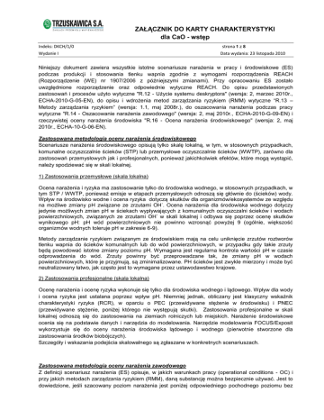 ZAŁĄCZNIK DO KARTY CHARAKTERYSTYKI dla CaO - wstęp Indeks: DKCH/1/0 Wydanie I strona 1 z 8 Data wydania: 23 listopada 2010 Niniejszy dokument zawiera wszystkie istotne scenariusze narażenia w pracy i środowiskowe (ES) podczas produkcji i stosowania tlenku wapnia zgodnie z wymogami rozporządzenia REACH (Rozporządzenie (WE) nr 1907/2006 z późniejszymi zmianami). Przy opracowaniu ES zostało uwzględnione rozporządzenie oraz odpowiednie wytyczne REACH. Do opisu przedstawionych zastosowań i procesów użyto wytyczne "R.12 - Użycie systemu deskryptora" (wersja: 2, marzec 2010r., ECHA-2010-G-05-EN), do opisu i wdrożenia metod zarządzania ryzykiem (RMM) wytyczne “R.13 – Metody zarządzania ryzykiem” (wersja: 1.1, maj 2008r.), do oszacowania narażenia podczas pracy wytyczne "R.14 - Oszacowanie narażenia zawodowego" (wersja: 2, maj 2010r., ECHA-2010-G-09-EN) i rzeczywistej oceny narażenia środowiska "R.16 - Ocena narażenia środowiskowego" (wersja: 2, maj 2010r., ECHA-10-G-06-EN). Zastosowana metodologia oceny narażenia środowiskowego Scenariusze narażenia środowiskowego opisują tylko skalę lokalną, w tym, w stosownych przypadkach, komunalne oczyszczalnie ścieków (STP) lub przemysłowe oczyszczalnie ścieków (WWTP), zarówno dla zastosowań przemysłowych jak i profesjonalnych, ponieważ jakichkolwiek efektów, które mogą wystąpić, należy spodziewać się w skali lokalnej. 1) Zastosowania przemysłowe (skala lokalna) Ocena narażenia i ryzyka ma zastosowanie tylko do środowiska wodnego, w stosownych przypadkach, w tym STP / WWTP, ponieważ emisje w etapach przemysłowych odnoszą się głównie do (ścieków) wody. Wpływ na środowisko wodne i ocena ryzyka dotyczą skutków dla organizmów/ekosystemów ze względu na możliwe zmiany pH związane ze zrzutami OH . Ocena narażenia dla środowiska wodnego dotyczy jedynie możliwych zmian pH w ściekach wypływających z komunalnych oczyszczalni ścieków i wodach powierzchniowych, związanych ze zrzutami OH w skali lokalnej i odbywa się poprzez ocenę skutków wynikowego pH: pH wód powierzchniowych nie powinno wzrosnąć powyżej 9 (ogólnie, większość organizmów wodnych toleruje pH w zakresie 6-9). Metody zarządzanie ryzykiem związanym ze środowiskiem mają na celu uniknięcie zrzutów roztworów tlenku wapnia do ścieków komunalnych lub do wód powierzchniowych, w przypadku gdy takie zrzuty będą powodować istotne zmiany poziomu pH. Wymagana jest regularna kontrola wartości pH w czasie odprowadzenia do wód. Zrzuty powinny być przeprowadzane tak, że zmiany pH w wodach powierzchniowych, które je przyjmują, są zminimalizowane. PH ścieków jest zwykle mierzony i może być neutralizowany łatwo, jak często jest to wymagane przez ustawodawstwo krajowe. 2) Zastosowania profesjonalne (skala lokalna) Ocenę narażenia i ocenę ryzyka wykonuje się tylko dla środowiska wodnego i lądowego. Wpływ dla wody i ocena ryzyka jest ustalana poprzez wpływ pH. Niemniej jednak, obliczany jest klasyczny wskaźnik charakterystyki ryzyka (RCR), w oparciu o PEC (przewidywane stężenie w środowisku) i PNEC (przewidywane stężenie, poniżej którego nie występują skutki). Zastosowania profesjonalne w skali lokalnej odnoszą się do zastosowania na ziemiach rolniczych lub miejskich. Narażenie środowiskowe ocenia się na podstawie danych i narzędzia do modelowania. Narzędzie modelowania FOCUS/Exposit wykorzystuje się do oceny narażenia środowiska lądowego i wodnego (pierwotnie stworzone dla zastosowania środków biobójczych). Szczegóły i wskazania podejścia skalowalnego są zgłaszane w konkretnych scenariuszach. Zastosowana metodologia oceny narażenia zawodowego Z definicji scenariusz narażenia (ES) opisuje, w jakich warunkach pracy (operational conditions - OC) i przy jakich metodach zarządzania ryzykiem (RMM), daną substancję można bezpiecznie używać. Jest to dowiedzione, jeśli szacowany poziom narażenia jest poniżej odpowiedniego pochodnego poziomu bez ZAŁĄCZNIK DO KARTY CHARAKTERYSTYKI dla CaO - wstęp Indeks: DKCH/1/0 Wydanie I strona 2 z 8 Data wydania: 23 listopada 2010 wpływu (DNEL), który wyraża się współczynnikiem charakterystyki ryzyka (RCR). W przypadku pracowników, powtarzająca się dawka DNEL wdychana, jak również ostra DNEL wdychana, opierająca się na odpowiednich zaleceniach Scientific Committee on Occupational Exposure Limits (SCOEL), wynosi 1 mg/m³ i odpowiednio 4 mg/m³. W przypadku, gdy nie były dostępne dane pomierzone, ani analogiczne, narażenie dla ludzi oceniane jest za pomocą narzędzi do modelowania. Na pierwszym poziomie klasyfikacji, stosuje się narzędzie MEASE (http://www.ebrc.de/mease.html) do oceny narażenia przez drogi oddechowe zgodnie z wytycznymi ECHA (R.14). Ponieważ zalecenie SCOEL odnosi się do pyłów respirabilnych, podczas gdy szacunki narażenia w MEASE odzwierciedlają frakcje wdychane, jeśli stosuje się MESEA do oszacowania narażenia, naturalnie zawiera się dodatkowy margines bezpieczeństwa w scenariuszach narażenia poniżej. Zastosowana metodologia oceny narażenia konsumenta Z definicji scenariusz narażenia musi opisać, w jakich warunkach substancje, preparaty lub artykuły można bezpiecznie używać. W przypadku, gdy nie były dostępne dane pomierzone, ani analogiczne, narażenie oceniane jest za pomocą narzędzi do modelowania. W przypadku konsumentów, powtarzająca się dawka DNEL wdychana, jak również ostra DNEL wdychana opierają się na odpowiednich zaleceniach Scientific Committee on Occupational Exposure Limits (SCOEL), i wynoszą 1 mg/m³ i odpowiednio 4 mg/m³. W przypadku narażenia na wdychanie proszków dane pochodzą z van Hemmen (van Hemmen 1992: Bazy danych narażenia na rolnicze pestycydy dla oceny ryzyka. Do wyliczenia narażenia przez drogi oddechowe zastosowano Rev Environ Contam Toxicol. 126: 1-85.). Narażenie przez drogi oddechowe dla konsumentów jest szacowane na 15 μg/h l