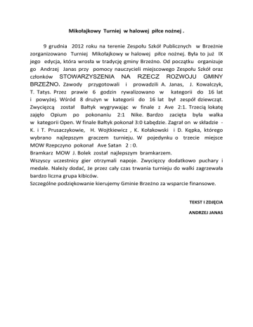 Mikołajkowy Turniej w halowej piłce nożnej . 9 grudnia 2012 roku na terenie Zespołu Szkół Publicznych w Brzeżnie zorganizowano Turniej Mikołajkowy w halowej piłce nożnej. Była to już IX jego edycja, która wrosła w tradycję gminy Brzeżno. Od początku organizuje go Andrzej Janas przy pomocy nauczycieli miejscowego Zespołu Szkół oraz członków STOWARZYSZENIA NA RZECZ ROZWOJU GMINY BRZEŻNO. Zawody przygotowali i prowadzili A. Janas, J. Kowalczyk, T. Tatys. Przez prawie 6 godzin rywalizowano w kategorii do 16 lat i powyżej. Wśród 8 drużyn w kategorii do 16 lat był zespół dziewcząt. Zwycięzcą został Bałtyk wygrywając w finale z Ave 2:1. Trzecią lokatę zajęło Opium po pokonaniu 2:1 Nike. Bardzo zacięta była walka w kategorii Open. W finale Bałtyk pokonał 3:0 Łabędzie. Zagrał on w składzie K. i T. Prusaczykowie, H. Wojtkiewicz , K. Kołakowski i D. Kępka, którego wybrano najlepszym graczem turnieju. W pojedynku o trzecie miejsce MOW Rzepczyno pokonał Ave Satan 2 : 0. Bramkarz MOW J. Bolek został najlepszym bramkarzem. Wszyscy uczestnicy gier otrzymali napoje. Zwycięzcy dodatkowo puchary i medale. Należy dodać, że przez cały czas trwania turnieju do walki zagrzewała bardzo liczna grupa kibiców. Szczególne podziękowanie kierujemy Gminie Brzeżno za wsparcie finansowe. TEKST I ZDJĘCIA ANDRZEJ JANAS