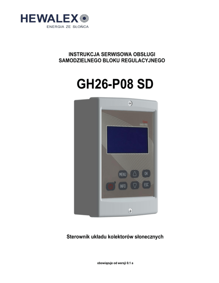 INSTRUKCJA SERWISOWA OBSŁUGI SAMODZIELNEGO BLOKU REGULACYJNEGO GH26-P08 SD Sterownik układu kolektorów słonecznych obowiązuje od wersji 0.1 a Spis treści 1. Opis sterownika ............................................................................................................................................................................................................... 3 2. Podłączenie urządzeń zewnętrznych ............................................................................................................................................................................... 3 3. Uruchomienie i obsługa sterownika................................................................................................................................................................................... 4 3.1. Pierwsze uruchomienie sterownika ........................................................................................................................................................................ 4 3.2. Opis klawiatury (przycisków) sterownika. ............................................................................................................................................................... 4 3.3. Obsługa sterownika............................................................................................................................................................................................... 4 4. Schematy instalacji (Wybór schematu).............................................................................................................................................................................. 5 4.1. Układ grzania CWU – sterowanie pompą kolektorów słonecznych .......................................................................................................................... 5 4.2. Układ grzania CWU – sterowanie pompą kolektorów słonecznych oraz pompą cyrkulacyjną ................................................................................... 5 4.3. Układ grzania CWU – sterowanie pompą kolektorów słonecznych, pompą cyrkulacyjną oraz kotłem ....................................................................... 6 4.4. Układ grzania CWU – sterowanie pompą kolektorów słonecznych, pompą cyrkulacyjną oraz grzałką elektryczną .................................................... 7 4.5. Układ grzania CWU – sterowanie pompą kolektorów słonecznych, pompą cyrkulacyjną oraz pompą ciepła ............................................................. 7 4.6. Układ grzania CWU – sterowanie pompą kolektorów słonecznych, pompą cyrkulacyjną oraz pompą kotła na paliwo stałe ....................................... 7 4.7. Układ dwóch podgrzewaczy – umożliwia dogrzewanie podgrzewacza kotłowego energią słoneczną za pomocą pompy mieszającej ....................... 7 4.8. Układ dwóch podgrzewaczy – umożliwia dogrzewanie podgrzewacza kotłowego energią słoneczną za pomocą powrotu cyrkulacji ......................... 8 4.9. Układ grzania CWU i ogrzewanie wody basenowej za pomocą zaworu trójdrogowego, sterowanie pracą pompy wody basenowej ........................... 8 4.10. Układ grzania CWU i ogrzewanie wody basenowej za pomocą dodatkowej pompy, sterowanie pracą pompy wody basenowej ................................ 8 4.11. Układ grzania dwóch podgrzewaczy za pomocą zaworu trójdrogowego, sterowanie pracą pompy cyrkulacyjnej ...................................................... 9 4.12. Układ grzania dwóch podgrzewaczy za pomocą dodatkowej pompy, sterowanie pracą pompy cyrkulacyjnej ........................................................... 9 4.13. Układ umożliwia współpracę kolektorów z zasobnikiem buforowym wykorzystywanym do współpracy z instalacją CO ............................................. 9 4.14. Układ grzania zasobnika kombinowanego kolektorami słonecznymi, kotłem elektrycznym lub na paliwo płynne i kotłem na paliwo stałe .................. 10 4.15. Układ grzania CWU – sterowanie pracą pomp kolektorów słonecznych umieszczonych na różnych kierunkach ....................................................... 10 4.16. Układ grzania dwóch podgrzewaczy za pomocą zaworu trójdrogowego, sterowanie pracą pomp kolektorów słonecznych umieszczonych na różnych kierunkach ............................................................................................................................................................................................................ 11 4.17. Układ grzania CWU – sterowanie pompą kolektorów słonecznych, pompą cyrkulacyjną oraz układem wychładzania podgrzewacza ........................ 11 5. Ustawienia parametrów (Ustaw. parametrów) ................................................................................................................................................................... 11 5.1. Parametry sterowania (Param. Sterowania) .......................................................................................................................................................... 11 5.2. Program czasowy C .............................................................................................................................................................................................. 11 5.3. Program czasowy K .............................................................................................................................................................................................. 12 5.4. Nośnik ciepła ........................................................................................................................................................................................................ 12 5.5. Przepływ / rotametr ........................................................................................................................