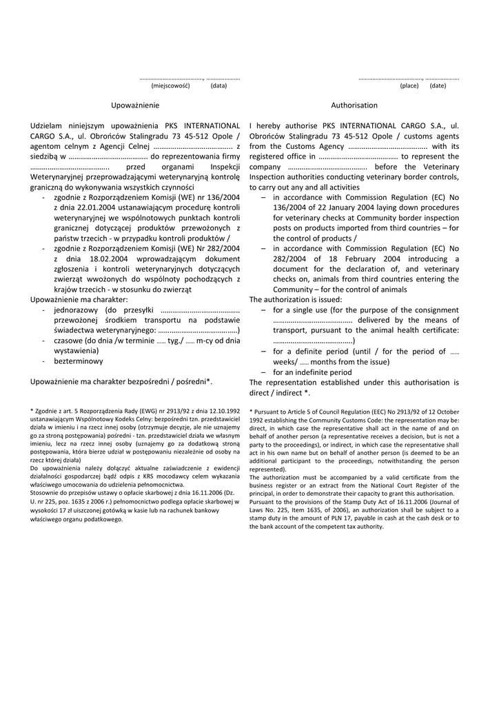 ………………………………….., …………………. (miejscowość) (data) ………………………………….., …………………. (place) (date) Upoważnienie Authorisation Udzielam niniejszym upoważnienia PKS INTERNATIONAL CARGO S.A., ul. Obrońców Stalingradu 73 45-512 Opole / agentom celnym z Agencji Celnej ………………………………….. z siedzibą w ………………………………….. do reprezentowania firmy ………………………………….. przed organami Inspekcji Weterynaryjnej przeprowadzającymi weterynaryjną kontrolę graniczną do wykonywania wszystkich czynności - zgodnie z Rozporządzeniem Komisji (WE) nr 136/2004 z dnia 22.01.2004 ustanawiającym procedurę kontroli weterynaryjnej we wspólnotowych punktach kontroli granicznej dotyczącej produktów przewożonych z państw trzecich - w przypadku kontroli produktów / - zgodnie z Rozporządzeniem Komisji (WE) Nr 282/2004 z dnia 18.02.2004 wprowadzającym dokument zgłoszenia i kontroli weterynaryjnych dotyczących zwierząt wwożonych do wspólnoty pochodzących z krajów trzecich - w stosunku do zwierząt Upoważnienie ma charakter: - jednorazowy (do przesyłki ………………………………….. przewożonej środkiem transportu na podstawie świadectwa weterynaryjnego: …………………………………..) - czasowe (do dnia /w terminie …… tyg./ …… m-cy od dnia wystawienia) - bezterminowy I hereby authorise PKS INTERNATIONAL CARGO S.A., ul. Obrońców Stalingradu 73 45-512 Opole / customs agents from the Customs Agency ………………………………….. with its registered office in ………………………………….. to represent the company ………………………………….. before the Veterinary Inspection authorities conducting veterinary border controls, to carry out any and all activities – in accordance with Commission Regulation (EC) No 136/2004 of 22 January 2004 laying down procedures for veterinary checks at Community border inspection posts on products imported from third countries – for the control of products / – in accordance with Commission Regulation (EC) No 282/2004 of 18 February 2004 introducing a document for the declaration of, and veterinary checks on, animals from third countries entering the Community – for the control of animals The authorization is issued: – for a single use (for the purpose of the consignment ………………………………….. delivered by the means of transport, pursuant to the animal health certificate: …………………………………..) – for a definite period (until / for the period of …… weeks/ …… months from the issue) – for an indefinite period The representation established under this authorisation is direct / indirect *. Upoważnienie ma charakter bezpośredni / pośredni*. * Zgodnie z art. 5 Rozporządzenia Rady (EWG) nr 2913/92 z dnia 12.10.1992 ustanawiającym Wspólnotowy Kodeks Celny: bezpośredni tzn. przedstawiciel działa w imieniu i na rzecz innej osoby (otrzymuje decyzje, ale nie uznajemy go za stroną postępowania) pośredni - tzn. przedstawiciel działa we własnym imieniu, lecz na rzecz innej osoby (uznajemy go za dodatkową stroną postępowania, która bierze udział w postępowaniu niezależnie od osoby na rzecz której działa) Do upoważnienia należy dołączyć aktualne zaświadczenie z ewidencji działalności gospodarczej bądź odpis z KRS mocodawcy celem wykazania właściwego umocowania do udzielenia pełnomocnictwa. Stosownie do przepisów ustawy o opłacie skarbowej z dnia 16.11.2006 (Dz. U. nr 225, poz. 1635 z 2006 r.) pełnomocnictwo podlega opłacie skarbowej w wysokości 17 zł uiszczonej gotówką w kasie lub na rachunek bankowy właściwego organu podatkowego. * Pursuant to Article 5 of Council Regulation (EEC) No 2913/92 of 12 October 1992 establishing the Community Customs Code: the representation may be: direct, in which case the representative shall act in the name of and on behalf of another person (a representative receives a decision, but is not a party to the proceedings), or indirect, in which case the representative shall act in his own name but on behalf of another person (is deemed to be an additional participant to the proceedings, notwithstanding the person represented). The authorization must be accompanied by a valid certificate from the business register or an extract from the National Court Register of the principal, in order to demonstrate their capacity to grant this authorisation. Pursuant to the provisions of the Stamp Duty Act of 16.11.2006 (Journal of Laws No. 225, Item 1635, of 2006), an authorization shall be subject to a stamp duty in the amount of PLN 17, payable in cash at the cash desk or to the bank account of the competent tax authority.