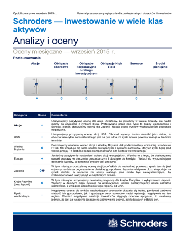 Opublikowany we wrześniu 2015 r. Materiał przeznaczony wyłącznie dla profesjonalnych doradców i inwestorów Schroders — Inwestowanie w wiele klas aktywów Analizy i oceny Oceny miesięczne — wrzesień 2015 r. Podsumowanie Akcje + Kategoria Ocena Obligacje skarbowe Obligacje korporacyjne o ratingu inwestycyjnym Obligacje High Yield Surowce Środki pieniężne 0 0 + 0 – Komentarze Akcje + Utrzymujemy pozytywną ocenę dla akcji. Uważamy, że jesteśmy w trakcie korekty, ale nadal mamy do czynienia z rynkiem byka. Preferowane przez nas rynki to Stany Zjednoczone i Europa, jednak obniżyliśmy ocenę dla Japonii. Nasza ocena rynków wschodzących pozostaje negatywna. USA + Utrzymujemy pozytywną ocenę akcji USA. Chociaż wyceny trudno określić jako niskie, to obecna faza cyklu koniunkturalnego jest na tyle silna, że zyski spółek powinny rosnąć w średnim terminie. Wielka Brytania 0 Pozostajemy neutralni wobec akcji z Wielkiej Brytanii. Jak podkreślaliśmy wcześniej, w indeksie FTSE 100 znajduje się wiele spółek powiązanych z rynkami surowców, których zyski będą pod wielką presją. Ta słabość będzie kompensowana siłą sektora wewnętrznego. Europa + Jesteśmy pozytywnie nastawieni wobec akcji europejskich. Wynika to z tego, że dostrzegamy oznaki poprawy w otoczeniu gospodarczym i dostępie do kredytu. Wskaźniki wyprzedzające delikatnie wzrosły, a dynamika zysków jest znaczna. 0 W tym miesiącu obniżyliśmy ocenę akcji japońskich do neutralnej, ponieważ rynek ten nie jest odporny na dalsze pogorszenie w chińskiej gospodarce. Japonia relatywnie dużo eksportuje na rynek chiński, a wsparcie ze strony słabego jena może być niewystarczające, by zrekompensować słaby popyt w najbliższym czasie. 0 W tym miesiącu utrzymujemy neutralną prognozę dla krajów Pacyfiku, z wyłączeniem Japonii. Wyceny w dalszym ciągu zyskują na atrakcyjności, jednak podtrzymujemy nasze ostrożne stanowisko, z uwagi na uzależnienie tego regionu od Chin. – Negatywna ocena dla rynków wschodzących ponownie okazała się trafna, ponieważ zarówno słabość ich gospodarek, jak i spadające ceny surowców nadal wpływają negatywnie na ten region. Chociaż negatywne nastroje inwestorów sięgnęły obecnie apogeum, to uważamy jednak, że jest za wcześnie jeszcze na zajmowanie pozycji, zakładających odbicie cen. Japonia Kraje Pacyfiku (bez Japonii) Rynki wschodzące Schroders Inwestowanie w wiele klas aktywów Kategoria Ocena Komentarze 0 Nasza ocena obligacji skarbowych nie uległa zmianie. Pozostajemy neutralni wobec ryzyka stopy procentowej, choć dostrzegamy zarówno momentum na rynku, jak i poprawę czynnników jakościowych. W naszej opinii, pomimo wzrostu premii czasowej w pierwszych miesiącach roku, wartość dla obligacji pozostaje na neutralnym poziomie. 0 Oczekiwania inflacyjne w USA spadły jeszcze mocniej, po tym jak Chiny zdewaluowały juana. To uzasadnia naszą neutralną ocenę amerykańskich obligacji skarbowych, pomimo ogólnie silnej gospodarki. Jednak zweryfikowaliśmy naszą ocenę krzywej stóp procentowych. 5-letnie papiery wyglądają na dosyć drogie, ale za to krótki koniec przesunął się wyżej. Wielka Brytania + Jesteśmy nadal pozytywnie nastawieni do obligacji brytyjskich, ponieważ wciąż czerpią one znaczne korzyści z niskich stóp procentowych i luzowania ilościowego w strefie euro. Spread w relacji do bundów wygląda korzystnie, uwzględniając pozytywny wpływ z efektów carry trade jak i roll-down. W dalszym ciągu preferujemy scenariusz wypłaszczenia się krzywej, faworyzując jej długi koniec. Nadal też jesteśmy nastawieni pozytywnie do obligacji 10-letnich. Niemcy + Potencjalne dalsze akcje ze strony EBC mające nadal obniżać rentowności oraz silne euro powinny wspierać 10-letnie obligacje niemieckie. Japonia 0 W tym miesiącu pozostajemy przy naszej neutralnej ocenie ryzyka stopy procentowej w Japonii. Pomimo skrajnie nieatrakcyjnych rentowności, wsparcie ze strony Banku Japonii nadal jest oczekiwane. Obligacje skarbowe USA Obligacje amerykańskie powiązane z inflacją Rynki wschodzące Kategoria – – – – Ocena Amerykańskie obligacje powiązane z inflacją otrzymują ocenę dwóch punktów poniżej zera. Jesteśmy zdania, że silniejszy dolar oraz niższe ceny surowców przyczynią się do obniżenia oczekiwań inflacyjnych w długim terminie. Do dwóch punktów poniżej zera obniżyliśmy ocenę obligacji emerging markets denominowanych w USD. Nasze wskaźniki momentum przełamały kluczowe bariery techniczne, a warunki fundamentalne dalej się pogarszają. W szczególności unikamy największych emitentów - Turcji, Rosji i Brazylii. Komentarze Obligacje korporacyjne na poziomie inwestycyjnym 0 USA 0 Po wielu miesiącach negatywnego nastawienia, podnieśliśmy ocenę obligacji korporacyjnycm o ratingu inwestycyjnym do neutralnej. Spready wzrosły do poziomów powyżej historycznych średnich, co powinno zapewnić zainteresowanie ze strony inwestorów instytucjonalnych. 0 Europejskie obligacje korporacyjne o ratingu inwestycyjnym pozostawały silne w miesiącach letnich. Akomodacyjna polityka monetarna w strefie euro obniża rentowności, jednak dostrzegamy historycznie niskie poziomy wartości odzyskiwalnej. Utrzymujemy zatem naszą ocenę na poziomie neutralnym. Europa Kategoria Ocena Obligacje high yield + USA Europa Komentarze + Podnieśliśmy również ocenę dla papierów High-yield z USA - do pozytywnej. Spready kredytowe wyceniają nadzwyczajne ryzyka, takie jak 40% wskaźnik bankructw w sektorze energetycznym, a odpływy zdają się powoli słabnąć. Papiery USA wyglądają też atrakcyjniej w relacji do europejskich odpowiedników. 0 Nasza ocena w odniesieniu do europejskich obligacji high yield pozostaje neutralna. Wskaźnik niewypłacalności utrzymuje się nisko i najprawdopodobniej nie wzrośnie znacząco, przy założeniu scenariusza, w którym wspierająca polityka monetarna za