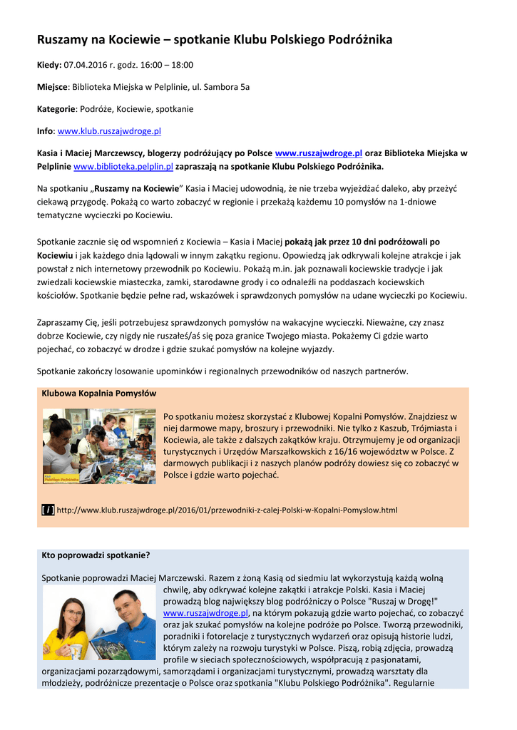 Ruszamy na Kociewie – spotkanie Klubu Polskiego Podróżnika Kiedy: 07.04.2016 r. godz. 16:00 – 18:00 Miejsce: Biblioteka Miejska w Pelplinie, ul. Sambora 5a Kategorie: Podróże, Kociewie, spotkanie Info: www.klub.ruszajwdroge.pl Kasia i Maciej Marczewscy, blogerzy podróżujący po Polsce www.ruszajwdroge.pl oraz Biblioteka Miejska w Pelplinie www.biblioteka.pelplin.pl zapraszają na spotkanie Klubu Polskiego Podróżnika. Na spotkaniu „Ruszamy na Kociewie” Kasia i Maciej udowodnią, że nie trzeba wyjeżdżać daleko, aby przeżyć ciekawą przygodę. Pokażą co warto zobaczyć w regionie i przekażą każdemu 10 pomysłów na 1-dniowe tematyczne wycieczki po Kociewiu. Spotkanie zacznie się od wspomnień z Kociewia – Kasia i Maciej pokażą jak przez 10 dni podróżowali po Kociewiu i jak każdego dnia lądowali w innym zakątku regionu. Opowiedzą jak odkrywali kolejne atrakcje i jak powstał z nich internetowy przewodnik po Kociewiu. Pokażą m.in. jak poznawali kociewskie tradycje i jak zwiedzali kociewskie miasteczka, zamki, starodawne grody i co odnaleźli na poddaszach kociewskich kościołów. Spotkanie będzie pełne rad, wskazówek i sprawdzonych pomysłów na udane wycieczki po Kociewiu. Zapraszamy Cię, jeśli potrzebujesz sprawdzonych pomysłów na wakacyjne wycieczki. Nieważne, czy znasz dobrze Kociewie, czy nigdy nie ruszałeś/aś się poza granice Twojego miasta. Pokażemy Ci gdzie warto pojechać, co zobaczyć w drodze i gdzie szukać pomysłów na kolejne wyjazdy. Spotkanie zakończy losowanie upominków i regionalnych przewodników od naszych partnerów. Klubowa Kopalnia Pomysłów Po spotkaniu możesz skorzystać z Klubowej Kopalni Pomysłów. Znajdziesz w niej darmowe mapy, broszury i przewodniki. Nie tylko z Kaszub, Trójmiasta i Kociewia, ale także z dalszych zakątków kraju. Otrzymujemy je od organizacji turystycznych i Urzędów Marszałkowskich z 16/16 województw w Polsce. Z darmowych publikacji i z naszych planów podróży dowiesz się co zobaczyć w Polsce i gdzie warto pojechać. [ i ] http://www.klub.ruszajwdroge.pl/2016/01/przewodniki-z-calej-Polski-w-Kopalni-Pomyslow.html Kto poprowadzi spotkanie? Spotkanie poprowadzi Maciej Marczewski. Razem z żoną Kasią od siedmiu lat wykorzystują każdą wolną chwilę, aby odkrywać kolejne zakątki i atrakcje Polski. Kasia i Maciej prowadzą blog największy blog podróżniczy o Polsce "Ruszaj w Drogę!" www.ruszajwdroge.pl, na którym pokazują gdzie warto pojechać, co zobaczyć oraz jak szukać pomysłów na kolejne podróże po Polsce. Tworzą przewodniki, poradniki i fotorelacje z turystycznych wydarzeń oraz opisują historie ludzi, którym zależy na rozwoju turystyki w Polsce. Piszą, robią zdjęcia, prowadzą profile w sieciach społecznościowych, współpracują z pasjonatami, organizacjami pozarządowymi, samorządami i organizacjami turystycznymi, prowadzą warsztaty dla młodzieży, podróżnicze prezentacje o Polsce oraz spotkania "Klubu Polskiego Podróżnika". Regularnie opowiadają o swoich podróżach w radiowej audycji "Nie śpij zwiedzaj z Radiem Gdańsk". [ i ] http://www.ruszajwdroge.pl/p/o-nas.html