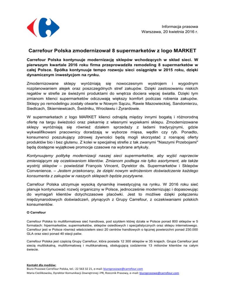 Informacja prasowa Warszawa, 20 kwietnia 2016 r. Carrefour Polska zmodernizował 8 supermarketów z logo MARKET Carrefour Polska kontynuuje modernizację sklepów wchodzących w skład sieci. W pierwszym kwartale 2016 roku firma przeprowadziła remodeling 8 supermarketów w całej Polsce. Spółka kontynuuje tempo rozwoju sieci osiągnięte w 2015 roku, dzięki dynamicznym inwestycjom na rynku. Zmodernizowane sklepy wyróżniają się nowoczesnym wystrojem i wygodnym rozplanowaniem alejek oraz poszczególnych stref zakupów. Dzięki zastosowaniu niskich regałów w strefie ze świeżymi produktami do wnętrza dociera więcej światła. Dzięki tym zmianom klienci supermarketów odczuwają większy komfort podczas robienia zakupów. Sklepy po remodelingu zostały otwarte w Nowym Sączu, Rawie Mazowieckiej, Sandomierzu, Siedlcach, Skierniewicach, Świdniku, Wrocławiu i Żyrardowie. W supermarketach z logo MARKET klienci odnajdą między innymi bogatą i różnorodną ofertę na targu świeżości oraz piekarnię z własnymi wypiekami sklepu. Zmodernizowane sklepy wyróżniają się również działem sprzedaży z ladami tradycyjnymi, gdzie wykwalifikowani pracownicy doradzają w wyborze mięsa, wędlin czy ryb. Ponadto, konsumenci poszukujący zdrowej żywności będą mogli skorzystać z rosnącej oferty produktów bio i bez glutenu. Z kolei w specjalnej strefie z tak zwanymi "Naszymi Przebojami" będą dostępne wyjątkowe promocje czasowe na wybrane artykuły. Kontynuujemy politykę modernizacji naszej sieci supermarketów, aby wyjść naprzeciw zmieniającym się oczekiwaniom klientów. Zmianom podlega nie tylko asortyment, ale także wystrój sklepów – powiedział François Vincent, Dyrektor ds. Supermarketów i Sklepów Convenience. – Jestem przekonany, że dzięki nowym wdrożeniom doświadczenie każdego konsumenta z zakupów w naszych sklepach będzie pozytywne. Carrefour Polska utrzymuje wysoką dynamikę inwestycyjną na rynku. W 2016 roku sieć planuje kontynuować rozwój organiczny w Polsce, jednocześnie modernizując i dopasowując do wymagań klientów dotychczasowe placówki. Jest to możliwe dzięki połączeniu międzynarodowych doświadczeń, płynących z Grupy Carrefour, z oczekiwaniami polskich konsumentów. O Carrefour Carrefour Polska to multiformatowa sieć handlowa, pod szyldem której działa w Polsce ponad 800 sklepów w 5 formatach: hipermarketów, supermarketów, sklepów osiedlowych i specjalistycznych oraz sklepu internetowego. Carrefour jest w Polsce również właścicielem sieci 20 centrów handlowych o łącznej powierzchni ponad 230.000 GLA oraz sieci ponad 40 stacji paliw. Carrefour Polska jest częścią Grupy Carrefour, która posiada 12 300 sklepów w 35 krajach. Grupa Carrefour jest siecią multilokalną, multiformatową i multikanałową, obsługującą codziennie 13 milionów klientów na całym świecie. Kontakt dla mediów: Biuro Prasowe Carrefour Polska, tel.: 22 563 32 21, e-mail: [email protected] Maria Cieślikowska, Dyrektor Komunikacji Zewnętrznej i PR, Rzecznik Prasowy, e-mail: [email protected] Polityka biznesu odpowiedzialnego społecznie Grupy Carrefour opiera się na trzech filarach: zwalczanie wszelkich form marnotrawstwa, ochrona bioróżnorodności oraz wsparcie dla partnerów firmy. Wszyscy pracownicy Carrefour Polska przyczyniają się do realizacji tej polityki poprzez programy: STOP Marnotrawstwu, Z miłości do Zdrowia oraz Różnorodność. Kontakt dla mediów: Biuro Prasowe Carrefour Polska, tel.: 22 563 32 21, e-mail: [email protected] Maria Cieślikowska, Dyrektor Komunikacji Zewnętrznej i PR, Rzecznik Prasowy, e-mail: [email protected]