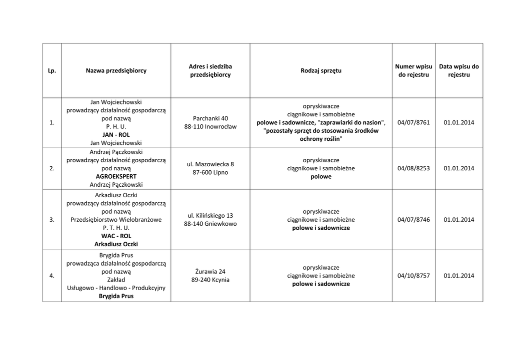 Adres i siedziba przedsiębiorcy Rodzaj sprzętu Parchanki 40 88-110 Inowrocław opryskiwacze ciągnikowe i samobieżne polowe i sadownicze, "zaprawiarki do nasion", "pozostały sprzęt do stosowania środków ochrony roślin" 04/07/8761 01.01.2014 ul. Mazowiecka 8 87-600 Lipno opryskiwacze ciągnikowe i samobieżne polowe 04/08/8253 01.01.2014 3. Arkadiusz Oczki prowadzący działalność gospodarczą pod nazwą Przedsiębiorstwo Wielobranżowe P. T. H. U. WAC - ROL Arkadiusz Oczki ul. Kilińskiego 13 88-140 Gniewkowo opryskiwacze ciągnikowe i samobieżne polowe i sadownicze 04/07/8746 01.01.2014 4. Brygida Prus prowadząca działalność gospodarczą pod nazwą Zakład Usługowo - Handlowo - Produkcyjny Brygida Prus Żurawia 24 89-240 Kcynia opryskiwacze ciągnikowe i samobieżne polowe i sadownicze 04/10/8757 01.01.2014 Lp. 1. 2. Nazwa przedsiębiorcy Jan Wojciechowski prowadzący działalność gospodarczą pod nazwą P. H. U. JAN - ROL Jan Wojciechowski Andrzej Pączkowski prowadzący działalność gospodarczą pod nazwą AGROEKSPERT Andrzej Pączkowski Numer wpisu Data wpisu do do rejestru rejestru 5. 6. 7. Bolesław Prus prowadzący działalność gospodarczą pod nazwą Zakład Usługowo - Handlowy Bolesław Prus Tomasz Kaczmarek prowadzący działalność gospodarczą pod nazwą Stacja Kontroli Opryskiwaczy Tomasz Kaczmarek Przedsiębiorstwo Handlu Sprzętem Rolniczym "AGROMA" Spółka z o. o. Żurawia 24 89-240 Kcynia opryskiwacze ciągnikowe i samobieżne polowe i sadownicze, "zaprawiarki do nasion", "opryskiwacze szklarniowe", "pozostały sprzęt do stosowania środków ochrony roślin" 04/10/8769 01.01.2014 Gawroniec 59/2 86-122 Bukowiec opryskiwacze ciągnikowe i samobieżne polowe i sadownicze, "zaprawiarki do nasion", "opryskiwacze szklarniowe", samobieżny lub ciągnikowy sprzęt przeznaczony do stosowania środków ochrony roślin w formie granulatu, "pozostały sprzęt do stosowania środków ochrony roślin" 04/14/8763 01.01.2014 ul. Bojowników o Wolność i Demokrację 15 89-400 Sępólno Krajeńskie opryskiwacze ciągnikowe i samobieżne polowe i sadownicze, "zaprawiarki do nasion", "opryskiwacze szklarniowe", samobieżny lub ciągnikowy sprzęt przeznaczony do stosowania środków ochrony roślin w formie granulatu, "pozostały sprzęt do stosowania środków ochrony roślin" 04/13/5468 01.01.2014 8. Daniel Ruciński prowadzący działalność gospodarczą pod nazwą Przedsiębiorstwo Handlowo - Usługowe GLOG Łania 3/8 87-851 Boniewo 9. Donata Torba ul. Sikorskiego 11 88-140 Gniewkowo 10. Bartosz Koczorowski prowadzący działalność gospodarczą pod nazwą Stacja Kontroli Opryskiwaczy "EKO - KONTROL" Bartosz Koczorowski ul. Niepodległości 62 A/14 88-100 Inowrocław ul. Nałkowskiej 2 86-100 Świecie 11. Kazimierz Gzella prowadzący działalność gospodarczą pod nazwą Stacja Kontroli Opryskiwaczy Gzella Kazimierz opryskiwacze ciągnikowe i samobieżne polowe i sadownicze, "zaprawiarki do nasion", "opryskiwacze szklarniowe", samobieżny lub ciągnikowy sprzęt przeznaczony do stosowania środków ochrony roślin w formie granulatu, "pozostały sprzęt do stosowania środków ochrony roślin" opryskiwacze ciągnikowe i samobieżne polowe i sadownicze, "zaprawiarki do nasion", "opryskiwacze szklarniowe", "pozostały sprzęt do stosowania środków ochrony roślin" 04/18/8738 01.01.2014 04/07/8744 01.01.2014 opryskiwacze ciągnikowe i samobieżne polowe 04/07/8739 01.01.2014 opryskiwacze ciągnikowe i samobieżne polowe i sadownicze, "zaprawiarki do nasion", "opryskiwacze szklarniowe", samobieżny lub ciągnikowy sprzęt przeznaczony do stosowania środków ochrony roślin w formie granulatu, "pozostały sprzęt do stosowania środków ochrony roślin" 04/14/8765 01.01.2014 12. Jakub Karczewski prowadzący działalność gospodarczą pod nazwą P. U. H. AGROMIX - BIS Karczewski Jakub ul. Polna 24/1 89-115 Mrocza opryskiwacze ciągnikowe i samobieżne polowe, "zaprawiarki do nasion", "opryskiwacze szklarniowe", "pozostały sprzęt do stosowania środków ochrony roślin" 13. Kujawska Fabryka Maszyn Rolniczych Spółka z o. o. ul. Kolejowa 54 87-880 Brześć Kujawski opryskiwacze ciągnikowe i samobieżne polowe i sadownicze 04/18/8760 01.01.2014 14. Andrzej Kukliński prowadzący działalność gospodarczą pod nazwą Ślusarstwo Stacja Kontroli Opryskiwaczy Andrzej Kukliński Bielawy 34 88-430 Janowiec Wielkopolski opryskiwacze ciągnikowe i samobieżne polowe, "zaprawiarki do nasion" 04/19/8745 01.01.2014 15. Jacek Ładziak prowadzący działalność gospodarczą pod nazwą "EKOPRYSK" Jacek Ładziak ul. Kasprowicza 22 88-300 Mogilno opryskiwacze ciągnikowe i samobieżne polowe 04/09/8758 01.01.2014 16. Spółdzielnia Kółek Rolniczych ul. Piekarska 6 87-704 Bądkowo opryskiwacze ciągnikowe i samobieżne polowe i sadownicze, "zaprawiarki do nasion" 04/01/8771 01.01.2014 17. Danuta Jóźwicka prowadząca działalność gospodarczą w ramach spółki cywilnej pod nazwą Techniczna Obsługa Samochodów TOS - SERWIS s. c. Jóźwicka Danuta, Jóźwicka Adriana Pędzewo 44 A gm. Zławieś Wielka opryskiwacze ciągnikowe i samobieżne polowe 04/15/8778 01.01.2014 01.01.2014 18. Adriana Jóźwicka prowadząca działalność gospodarczą w ramach spółki cywilnej pod nazwą Techniczna Obsługa Samochodów TOS - SERWIS s. c. Jóźwicka Danuta, Jóźwicka Adriana Pędzewo 44 A gm. Zławieś Wielka opryskiwacze ciągnikowe i samobieżne polowe 04/15/8774 01.01.2014 19. Spółdzielnia Mleczarska "EKOMLECZ" Świedziebnia 118 A 87-335 Świedziebnia opryskiwacze ciągnikowe i samobieżne polowe 04/02/8115 01.01.2014 20. Karol Spychalski prowadzący działalność gospodarczą pod nazwą P. P. U. H. "ELKAR" Ośrodek Szkolenia Kierowców Karol Spychalski ul. Przemysłowa 1 88-200 Radziejów opryskiwacze ciągnikowe i samobieżne polowe 04/11/8000 01.01.2014 21. Sławomir Karwowski prowadzący działalność gospodarczą pod nazwą Firma Usługowa AGROEKSPERT Sławomir Kar