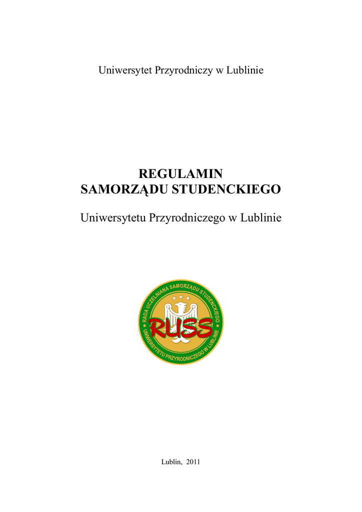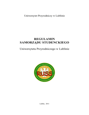 Uniwersytet Przyrodniczy w Lublinie REGULAMIN SAMORZĄDU STUDENCKIEGO Uniwersytetu Przyrodniczego w Lublinie Lublin, 2011 DZIAŁ I PRZEPISY OGÓLNE §1 1. Samorządu Studenckiego Uniwersytetu Przyrodniczego w Lublinie zwany w niniejszym regulaminie „Samorządem” działa na podstawie ustawy z dnia 27 lipca 2005 roku – Prawo o Szkolnictwie Wyższym (Dz. U. nr 164 poz. 1365 z późn. zm.), Statutu Uniwersytetu Przyrodniczego, Regulaminu Studiów Uniwersytetu Przyrodniczego oraz niniejszego Regulaminu. 2. Samorząd działa na Uniwersytecie Przyrodniczym w Lublinie, zwanym w niniejszym regulaminie „UP”. 3. Samorząd jest integralną częścią społeczności akademickiej, którą stanowi UP. §2 1. Samorząd tworzą wszyscy studenci studiów wyższych pierwszego i drugiego stopnia oraz jednolitych studiów magisterskich prowadzonych przez UP. 2. Terenem działalności Samorządu jest UP. 3. Przez teren UP rozumie się także domy studenckie, ośrodki akademickie, kluby studenckie oraz inne instytucje należące do UP. §3 1. Samorząd działa przez swoje organy wyłaniane w drodze demokratycznych wyborów. 2. Organy Samorządu są jedyną, niezależną i demokratyczną reprezentacją ogółu studentów UP. 3. Organy Samorządu są niezależne od wszelkich organów administracji państwowej, partii politycznych i innych organizacji. 4. Organy Samorządu są odpowiedzialne przed Władzami UP, oraz swoimi wyborcami. 5. Organy Samorządu prowadzą na terenie UP działalność w zakresie spraw studenckich, w tym socjalno – bytowych i kulturalnych studentów. §4 1. Mając na uwadze dobro Rzeczypospolitej Polskiej i UP, Samorząd kieruje się zasadami: 1) poszanowania podmiotowości i godności każdego człowieka, 2) wolności myśli, przekonań i słowa, 3) odpowiedzialności każdego studenta za właściwe wywiązywanie się z przyjętych obowiązków, 4) dobrowolności w przyjmowaniu i sprawowaniu funkcji w Samorządzie. §5 1. Samorząd działając przez swoje organy: 1) broni praw i interesów studentów, 2) współdecyduje w sprawach UP, w poprzez uczestnictwo swoich przedstawicieli w organach kolegialnych UP, 3) opiniuje projekty uchwał, zarządzeń i decyzji organów UP dotyczących organizacji i regulaminu studiów, 4) wybiera przedstawicieli studentów do Senatu, Rad Wydziałów, Komisji Dyscyplinarnej, Komisji Odwoławczej Dyscyplinarnej ds. studentów, Komisji Stypendialnej, Odwoławczej Komisji Stypendialnej, 5) współdecyduje w sprawach rozdziału środków przeznaczonych przez organy UP na cele studenckie, 6) współpracuje w sprawach pomocy materialnej dla studentów oraz opiniuje wnioski w sprawach przyznawania nagród za wyniki w nauce, 7) popiera naukowe, kulturalne, turystyczne, gospodarcze, sportowe, charytatywne i inne inicjatywy studentów, 8) zabiega o stworzenie warunków umożliwiających studentom korzystania z prawa do zrzeszania się, 9) wyraża opinie środowiska studenckiego w sprawach związanych z procesem kształcenia i wychowania w szkołach wyższych oraz w innych sprawach istotnych dla środowiska, 10) decyduje w sprawach powierzonych przez władzeUP. 2. Organy Samorządu współdziałają z władzami UP w realizacji jego zadań. §6 1. Samorząd zgodnie z prawem korzysta z: 1) pomieszczeń, urządzeń oraz innych środków materialnych UP niezbędnych do prawidłowej realizacji zadań Samorządu, a w szczególności: pomieszczeń biurowych, klubów studenckich, środków dydaktycznych, sprzętu biurowego, urządzeń łączności i innych niezbędnych dóbr UP, 2) dokumentów i informacji dotyczących spraw studenckich będących w posiadaniu organów UP, 3) wszechstronnej pomocy organów UP i jej administracji. 2. Decyzje organów UP dotyczące środków materialnych i pomieszczeń przeznaczonych wyłącznie na cele studenckie podejmowane są w porozumieniu z właściwymi organami Samorządu. §7 1. Samorząd może w granicach przewidzianych prawem prowadzi działalność kulturalną. 2. Samorząd ma prawo tworzenia i nadzorowania za zgodą Rektora UP agend kulturalnych, sportowych, turystycznych, naukowych, radiowęzłów studenckich, inkubatorów przedsiębiorczości oraz wszelkich instytucji socjalnych przeznaczonych dla studentów. 3. Samorząd ma prawo do powoływania stałych i doraźnych komisji w obrębie swej działalności. 4. Samorząd może ustanawiać stypendia z funduszu będącego w jego wyłącznej dyspozycji. 5. Samorząd przedstawia władzom UP i swoim wyborcom roczne sprawozdanie z działalności opartej na wykorzystaniu środków finansowych i rzeczowych UP oraz funduszu, o którym mowa w § 7 ust.1. w terminie do dnia 30 września każdego roku. DZIAŁ II 1. ORGANY SAMORZĄDU §8 1. Organami Samorządu na szczeblu UP są: 1) Rada Uczelniana Samorządu Studenckiego. 2. Organami Samorządu na szczeblu Wydziału są: 1) Wydziałowe Rady Samorządów Studenckich UP, 3. Organami Samorządu na szczeblu Osiedla Akademickiego jest: 1) Rady Mieszkańców Osiedli Akademickich przy ulicy Langiewicza i przy ulicy Dobrzańskiego. 4. Grupa opiniodawczo – doradcza, w skład której wchodzą: 1) Rada Uczelniana Samorządu Studenckiego UP, 2) Wydziałowe Rady Samorządów Studenckich UP, 3) Przedstawiciele Rady Mieszkańców działających na terenie Domów Studenckich UP, 4) Studenci będący członkami Senatu i Rad Wydziałowych UP, 5) Studenci będący członkami Komisji Dyscyplinarnej i Komisji Odwoławczej Dyscyplinarnej dla studentów UP. 6) Studenci będący członkami Zrzeszenia Studentów Niepełnosprawnych UP §9 Posiedzenia organów Samorządu prowadzą ich Przewodniczący lub ich zastępcy. §10 1. W przypadku, gdy członek Samorządu Studenckiego lub innej organizacji studenckiej działającej na terenie UP złoży egzamin dyplomowy na studiach I stopnia kończących się w semestrze zimowym jego mandat nie wygasa, jednakże ulega on zawieszeniu w pełnieniu funkcji Samorządu Studenckiego lub innej organizacji studenckiej UP d