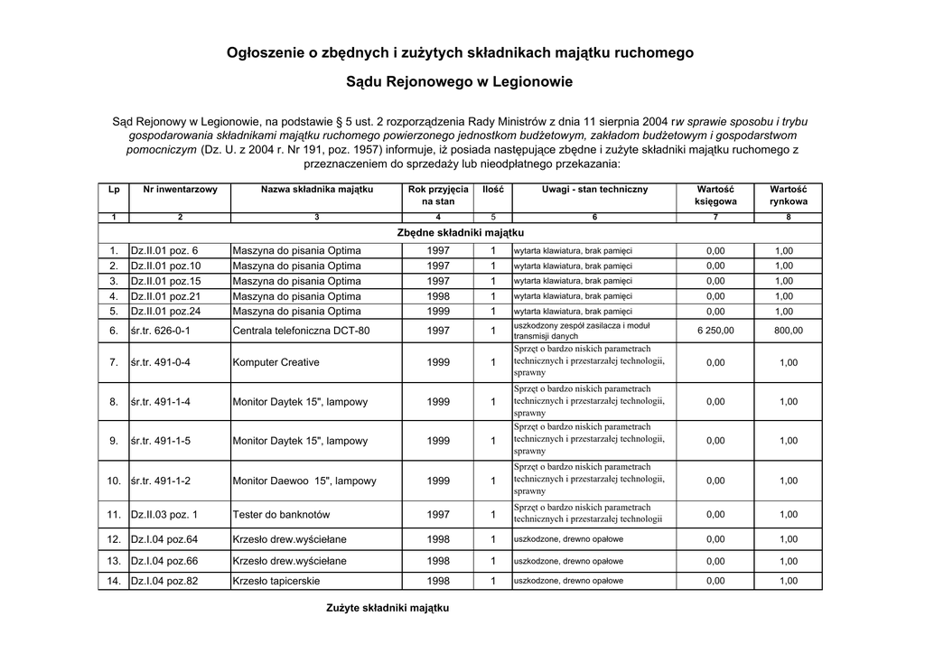 Ogłoszenie o zbędnych i zużytych składnikach majątku ruchomego Sądu Rejonowego w Legionowie Sąd Rejonowy w Legionowie, na podstawie § 5 ust. 2 rozporządzenia Rady Ministrów z dnia 11 sierpnia 2004 r.w sprawie sposobu i trybu gospodarowania składnikami majątku ruchomego powierzonego jednostkom budżetowym, zakładom budżetowym i gospodarstwom pomocniczym (Dz. U. z 2004 r. Nr 191, poz. 1957) informuje, iż posiada następujące zbędne i zużyte składniki majątku ruchomego z przeznaczeniem do sprzedaży lub nieodpłatnego przekazania: Lp Nr inwentarzowy Nazwa składnika majątku 1 2 3 Rok przyjęcia na stan Ilość Uwagi - stan techniczny Wartość księgowa Wartość rynkowa 4 5 6 7 8 Zbędne składniki majątku 1. 2. 3. 4. 5. Dz.II.01 poz. 6 Dz.II.01 poz.10 Dz.II.01 poz.15 Dz.II.01 poz.21 Dz.II.01 poz.24 Maszyna do pisania Optima Maszyna do pisania Optima Maszyna do pisania Optima Maszyna do pisania Optima Maszyna do pisania Optima 1997 1997 1997 1998 1999 1 1 1 1 1 wytarta klawiatura, brak pamięci 0,00 1,00 wytarta klawiatura, brak pamięci 0,00 1,00 wytarta klawiatura, brak pamięci 0,00 1,00 wytarta klawiatura, brak pamięci 0,00 1,00 wytarta klawiatura, brak pamięci 0,00 1,00 6. śr.tr. 626-0-1 Centrala telefoniczna DCT-80 1997 1 uszkodzony zespół zasilacza i moduł transmisji danych 7. śr.tr. 491-0-4 Komputer Creative 1999 1 Sprzęt o bardzo niskich parametrach technicznych i przestarzałej technologii, sprawny 8. śr.tr. 491-1-4 Monitor Daytek 15", lampowy 1999 1 9. śr.tr. 491-1-5 Monitor Daytek 15", lampowy 1999 1 10. śr.tr. 491-1-2 Monitor Daewoo 15", lampowy 1999 1 11. Dz.II.03 poz. 1 Tester do banknotów 1997 12. Dz.I.04 poz.64 Krzesło drew.wyściełane 13. Dz.I.04 poz.66 14. Dz.I.04 poz.82 6 250,00 800,00 0,00 1,00 0,00 1,00 0,00 1,00 Sprzęt o bardzo niskich parametrach technicznych i przestarzałej technologii, sprawny 0,00 1,00 1 Sprzęt o bardzo niskich parametrach technicznych i przestarzałej technologii 0,00 1,00 1998 1 uszkodzone, drewno opałowe 0,00 1,00 Krzesło drew.wyściełane 1998 1 uszkodzone, drewno opałowe 0,00 1,00 Krzesło tapicerskie 1998 1 uszkodzone, drewno opałowe 0,00 1,00 Zużyte składniki majątku Sprzęt o bardzo niskich parametrach technicznych i przestarzałej technologii, sprawny Sprzęt o bardzo niskich parametrach technicznych i przestarzałej technologii, sprawny Lp Nr inwentarzowy 1. Dz.IV.01 poz. 2 2. Dz.IV.01 poz. 28 3. Dz.IV.02 poz. 1-13 4. Dz.IV.01 poz.3-27 Nazwa składnika majątku Telefon komórkowy Alcatel EASY Telefon komórkowy Alcatel One Touch Telefon z interkomem Panasonic KXT3250 Telefon stan.Panasonic Rok przyjęcia na stan Ilość Uwagi - stan techniczny 1998 1 uszkodzony 1,00 1999 1 uszkodzony 1,00 1998 13 uszkodzone klawiatury 1,00 1998 25 wytarte i uszkodzone klawiatury 1,00 Sprzęt o bardzo niskich parametrach technicznych i przestarzałej technologii, niesprawny Sprzęt o bardzo niskich parametrach technicznych i przestarzałej technologii, niesprawny Cena jednostkowa brutto 5. śr.tr. 491-0-26, 491-0-27 Komputer Compaq DP2000 2003 2 6. śr.tr. 491-0-3 Komputer Philips 1999 1 7. Dz.IV.01 poz. 1 Pager Biper 1997 1 uszkodzony 1,00 8. śr.tr. 803-8-3 Frankownica ASCOM HASLER SMILE 1999 1 uszkodz.płyta zasilacza, zużyte rolki obrazowe, bez znaku identyfikacyjnego 1,00 9. śr.tr. 491-3-6 Drukarka Panasonic KX-P 6500 2000 1 uszkodzona 1,00 10. śr.tr. 491-3-2 Drukarka Mita DP-570 1999 1 uszkodzona 1,00 11. śr.tr. 491-3-4 Drukarka OKIPAGE 8P 1999 1 uszkodzona 1,00 12. śr.tr. 491-3-5 Drukarka OKIPAGE 8P 1999 1 uszkodzona 1,00 13. śr.tr. 491-3-9 Drukarka Panasonic KX-P 6500 2000 1 uszkodzona 1,00 14. śr.tr. 491-3-8 Drukarka Panasonic KX-P 6500 2000 1 uszkodzona 1,00 15. Dz.II.01 poz. 1 Maszyna do pisania Optima 1997 1 uszkodzona 1,00 16. Dz.II.01 poz.14 Maszyna do pisania Optima 1997 1 uszkodzona 1,00 17. Dz.II.01 poz.12 Maszyna do pisania Optima 1997 1 uszkodzona 1,00 18. Dz.II.01 poz. 3 Maszyna do pisania Optima 1997 1 uszkodzona 1,00 19. Dz.II.01 poz. 23 Maszyna do pisania Optima 1998 1 uszkodzona 1,00 20. Dz.II.01 poz. 20 Maszyna do pisania Optima 1998 1 uszkodzona 1,00 21. Dz.II.01 poz. 11 Maszyna do pisania Optima 1997 1 uszkodzona 1,00 22. Dz.II.01 poz. 8 Maszyna do pisania Optima 1997 1 uszkodzona 1,00 1,00 1,00 23. Dz.II.01 poz. 9 Maszyna do pisania Optima 1997 1 uszkodzona 1,00 24. Dz.II.01 poz. 18 Maszyna do pisania Optima 1997 1 uszkodzona 1,00 25. Dz.II.01 poz. 4 Maszyna do pisania Optima 1997 1 uszkodzona 1,00 26. Dz.IV.03 poz. 2 Fax Toshiba 1997 1 uszkodzony 1,00 27. Dz.IV.03 poz. 1 Fax Toshiba 1997 1 uszkodzony 1,00 28. Dz.V.02 poz. 5 Czajnik Haden -Libella 1997 1 uszkodzony 1,00 29. Dz.V.02 poz. 6 Czajnik Haden -Libella 1997 1 uszkodzony 1,00 30. Dz.V.02 poz. 7 Czajnik Haden -Libella 1997 1 uszkodzony 1,00 31. Dz.V.02 poz. 8 Czajnik Haden -Libella 1997 1 uszkodzony 1,00 32. Dz.V.02 poz. 28 Czajnik Voltaire 1998 1 uszkodzony 1,00 33. Dz.V.02 poz. 31 Czajnik Voltaire 1998 1 uszkodzony 1,00 34. Dz.V.02 poz. 16 Czajnik Voltaire 1998 1 uszkodzony 1,00 35. Dz.V.02 poz. 20 Czajnik Voltaire 1998 1 uszkodzony 1,00 36. Dz.V.02 poz. 24 Czajnik Voltaire 1998 1 uszkodzony 1,00 37. Dz.V.02 poz. 25 Czajnik Voltaire 1998 1 uszkodzony 1,00 38. Dz.V.02 poz. 26 Czajnik Voltaire 1998 1 uszkodzony 1,00 39. Dz.V.02 poz. 14 Czajnik Voltaire 1998 1 uszkodzony 1,00 40. Dz.V.02 poz. 17 Czajnik Voltaire 1998 1 uszkodzony 1,00 41. Dz.V.02 poz. 15 Dz.V.02 poz.44,47, 42. 49-59 43. Dz.V.02 poz. 35 Czajnik Voltaire 1998 1 uszkodzony 1,00 Czajnik Bolero 2004 13 uszkodzony 1,00 Czajnik bezprzewodowy 1999 1 uszkodzony 1,00 1,00 44. Dz.V.03 poz. 1 Odkurzacz Europa 101-LAND 1998 1 uszkodzony, brak części wymiennych na rynku 45. Dz.V.06 poz.11 Zegar Adler 1999 1 uszkodzony 1,00 46. Dz.V.11 poz. 6,7 Dz.V.11 poz. 47. 9,10,11,13,14,18 48. Dz.V.11 poz. 29 Wentylator 612 Major 1998 2 uszkodzony 1,00 Wentylator VS 6611 1998 6 uszkodzony 1,00 Wentylator VS 6220 1999 1 uszkodzony 1,00 49. Dz.II.02 poz. 3 Kalkulator Citizen Cx1