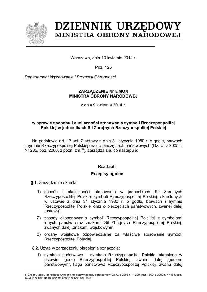 Warszawa, dnia 10 kwietnia 2014 r. Poz. 125 Departament Wychowania i Promocji Obronności ZARZĄDZENIE Nr 5/MON MINISTRA OBRONY NARODOWEJ z dnia 9 kwietnia 2014 r. w sprawie sposobu i okoliczności stosowania symboli Rzeczypospolitej Polskiej w jednostkach Sił Zbrojnych Rzeczypospolitej Polskiej Na podstawie art. 17 ust. 2 ustawy z dnia 31 stycznia 1980 r. o godle, barwach i hymnie Rzeczypospolitej Polskiej oraz o pieczęciach państwowych (Dz. U. z 2005 r. Nr 235, poz. 2000, z późn. zm.1)), zarządza się, co następuje: Rozdział I Przepisy ogólne § 1. Zarządzenie określa: 1) sposób i okoliczności stosowania w jednostkach Sił Zbrojnych Rzeczypospolitej Polskiej symboli Rzeczypospolitej Polskiej, określonych w ustawie z dnia 31 stycznia 1980 r. o godle, barwach i hymnie Rzeczypospolitej Polskiej oraz o pieczęciach państwowych, zwanej dalej „ustawą”; 2) zasady eksponowania symboli Rzeczypospolitej Polskiej z symbolami innych państw oraz znakami Sił Zbrojnych Rzeczypospolitej Polskiej, zwanych dalej „znakami wojskowymi”; 3) organy wojskowe odpowiedzialne za właściwe stosowanie symboli Rzeczypospolitej Polskiej. § 2. Użyte w zarządzeniu określenia oznaczają: 1) symbole państwowe – symbole Rzeczypospolitej Polskiej określone w ustawie: godło Rzeczypospolitej Polskiej, zwane dalej „godłem państwowym”, flaga państwowa Rzeczypospolitej Polskiej, zwana dalej 1) Zmiany tekstu jednolitego wymienionej ustawy zostały ogłoszone w Dz. U. z 2006 r. Nr 220, poz. 1600, z 2009 r. Nr 168, poz. 1323, z 2010 r. Nr 18, poz. 96 oraz z 2012 r. poz. 490. „flagą państwową”, flaga państwowa z godłem Rzeczypospolitej Polskiej, zwana dalej „flagą państwową z godłem”, barwy biało-czerwone oraz hymn państwowy Rzeczypospolitej Polskiej, zwany dalej „hymnem państwowym”; 2) jednostka – jednostkę wojskową w rozumieniu ustawy z dnia 21 listopada 1967 r. o powszechnym obowiązku obrony Rzeczypospolitej Polskiej (Dz. U. z 2012 r. poz. 461, z późn. zm.2)) oraz ustawy z dnia 17 grudnia 1998 r. o zasadach użycia lub pobytu Sił Zbrojnych Rzeczypospolitej Polskiej poza granicami państwa (Dz. U. Nr 162, poz. 1117, z późn. zm.3)), a także inną jednostkę organizacyjną podległą Ministrowi Obrony Narodowej lub przez niego nadzorowaną oraz komórkę organizacyjną Ministerstwa Obrony Narodowej; 3) dowódca jednostki – dowódcę, dyrektora, szefa, komendanta lub inną osobę na równorzędnym stanowisku służbowym, kierującą jednostką; 4) uroczystości – uroczystości państwowe, wojskowe oraz o charakterze, patriotycznym, patriotyczno-religijnym lub religijnym, organizowane z udziałem wojskowej asysty honorowej; 5) ceremoniał wojskowy lub regulamin musztry – obowiązujące przepisy w sprawie zasad i form organizowania uroczystości z udziałem żołnierzy oraz wystąpień służbowych żołnierzy i pododdziałów wojskowych zawarte w „Ceremoniale Wojskowym Sił Zbrojnych Rzeczypospolitej Polskiej” oraz „Regulaminie musztry Sił Zbrojnych Rzeczypospolitej Polskiej”; 6) przepisy ubiorcze – przepisy wydane na podstawie art. 137a ust. 4 ustawy z dnia 11 września 2003 r. o służbie wojskowej żołnierzy zawodowych (Dz. U. z 2010 r. Nr 90, poz. 593, z późn. zm.4)); 7) regulamin ogólny – obowiązujące przepisy regulujące wewnętrzną działalność Sił Zbrojnych Rzeczypospolitej Polskiej, odnoszące się do podstawowych dziedzin ich funkcjonowania zawarte w „Regulaminie ogólnym Sił Zbrojnych Rzeczypospolitej Polskiej” . § 4. 1. W jednostkach stacjonujących na terytorium państwa symbole państwowe mają pierwszeństwo przed innymi symbolami i znakami. 2. W jednostkach stacjonujących poza granicami państwa oraz w wyjątkowych wypadkach, wynikających z zasad protokołu dyplomatycznego w kontaktach międzynarodowych, na terytorium państwa – pierwszeństwo przed symbolami państwowymi mogą mieć symbole innych państw i organizacji międzynarodowych. 3. Symbole innych państw i organizacji międzynarodowych w jednostkach traktuje się z takim samym szacunkiem, jak symbole państwowe. § 5. 1. Symbole państwowe stosowane w jednostkach muszą być zgodne ze wzorem określonym w ustawie. 2) Zmiany tekstu jednolitego wymienionej ustawy zostały ogłoszone w Dz. U. z 2012 r. poz. 1101, 1407 i 1445 oraz z 2013 r. poz. 852 i 1355. 3) Zmiany wymienionej ustawy zostały ogłoszone w Dz. U. z 2004 r. Nr 210, poz. 2135, z 2009 r. Nr 79, poz. 669 i Nr 161, poz. 1278, z 2010 r. Nr 240, poz. 1601, z 2011 r. Nr 205, poz. 1203 oraz z 2012 r. poz. 908. 4) Zmiany tekstu jednolitego wymienionej ustawy zostały ogłoszone w Dz. U. z 2010 r. Nr 107, poz. 679, Nr 113, poz. 745, Nr 127, poz. 857, Nr 182, poz. 1228 i Nr 238, poz. 1578, z 2011 r. Nr 22, poz. 114, Nr 112, poz. 654, Nr 122, poz. 696, Nr 171, poz. 1016 i Nr 236, poz. 1396 oraz z 2013 r. poz. 675, 829, 852 i 1355. 2. Poza symbolami państwowymi zgodnymi z ustawą dopuszcza się używanie ich wizerunków artystycznie przetworzonych, z tym że wizerunki te: 1) nie mogą ujmować godności symboli państwowych; 2) nie mogą być umieszczane w miejscach przewidzianych do eksponowania symboli państwowych określonych w ustawie. § 6. 1. Symbole państwowe w jednostkach: 1) w razie wycofania z użytku powinny być zniszczone w sposób godny, po uprzednim pozbawieniu ich cech używalności; 2) posiadające wartość historyczną, upamiętniającą wydarzenia mające szczególne znaczenie dla państwa lub Sił Zbrojnych Rzeczypospolitej Polskiej, powinny być przekazane do wojskowej placówki muzealnej lub sali tradycji jednostki. 2. Dowódca jednostki: 1) w ramach posiadanych środków budżetowych, stosownie do potrzeb, zapewni zaopatrzenie jednostki w niezbędną liczbę symboli państwowych; 2) jest odpowiedzialny za właściwy i godny sposób stosowania symboli państwowych w jednostce, a w szczególności za: a) kontrolę właściwego sposobu umieszczania godła państwowego,
