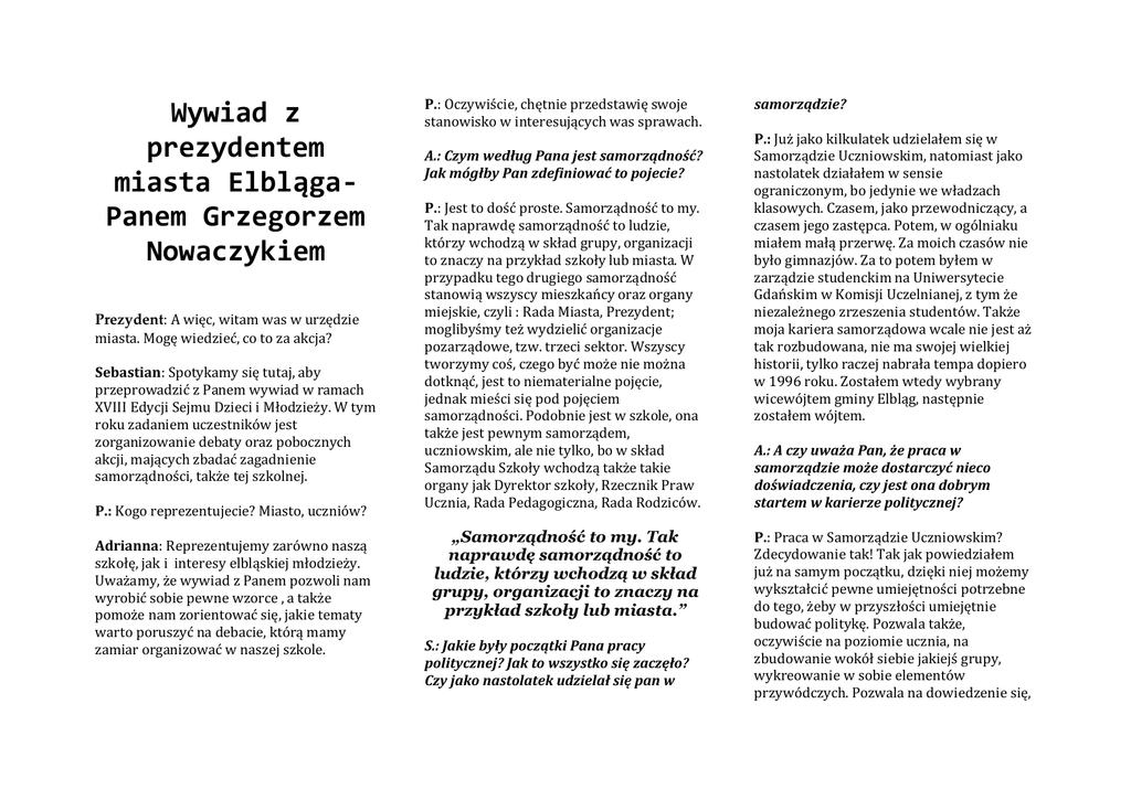Wywiad z prezydentem miasta ElblągaPanem Grzegorzem Nowaczykiem Prezydent: A więc, witam was w urzędzie miasta. Mogę wiedzieć, co to za akcja? Sebastian: Spotykamy się tutaj, aby przeprowadzić z Panem wywiad w ramach XVIII Edycji Sejmu Dzieci i Młodzieży. W tym roku zadaniem uczestników jest zorganizowanie debaty oraz pobocznych akcji, mających zbadać zagadnienie samorządności, także tej szkolnej. P.: Kogo reprezentujecie? Miasto, uczniów? Adrianna: Reprezentujemy zarówno naszą szkołę, jak i interesy elbląskiej młodzieży. Uważamy, że wywiad z Panem pozwoli nam wyrobić sobie pewne wzorce , a także pomoże nam zorientować się, jakie tematy warto poruszyć na debacie, którą mamy zamiar organizować w naszej szkole. P.: Oczywiście, chętnie przedstawię swoje stanowisko w interesujących was sprawach. A.: Czym według Pana jest samorządność? Jak mógłby Pan zdefiniować to pojecie? P.: Jest to dość proste. Samorządność to my. Tak naprawdę samorządność to ludzie, którzy wchodzą w skład grupy, organizacji to znaczy na przykład szkoły lub miasta. W przypadku tego drugiego samorządność stanowią wszyscy mieszkańcy oraz organy miejskie, czyli : Rada Miasta, Prezydent; moglibyśmy też wydzielić organizacje pozarządowe, tzw. trzeci sektor. Wszyscy tworzymy coś, czego być może nie można dotknąć, jest to niematerialne pojęcie, jednak mieści się pod pojęciem samorządności. Podobnie jest w szkole, ona także jest pewnym samorządem, uczniowskim, ale nie tylko, bo w skład Samorządu Szkoły wchodzą także takie organy jak Dyrektor szkoły, Rzecznik Praw Ucznia, Rada Pedagogiczna, Rada Rodziców. „Samorządność to my. Tak naprawdę samorządność to ludzie, którzy wchodzą w skład grupy, organizacji to znaczy na przykład szkoły lub miasta.” S.: Jakie były początki Pana pracy politycznej? Jak to wszystko się zaczęło? Czy jako nastolatek udzielał się pan w samorządzie? P.: Już jako kilkulatek udzielałem się w Samorządzie Uczniowskim, natomiast jako nastolatek działałem w sensie ograniczonym, bo jedynie we władzach klasowych. Czasem, jako przewodniczący, a czasem jego zastępca. Potem, w ogólniaku miałem małą przerwę. Za moich czasów nie było gimnazjów. Za to potem byłem w zarządzie studenckim na Uniwersytecie Gdańskim w Komisji Uczelnianej, z tym że niezależnego zrzeszenia studentów. Także moja kariera samorządowa wcale nie jest aż tak rozbudowana, nie ma swojej wielkiej historii, tylko raczej nabrała tempa dopiero w 1996 roku. Zostałem wtedy wybrany wicewójtem gminy Elbląg, następnie zostałem wójtem. A.: A czy uważa Pan, że praca w samorządzie może dostarczyć nieco doświadczenia, czy jest ona dobrym startem w karierze politycznej? P.: Praca w Samorządzie Uczniowskim? Zdecydowanie tak! Tak jak powiedziałem już na samym początku, dzięki niej możemy wykształcić pewne umiejętności potrzebne do tego, żeby w przyszłości umiejętnie budować politykę. Pozwala także, oczywiście na poziomie ucznia, na zbudowanie wokół siebie jakiejś grupy, wykreowanie w sobie elementów przywódczych. Pozwala na dowiedzenie się, czy jestem osobą, która potrafi negocjować, rozmawiać i przekonywać do swoich racji, ale także dyskutować z osobami, które prezentują inne zdanie na dany temat. Czyli to wszystko, co jest później niezwykle istotne, kiedy pracuje się w „dorosłym” samorządzie. uprawnienie, nie obowiązek, chociaż ja do udziału w wyborach podchodzę jak do obywatelskiego obowiązku. Uważam, że jeżeli nie pójdę i nie wrzucę takiego głosu do skrzynki, to nie mam moralnego prawa potem narzekać na tego, kto rządzi. S.: Następnie chcielibyśmy usłyszeć, czym według Pana jest demokracja i w jaki sposób przejawia się ona na szczeblu lokalnym? P.: Demokracja wywodzi się od dwóch słów„ demos kratos”, czyli rządy ludu. No, to już starożytni grecy wiedzieli, czym jest demokracja i my tego nie zmieniliśmy, tylko być może w pewien sposób „skrzywiliśmy”, jako że mamy teraz trochę inny świat niż dwa tysiące lat temu. Rządy ludu przejawiają się w tym, że każdy mieszkaniec ma mniejszy lub większy wpływ na to, co się dzieje w Samorządzie. Większy wpływ ma wtedy, kiedy idzie do wyborów i wybiera swojego przedstawiciela w Radzie, który spełnia jego oczekiwania. Może także uczestniczyć w życiu miasta, bo to przecież też jest demokracja, znacznie częściej, niż co cztery lata, np. uczestnicząc w konsultacjach dotyczących między innymi strategii rozwoju miasta oraz jego promocji, problemów komunikacyjnych, programów spójnych z uchwałami Rady Miasta czy też budżetu. Oczywiście każdy może brać udział w życiu miasta wtedy, kiedy chce. To jest S.: Wspomniał Pan, że według Pana jest to obywatelski obowiązek. Czy uważa Pan, że dzięki owym konsultacjom ogół demokracji stoi w naszym mieści na dobrym poziomie? I jakie jest pana zdanie na ten temat także na szczeblu państwowym? P.: Muszę zdementować to, że demokracja w Elbląg stoi na dość dobrym poziomie. Uważam, że jeśli frekwencja wyborcza wahałaby się miedzy 60-70%, to byłoby tak, jak powinno być. S.: A czy sądzi Pan, że powinien być obowiązek uczestnictwa w wyborach? P.: Taki system jest w Szwajcarii i Belgii. Myślę, że nie. Dlatego, że nie sądzę, że dobrze byłoby każdego zmuszać, aby brał udział w wyborach. Jest to uprawnienie, które ja traktuję jako obowiązek, ale podkreślam, że jest to cały czas uprawnienie, tym bardziej, że nie każdy musi być zorientowany, nie każdego musi to szczególnie interesować. Ktoś, kto załóżmy mieszka w Elblągu, a pracuje pięć dni w tygodniu zupełnie gdzie indziej, a takich osób jest bardzo wiele, nie musi być zorientowany, jak zmieniają się władze, kto rządzi dzisiaj, a kto jutro. Natomiast, wracając do tego pytania, odnośnie demokracji, ten wskaźnik frekwencji w El