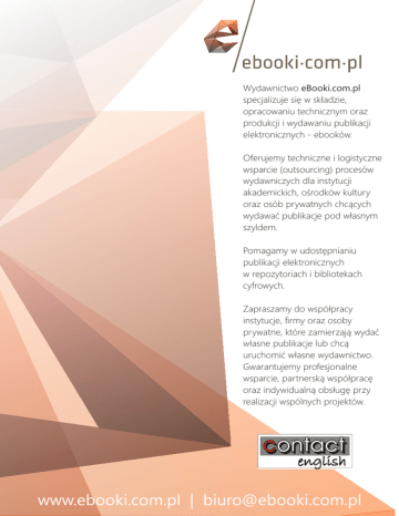 Wydawnictwo eBooki.com.pl specjalizuje się w składzie, opracowaniu technicznym oraz produkcji i wydawaniu publikacji elektronicznych - ebooków. Oferujemy techniczne i logistyczne wsparcie (outsourcing) procesów wydawniczych dla instytucji akademickich, ośrodków kultury oraz osób prywatnych chcących wydawać publikacje pod własnym szyldem. Pomagamy w udostępnianiu publikacji elektronicznych w repozytoriach i bibliotekach cyfrowych. Zapraszamy do współpracy instytucje, firmy oraz osoby prywatne, które zamierzają wydać własne publikacje lub chcą uruchomić własne wydawnictwo. Gwarantujemy profesjonalne wsparcie, partnerską współpracę oraz indywidualną obsługę przy realizacji wspólnych projektów. www.ebooki.com.pl | [email protected] Widoczność polskiej nauki w skali międzynarodowej to dzisiaj jedno z większych wyzwań i oczekiwań, które stoi przed polskimi uczelniami. Skuteczną formą sprostania temu wyzwaniu jest szeroko pojęta komunikacja naukowa realizowana za pośrednictwem otwartego dostępu do publikacji naukowych w modelu Open Access. Wydawnictwo eBooki.com.pl wychodząc naprzeciw wspomnianym oczekiwaniom przygotowało ofertę dedykowaną dla środowisk akademickich, której celem jest wsparcie produkcji oraz promocji publikacji tworzonych przez polskich uczonych. Oferujemy kompleksowe rozwiązania w zakresach: ÂÂ skład, produkcja i wydawanie publikacji elektronicznych oraz drukowanych; ÂÂ opracowanie redakcyjne, korektorskie i graficzne; ÂÂ profesjonalne tłumaczenia tekstów przez native speakera; ÂÂ optymalizacja publikacji dla urządzeń mobilnych w formacie ePUB; ÂÂ pomoc w zorganizowaniu ośrodka wydawniczego w ramach Instytutu, Wydziału lub Uczelni; ÂÂ outsourcing wszelkich procesów wydawniczych; ÂÂ publikacja w bibliotekach i repozytoriach cyfrowych; ÂÂ wsparcie informatyczne w zakresie projektowania i utrzymania serwisów WWW; ÂÂ promocja i wspieranie pozycjonowania w wyszukiwarkach internetowych (np. Google, Google Scholar, Europeana). W zakresie przekładów na język angielski wspiera nas firma Contact English zajmująca się profesjonalnie tłumaczeniami. W ramach pakietu Tłumaczenie plus tekst przygotowywany jest w trzech etapach: ÂÂ etap 1: tłumaczenie z języka polskiego na angielski wykonane przez doświadczonego native speakera języka angielskiego; ÂÂ etap 2: copyediting tekstu docelowego wykonany przez drugiego native speakera (niezależnego od tłumacza); ÂÂ etap 3: korekta tekstu docelowego wykonana przez native speakera (tłumacz tekstu źródłowego). W tym trybie autor ma pewność, że tekst docelowy będzie nie tylko wolny od wad językowych, ale także będzie brzmiał tak, jakby został napisany przez native speakera. Contact English s.c. Matthew Bastock, Matthew La Fontaine email: [email protected] tel.: +48 501 247 742 WWW: http://www.contactenglish.pl Wydawnictwo eBooki.com.pl Tomasz Kalota email: [email protected] tel.: +48 602 606 508 WWW: http://www.ebooki.com.pl