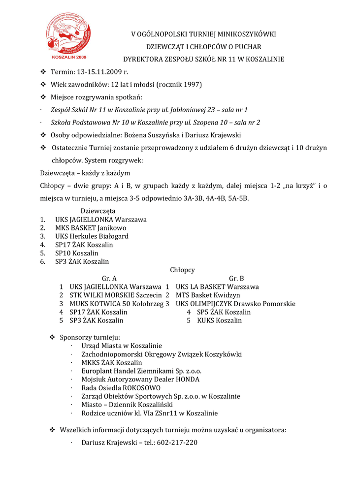 V OGÓLNOPOLSKI TURNIEJ MINIKOSZYKÓWKI DZIEWCZĄT I CHŁOPCÓW O PUCHAR DYREKTORA ZESPOŁU SZKÓŁ NR 11 W KOSZALINIE Termin: 13-15.11.2009 r. Wiek zawodników: 12 lat i młodsi (rocznik 1997) Miejsce rozgrywania spotkań: · Zespół Szkół Nr 11 w Koszalinie przy ul. Jabłoniowej 23 – sala nr 1 · Szkoła Podstawowa Nr 10 w Koszalinie przy ul. Szopena 10 – sala nr 2 Osoby odpowiedzialne: Bożena Suszyńska i Dariusz Krajewski Ostatecznie Turniej zostanie przeprowadzony z udziałem 6 drużyn dziewcząt i 10 drużyn chłopców. System rozgrywek: Dziewczęta – każdy z każdym Chłopcy – dwie grupy: A i B, w grupach każdy z każdym, dalej miejsca 1-2 „na krzyż” i o miejsca w turnieju, a miejsca 3-5 odpowiednio 3A-3B, 4A-4B, 5A-5B. 1. 2. 3. 4. 5. 6. Dziewczęta UKS JAGIELLONKA Warszawa MKS BASKET Janikowo UKS Herkules Białogard SP17 ŻAK Koszalin SP10 Koszalin SP3 ŻAK Koszalin 1 2 3 4 5 Chłopcy Gr. A Gr. B UKS JAGIELLONKA Warszawa 1 UKS LA BASKET Warszawa STK WILKI MORSKIE Szczecin 2 MTS Basket Kwidzyn MUKS KOTWICA 50 Kołobrzeg 3 UKS OLIMPIJCZYK Drawsko Pomorskie SP17 ŻAK Koszalin 4 SP5 ŻAK Koszalin SP3 ŻAK Koszalin 5 KUKS Koszalin Sponsorzy turnieju: · Urząd Miasta w Koszalinie · Zachodniopomorski Okręgowy Związek Koszykówki · MKKS ŻAK Koszalin · Europlant Handel Ziemnikami Sp. z.o.o. · Mojsiuk Autoryzowany Dealer HONDA · Rada Osiedla ROKOSOWO · Zarząd Obiektów Sportowych Sp. z.o.o. w Koszalinie · Miasto – Dziennik Koszaliński · Rodzice uczniów kl. VIa ZSnr11 w Koszalinie Wszelkich informacji dotyczących turnieju można uzyskać u organizatora: · Dariusz Krajewski – tel.: 602-217-220