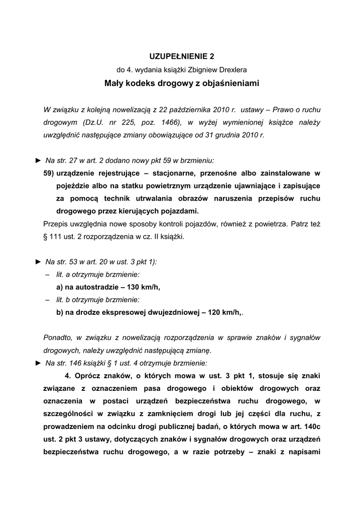 UZUPEŁNIENIE 2 do 4. wydania książki Zbigniew Drexlera Mały kodeks drogowy z objaśnieniami W związku z kolejną nowelizacją z 22 października 2010 r. ustawy ‒ Prawo o ruchu drogowym (Dz.U. nr 225, poz. 1466), w wyżej wymienionej książce należy uwzględnić następujące zmiany obowiązujące od 31 grudnia 2010 r. ► Na str. 27 w art. 2 dodano nowy pkt 59 w brzmieniu: 59) urządzenie rejestrujące – stacjonarne, przenośne albo zainstalowane w pojeździe albo na statku powietrznym urządzenie ujawniające i zapisujące za pomocą technik utrwalania obrazów naruszenia przepisów ruchu drogowego przez kierujących pojazdami. Przepis uwzględnia nowe sposoby kontroli pojazdów, również z powietrza. Patrz też § 111 ust. 2 rozporządzenia w cz. II książki. ► Na str. 53 w art. 20 w ust. 3 pkt 1): ‒ lit. a otrzymuje brzmienie: a) na autostradzie – 130 km/h, ‒ lit. b otrzymuje brzmienie: b) na drodze ekspresowej dwujezdniowej – 120 km/h,. Ponadto, w związku z nowelizacją rozporządzenia w sprawie znaków i sygnałów drogowych, należy uwzględnić następującą zmianę. ► Na str. 146 książki § 1 ust. 4 otrzymuje brzmienie: 4. Oprócz znaków, o których mowa w ust. 3 pkt 1, stosuje się znaki związane z oznaczeniem pasa drogowego i obiektów drogowych oraz oznaczenia w postaci urządzeń bezpieczeństwa ruchu drogowego, w szczególności w związku z zamknięciem drogi lub jej części dla ruchu, z prowadzeniem na odcinku drogi publicznej badań, o których mowa w art. 140c ust. 2 pkt 3 ustawy, dotyczących znaków i sygnałów drogowych oraz urządzeń bezpieczeństwa ruchu drogowego, a w razie potrzeby – znaki z napisami wskazującymi sposób korzystania z drogi, jeżeli nie może on być wyrażony znakami określonymi w załączniku do niniejszego rozporządzenia. Objaśnienie uzupełniające: (3) Nowelizacja z 14 kwietnia 2010 r. komentowanego rozporządzenia dopuściła stosowanie na drogach rozwiązań mających na celu realizację inicjowanych przez Krajową Radę Bezpieczeństwa Ruchu Drogowego badań naukowych, o których mowa w – powołanym w § 1 ust. 4 – artykule 140c ustawy. Informacje o prowadzonych badaniach są przekazywane znakami A-30 z odpowiednimi tabliczkami, zwłaszcza T-2 i T-3, oraz napisami, a także dodatkowymi tablicami informacyjnymi określającymi miejsce i zakres prowadzonych badań (doświadczeń).