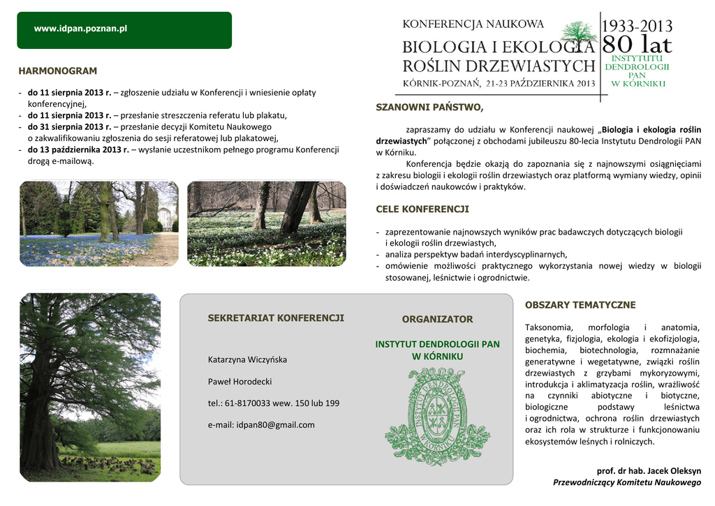 www.idpan.poznan.pl HARMONOGRAM - do 11 sierpnia 2013 r. – zgłoszenie udziału w Konferencji i wniesienie opłaty konferencyjnej, - do 11 sierpnia 2013 r. – przesłanie streszczenia referatu lub plakatu, - do 31 sierpnia 2013 r. – przesłanie decyzji Komitetu Naukowego o zakwalifikowaniu zgłoszenia do sesji referatowej lub plakatowej, - do 13 października 2013 r. – wysłanie uczestnikom pełnego programu Konferencji drogą e-mailową. SZANOWNI PAŃSTWO, zapraszamy do udziału w Konferencji naukowej „Biologia i ekologia roślin drzewiastych” połączonej z obchodami jubileuszu 80-lecia Instytutu Dendrologii PAN w Kórniku. Konferencja będzie okazją do zapoznania się z najnowszymi osiągnięciami z zakresu biologii i ekologii roślin drzewiastych oraz platformą wymiany wiedzy, opinii i doświadczeń naukowców i praktyków. CELE KONFERENCJI - zaprezentowanie najnowszych wyników prac badawczych dotyczących biologii i ekologii roślin drzewiastych, - analiza perspektyw badań interdyscyplinarnych, - omówienie możliwości praktycznego wykorzystania nowej wiedzy w biologii stosowanej, leśnictwie i ogrodnictwie. OBSZARY TEMATYCZNE SEKRETARIAT KONFERENCJI Katarzyna Wiczyńska Paweł Horodecki tel.: 61-8170033 wew. 150 lub 199 e-mail: [email protected] ORGANIZATOR INSTYTUT DENDROLOGII PAN W KÓRNIKU Taksonomia, morfologia i anatomia, genetyka, fizjologia, ekologia i ekofizjologia, biochemia, biotechnologia, rozmnażanie generatywne i wegetatywne, związki roślin drzewiastych z grzybami mykoryzowymi, introdukcja i aklimatyzacja roślin, wrażliwość na czynniki abiotyczne i biotyczne, biologiczne podstawy leśnictwa i ogrodnictwa, ochrona roślin drzewiastych oraz ich rola w strukturze i funkcjonowaniu ekosystemów leśnych i rolniczych. prof. dr hab. Jacek Oleksyn Przewodniczący Komitetu Naukowego KOMITET NAUKOWY PROGRAM KONFERENCJI ZGŁOSZENIE UCZESTNICTWA PRZEWODNICZĄCY prof. dr hab. Jacek Oleksyn, Dyrektor Instytutu Dendrologii PAN w Kórniku 21 października 2013 roku (poniedziałek) godz. 10:00, POZNAŃ Udział w Konferencji należy zgłosić do 11 sierpnia 2013 roku, wysyłając wypełnione zgłoszenie oraz dokonując opłaty konferencyjnej. - uroczyste otwarcie Konferencji - historia i misja Instytutu Dendrologii PAN w Kórniku - wkład Instytutu Dendrologii PAN w nauki biologiczne, leśne i ogrodnicze - znaczenie współczesnych badań dendrologicznych - bankiet Formularz zgłoszeniowy oraz dodatkowe informacje dostępne są na stronie: CZŁONKOWIE prof. dr hab. Roman Słowiński, Prezes Oddziału Polskiej Akademii Nauk w Poznaniu prof. dr hab. Konrad Wołowski, Dyrektor Instytutu Botaniki im. W. Szafera PAN w Krakowie dr hab. Piotr Kowalczak, Dyrektor Instytutu Środowiska Rolniczego i Leśnego PAN w Poznaniu prof. dr hab. Tomasz Zawiła-Niedźwiecki, 0o Dyrektor Instytutu Badawczego Leśnictwa w Sękocinie Starym prof. dr hab. Bogdan Jackowiak, Dziekan Wydziału Biologii Uniwersytetu im. A. Mickiewicza w Poznaniu prof. dr hab. Roman Gornowicz, Dziekan Wydziału Leśnego Uniwersytetu Przyrodniczego w Poznaniu prof. dr hab. Stanisław Orzeł, Dziekan Wydziału Leśnego Uniwersytetu Rolniczego im. H. Kołłątaja w Krakowie prof. dr hab. Henryk Żybura, Dziekan Wydziału Leśnego SGGW w Warszawie prof. dr hab. Tomasz Jasiński, Dyrektor Biblioteki Kórnickiej PAN w Kórniku prof. dr hab. Wiesław Prus-Głowacki, Przewodniczący Rady Naukowej Instytutu Dendrologii PAN w Kórniku, Uniwersytet im. A. Mickiewicza w Poznaniu www.idpan.poznan.pl STRESZCZENIA WYSTĄPIEŃ 22 października 2013 roku (wtorek) godz. 09:00, KÓRNIK / POZNAŃ Zgłoszenia wystąpień będą kwalifikowane do sesji referatowych lub plakatowych Konferencji przez Komitet Naukowy na podstawie streszczeń (wzór streszczenia na stronie internetowej Instytutu). Streszczenia wystąpień prosimy przesłać na adres emailowy: [email protected] do 11 sierpnia. - sesja terenowa (przejazd do Kórnika) - sesje referatowe i plakatowe uczestników Konferencji (Poznań) KOSZT UDZIAŁU W KONFERENCJI 23 października 2013 roku (środa) godz. 09:00, POZNAŃ - sesje referatowe i plakatowe uczestników Konferencji Proponujemy udział w trzech sesjach tematycznych: I – Od teorii do praktyki. Możliwości aplikacyjne wyników badań naukowych. II – Środowisko zmienia drzewa, drzewa zmieniają środowisko. III – Taksonomia klasyczna – taksonomia molekularna. Różne podejścia – jeden cel. MIEJSCE KONFERENCJI Sala wykładowa Ośrodka Nauki PAN, ul. Wieniawskiego 17/19, Poznań Opłata konferencyjna wynosi 600 zł, a dla doktorantów i studentów – 300 zł i obejmuje: koszty organizacyjne, materiały konferencyjne, udział w obradach, poczęstunek podczas przerw w obradach, bankiet w pierwszym dniu Konferencji oraz przejazd autokarem na trasie Poznań-Kórnik-Poznań w drugim dniu Konferencji. Opłata konferencyjna nie obejmuje kosztu noclegów. Wpłaty prosimy dokonać na rachunek bankowy: 65 1090 1418 0000 0000 4104 4097 Instytut Dendrologii PAN w Kórniku ul. Parkowa 5 62-035 Kórnik W tytule przelewu należy podać następujące dane: imię i nazwisko uczestnika oraz dopisek „Konferencja 2013”.