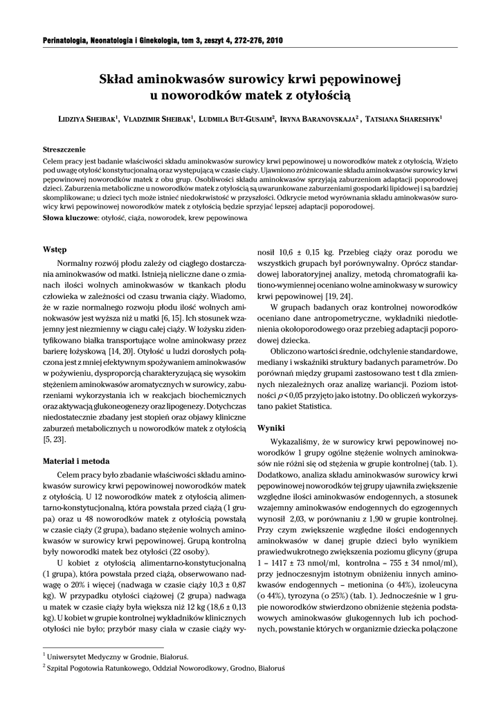 Perinatologia, Neonatologia i Ginekologia, tom 3, zeszyt 4, 272-276, 2010 Skład aminokwasów surowicy krwi pępowinowej u noworodków matek z otyłością LIDZIYA SHEIBAK1, VLADZIMIR SHEIBAK1, LUDMILA BUT-GUSAIM2, IRYNA BARANOVSKAJA2 , TATSIANA SHARESHYK1 Streszczenie Celem pracy jest badanie właściwości składu aminokwasów surowicy krwi pępowinowej u noworodków matek z otyłością. Wzięto pod uwagę otyłość konstytucjonalną oraz występującą w czasie ciąży. Ujawniono zróżnicowanie składu aminokwasów surowicy krwi pępowinowej noworodków matek z obu grup. Osobliwości składu aminokwasów sprzyjają zaburzeniom adaptacji poporodowej dzieci. Zaburzenia metaboliczne u noworodków matek z otyłością są uwarunkowane zaburzeniami gospodarki lipidowej i są bardziej skomplikowane; u dzieci tych może istnieć niedokrwistość w przyszłości. Odkrycie metod wyrównania składu aminokwasów surowicy krwi pępowinowej noworodków matek z otyłością będzie sprzyjać lepszej adaptacji poporodowej. Słowa kluczowe: otyłość, ciąża, noworodek, krew pępowinowa Wstęp Normalny rozwój płodu zależy od ciągłego dostarczania aminokwasów od matki. Istnieją nieliczne dane o zmianach ilości wolnych aminokwasów w tkankach płodu człowieka w zależności od czasu trwania ciąży. Wiadomo, że w razie normalnego rozwoju płodu ilość wolnych aminokwasów jest wyższa niż u matki [6, 15]. Ich stosunek wzajemny jest niezmienny w ciągu całej ciąży. W łożysku zidentyfikowano białka transportujące wolne aminokwasy przez barierę łożyskową [14, 20]. Otyłość u ludzi dorosłych połączona jest z mniej efektywnym spożywaniem aminokwasów w pożywieniu, dysproporcją charakteryzującą się wysokim stężeniem aminokwasów aromatycznych w surowicy, zaburzeniami wykorzystania ich w reakcjach biochemicznych oraz aktywacją glukoneogenezy oraz lipogenezy. Dotychczas niedostatecznie zbadany jest stopień oraz objawy kliniczne zaburzeń metabolicznych u noworodków matek z otyłością [5, 23]. Materiał i metoda Celem pracy było zbadanie właściwości składu aminokwasów surowicy krwi pępowinowej noworodków matek z otyłością. U 12 noworodków matek z otyłością alimentarno-konstytucjonalną, która powstała przed ciążą (1 grupa) oraz u 48 noworodków matek z otyłością powstałą w czasie ciąży (2 grupa), badano stężenie wolnych aminokwasów w surowicy krwi pępowinowej. Grupą kontrolną były noworodki matek bez otyłości (22 osoby). U kobiet z otyłością alimentarno-konstytucjonalną (1 grupa), która powstała przed ciążą, obserwowano nadwagę o 20% i więcej (nadwaga w czasie ciąży 10,3 ± 0,87 kg). W przypadku otyłości ciążowej (2 grupa) nadwaga u matek w czasie ciąży była większa niż 12 kg (18,6 ± 0,13 kg). U kobiet w grupie kontrolnej wykładników klinicznych otyłości nie było; przybór masy ciała w czasie ciąży wy- nosił 10,6 ± 0,15 kg. Przebieg ciąży oraz porodu we wszystkich grupach był porównywalny. Oprócz standardowej laboratoryjnej analizy, metodą chromatografii kationo-wymiennej oceniano wolne aminokwasy w surowicy krwi pępowinowej [19, 24]. W grupach badanych oraz kontrolnej noworodków oceniano dane antropometryczne, wykładniki niedotlenienia okołoporodowego oraz przebieg adaptacji poporodowej dziecka. Obliczono wartości średnie, odchylenie standardowe, mediany i wskaźniki struktury badanych parametrów. Do porównań między grupami zastosowano test t dla zmiennych niezależnych oraz analizę wariancji. Poziom istotności p < 0,05 przyjęto jako istotny. Do obliczeń wykorzystano pakiet Statistica. Wyniki Wykazaliśmy, że w surowicy krwi pępowinowej noworodków 1 grupy ogólne stężenie wolnych aminokwasów nie różni się od stężenia w grupie kontrolnej (tab. 1). Dodatkowo, analiza składu aminokwasów surowicy krwi pępowinowej noworodków tej grupy ujawniła zwiększenie względne ilości aminokwasów endogennych, a stosunek wzajemny aminokwasów endogennych do egzogennych wynosił 2,03, w porównaniu z 1,90 w grupie kontrolnej. Przy czym zwiększenie względne ilości endogennych aminokwasów w danej grupie dzieci było wynikiem prawiedwukrotnego zwiększenia poziomu glicyny (grupa 1 – 1417 ± 73 nmol/ml, kontrolna – 755 ± 34 nmol/ml), przy jednoczesnyjm istotnym obniżeniu innych aminokwasów endogennych – metionina (o 44%), izoleucyna (o 44%), tyrozyna (o 25%) (tab. 1). Jednocześnie w 1 grupie noworodków stwierdzono obniżenie stężenia podstawowych aminokwasów glukogennych lub ich pochodnych, powstanie których w organizmie dziecka połączone 1 Uniwersytet Medyczny w Grodnie, Białoruś. 2 Szpital Pogotowia Ratunkowego, Oddział Noworodkowy, Grodno, Białoruś 273 Skład aminokwasów surowicy krwi pępowinowej u noworodków matek z otyłością jest z przemianą węglowodanów, szczególnie glukozy – aspartat, glutamat, alanina, glutamina. Zmniejszył się stosunek wzajemny fenylolanina/tyrozyna (1,59 w grupie i 1, 11 w grupie kontrolnej). W surowicy krwi pępowinowej noworodków 2. grupy stwierdzono zmniejszenie ogólnego stężenia wolnych aminokwasów o 17%, które było efektem spadku stężenia aminokwasów egzogennych – metionina (o 32%), leucyna (o 29%), tyrozyna (o 22%) oraz aminokwasu endogennego – glicyny (o 43%). Obniżenie stężenia glicyny w surowicy krwi pępowinowej dzieci 2. grupy było najbardziej wyraźne u noworodków z niską masą urodzeniową (458 ± 53 nmol/ml; p < 0,001; n = 9), przy niedotlenieniu wewnątrzmacicznym (411 ± 38 nmol/ml; p < 0,001; n = 8), oraz przy współistnieniu otyłości ciążowej z nadciśnieniem ciążowym (569 ± 46 nmol/ml; p < 0,05; n = 11), co prawdopodobnie było uwarunkowane ograniczonym spożywaniem tego aminokwasu [18, 22]. Stosunek wzajemny aminokwasów endogennych do egzogennych w 2. grupie noworodków był najbardziej obniżony w przypadku ostrego niedotlenienia wewnątrzmacicznego (1,59 – niedotl