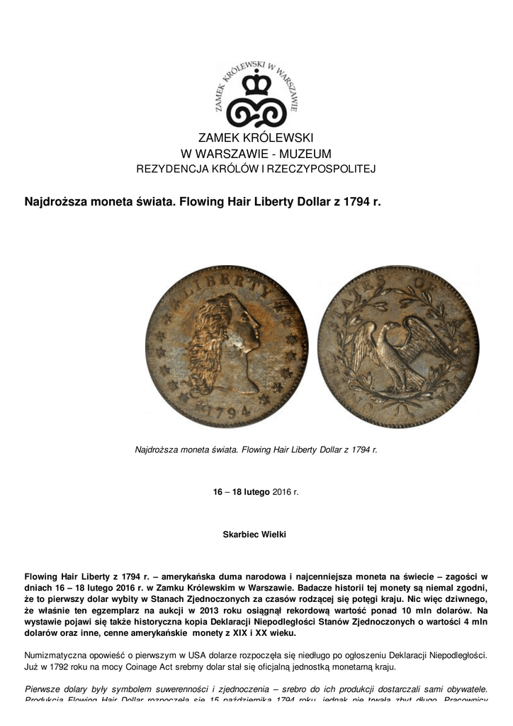 ZAMEK KRÓLEWSKI W WARSZAWIE - MUZEUM REZYDENCJA KRÓLÓW I RZECZYPOSPOLITEJ Najdroższa moneta świata. Flowing Hair Liberty Dollar z 1794 r. Najdroższa moneta świata. Flowing Hair Liberty Dollar z 1794 r. 16 – 18 lutego 2016 r. Skarbiec Wielki Flowing Hair Liberty z 1794 r. – amerykańska duma narodowa i najcenniejsza moneta na świecie – zagości w dniach 16 – 18 lutego 2016 r. w Zamku Królewskim w Warszawie. Badacze historii tej monety są niemal zgodni, że to pierwszy dolar wybity w Stanach Zjednoczonych za czasów rodzącej się potęgi kraju. Nic więc dziwnego, że właśnie ten egzemplarz na aukcji w 2013 roku osiągnął rekordową wartość ponad 10 mln dolarów. Na wystawie pojawi się także historyczna kopia Deklaracji Niepodległości Stanów Zjednoczonych o wartości 4 mln dolarów oraz inne, cenne amerykańskie monety z XIX i XX wieku. Numizmatyczna opowieść o pierwszym w USA dolarze rozpoczęła się niedługo po ogłoszeniu Deklaracji Niepodległości. Już w 1792 roku na mocy Coinage Act srebrny dolar stał się oficjalną jednostką monetarną kraju. Pierwsze dolary były symbolem suwerenności i zjednoczenia – srebro do ich produkcji dostarczali sami obywatele. Produkcja Flowing Hair Dollar rozpoczęła się 15 października 1794 roku, jednak nie trwała zbyt długo. Pracownicy Produkcja Flowing Hair Dollar rozpoczęła się 15 października 1794 roku, jednak nie trwała zbyt długo. Pracownicy mennicy szybko się zorientowali, że narzędzia, którymi dysponują, są nieodpowiednie do bicia monety o dużych rozmiarach i zawiesili produkcję po niewielkim nakładzie 1758 sztuk. Utrzymuje się, że do czasów współczesnych zachowało się około 130 sztuk Flowing Hair Dollar z pierwszego roku produkcji, jednak większość z nich jest w bardzo złym stanie – komentuje Adam Zieliński, dyrektor zarządzający Skarbnicy Narodowej. Prezentowany na wystawie Flowing Hair Liberty Dollar z 1794 r. określa się nazwą Neil/Carter, która swoje pochodzenie zawdzięcza dwóm właścicielom. Dokładne badanie właściwości tego egzemplarza sugeruje, że może to być jeden z pierwszych srebrnych dolarów wybitych ponad dwa wieki temu. Nie można kwestionować, że ten egzemplarz to jedyny znany okaz prezentujący wszystkie właściwości, którymi powinien cechować się pierwszy dolar. Warto zwrócić uwagę na dobrze zachowane bicie, widoczne od części centralnej monety, aż po jej brzegi. Lustrzane refleksy przepływające przez awers i rewers monety, niezaburzone przez żadnego rodzaju zarysowania, są dowodem na niebywałą ochronę tego egzemplarza od pierwszych dni jego istnienia – dodaje Adam Zieliński. Zagadkę historyczną pomogą rozwiązać reguły sztuki menniczej: w trakcie produkcji pierwsza moneta powstaje przy użyciu świeżo przygotowanych matryc, które nie mają żadnych śladów użytkowania. Kolejne użycia matryc powodują ich modyfikacje, co widać nawet na tak wąskiej serii jak srebrne dolary z 1794 r. Egzemplarz Neil/Carter został wybity przy użyciu bardzo wczesnych matryc – świadczy o tym dobry stan numizmatu oraz długie włosy bogini Liberty. Początkowo matryce pokazywały oryginalny zamysł projektanta Roberta Scotta. Po wybiciu kilku sztuk Flowing Hair Dollar okazało się, że matryce się ścierają, a pusta powierzchnia między nimi się zatraca. W konsekwencji część projektu awersu przenosiła się na rewers i odwrotnie. Pracownicy mennicy szybko to zauważyli. Ten błąd kosztował jednak boginię Liberty ścięcie włosów – kolejne egzemplarze po wznowieniu produkcji prezentują ją w dużo krótszej fryzurze – dodaje Adam Zieliński. Wstęp bezpłatny: na podstawie biletu ewidencyjnego (dla osób, które chcą zwiedzić wyłącznie wystawę numizmatyczną), a także na podstawie biletu na Trasę Zamkową lub do Galerii Lanckorońskich Wystawa czynna w godzinach otwarcia Zamku: wt. – czw.: 10.00 – 16.00 (ostatnie wejście o godz. 15.30) Zamek Królewski w Warszawie - Muzeum. Rezydencja Królów i Rzeczypospolitej www.zamek-krolewski.pl