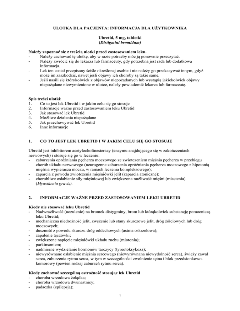 ULOTKA DLA PACJENTA: INFORMACJA DLA UŻYTKOWNIKA Ubretid, 5 mg, tabletki (Distigmini bromidum) Należy zapoznać się z treścią ulotki przed zastosowaniem leku. Należy zachować tę ulotkę, aby w razie potrzeby móc ją ponownie przeczytać. Należy zwrócić się do lekarza lub farmaceuty, gdy potrzebna jest rada lub dodatkowa informacja. Lek ten został przepisany ściśle określonej osobie i nie należy go przekazywać innym, gdyż może im zaszkodzić, nawet jeśli objawy ich choroby są takie same. Jeśli nasili się którykolwiek z objawów niepożądanych lub wystąpią jakiekolwiek objawy niepożądane niewymienione w ulotce, należy powiadomić lekarza lub farmaceutę. Spis treści ulotki: 1. Co to jest lek Ubretid i w jakim celu się go stosuje 2. Informacje ważne przed zastosowaniem leku Ubretid 3. Jak stosować lek Ubretid 4. Możliwe działania niepożądane 5. Jak przechowywać lek Ubretid 6. Inne informacje 1. CO TO JEST LEK UBRETID I W JAKIM CELU SIĘ GO STOSUJE Ubretid jest inhibitorem acetylocholinesterazy (enzymu znajdującego się w zakończeniach nerwowych) i stosuje się go w leczeniu: - zaburzenia opróżniania pęcherza moczowego ze zwiotczeniem mięśnia pęcherza w przebiegu chorób układu nerwowego (neurogenne zaburzenia opróżniania pęcherza moczowego z hipotonią mięśnia wypieracza moczu, w ramach leczenia kompleksowego); - zaparcia z powodu zwiotczenia mięśniówki jelit (zaparcia atoniczne); - chorobliwe osłabienie siły mięśniowej lub zwiększona nużliwość mięśni (miastenia) (Myasthenia gravis). 2. INFORMACJE WAŻNE PRZED ZASTOSOWANIEM LEKU UBRETID Kiedy nie stosować leku Ubretid - Nadwrażliwość (uczulenie) na bromek distygminy, brom lub którąkolwiek substancję pomocniczą leku Ubretid; - mechaniczna niedrożność jelit, zwężenie lub stany skurczowe jelit, dróg żółciowych lub dróg moczowych; - duszność z powodu skurczu dróg oddechowych (astma oskrzelowa); - zapalenie tęczówki; - zwiększone napięcie mięśniówki układu ruchu (miotonia); - parkinsonizm; - nadmierne wydzielanie hormonów tarczycy (tyreotoksykoza); - niewyrównane osłabienie mięśnia sercowego (niewyrównana niewydolność serca), świeży zawał serca, zaburzenia rytmu serca, w tym w szczególności zwolnienie tętna i blok przedsionkowokomorowy (pewien rodzaj zaburzeń rytmu serca). Kiedy zachować szczególną ostrożność stosując lek Ubretid - choroba wrzodowa żołądka; - choroba wrzodowa dwunastnicy; - padaczka (epilepsja); 1 - zwolnienie rytmu serca; niskie ciśnienie tętnicze; stany zapalne jelit; napadowe skurcze mięśniowe (tężyczka). Stosowanie leku Ubretid z innymi lekami Należy powiedzieć lekarzowi o wszystkich przyjmowanych ostatnio lekach, również tych, które wydawane są bez recepty. Szczegółowe dane umieszczone są na końcu ulotki w informacjach dla personelu medycznego. Ciąża i karmienie piersią Przed zastosowaniem każdego leku należy poradzić się lekarza lub farmaceuty. Brak jest wystarczających danych dotyczących stosowania leku Ubretid u kobiet w ciąży. Chociaż w badaniach na zwierzętach nie obserwowano szkodliwego wpływu leku na płody, należy unikać jego stosowania w trakcie ciąży, w tym zwłaszcza w trakcie pierwszych 3 miesięcy. W przypadku bezwzględnych wskazań życiowych do stosowania leku należy przeprowadzić staranną analizę stosunku korzyści do ryzyka związanego z jego krótkotrwałym podawaniem. U noworodków urodzonych przez kobiety z chorobliwym osłabieniem siły mięśniowej lub zwiększeniem nużliwości mięśni (miastenią), leczone lekiem Ubretid, może występować przemijające osłabienie mięśniowe. Nie jest pewne, czy Ubretid przenika do mleka kobiecego. Dlatego leku Ubretid 5 mg tabletki nie należy stosować w okresie karmienia piersią. Prowadzenie pojazdów i obsługa maszyn Uwaga: lek może obniżać sprawność psychomotoryczną i zdolność do prowadzenia pojazdów mechanicznych. Lek Ubretid może w niektórych przypadkach zmniejszać zdolność prowadzenia pojazdów mechanicznych i obsługiwania urządzeń mechanicznych w ruchu ze względu na zaburzenia widzenia spowodowane zwężeniem źrenicy i osłabieniem ostrości wzroku przy zmianie odległości obserwowanych przedmiotów. Ważne informacje o niektórych składnikach leku Ubretid Lek zawiera laktozę. Jeżeli stwierdzono wcześniej u pacjenta nietolerancję niektórych cukrów, pacjent powinien skontaktować się z lekarzem przed przyjęciem leku. 3. JAK STOSOWAĆ LEK UBRETID Lek Ubretid należy zawsze zażywać zgodnie z zaleceniami lekarza. W przypadku wątpliwości należy ponownie skontaktować się lekarzem lub farmaceutą. Podczas stosowania leku Ubretid należy uwzględnić opóźniony początek i długotrwały okres działania tego leku, a także indywidualną reakcję pacjenta na jego zastosowanie. Dawkowanie należy ustalać indywidualnie. Zależy od ogólnego stanu pacjenta, zwłaszcza od wyjściowego stanu autonomicznego układu nerwowego. O ile lekarz nie zaleci inaczej, zazwyczaj stosowana dawka leku wynosi: Początkowo podaje się po 1 tabletce codziennie rano na czczo, pół godziny przed śniadaniem, aż do wystąpienia działania terapeutycznego. Zazwyczaj po pierwszym tygodniu leczenia przechodzi się na stosowanie leku co dwa lub trzy dni (po 1 do 2 tabletki). Dawkę dobową przyjmuje się jednorazowo. Dawkowanie w zależności od wskazań do stosowania: 2 Zaburzenia opróżniania pęcherza moczowego ze zwiotczeniem mięśnia pęcherza w przebiegu chorób układu nerwowego Zaleca się, aby w pierwszych dniach leczenia, aż do wystąpienia poprawy, stosować codziennie po 1 tabletce leku Ubretid rano na czczo, pół godziny przed śniadaniem. Do podtrzymania działania leczniczego wystarczy na ogół podawanie 1 do 2 tabletek co dwa lub trzy dni. Leczenie można również rozpocząć od podawania 1 ampułki leku Ubretid 0,5 mg/ml roztwór do wstrzykiwań, domięśniowo. Podobną 