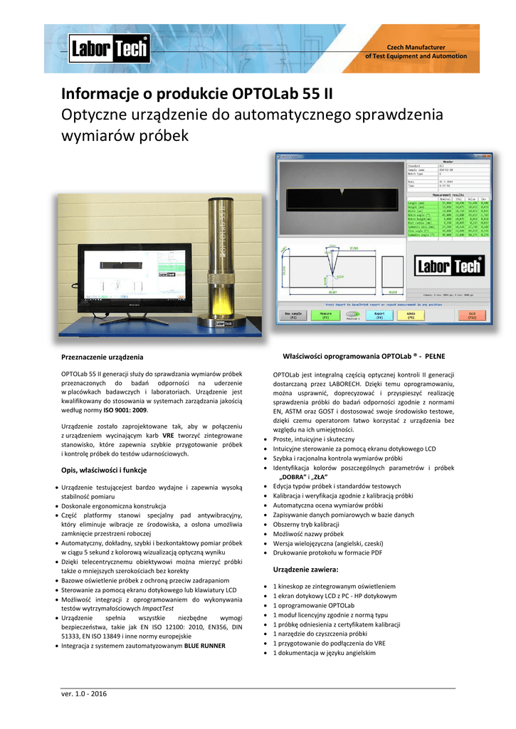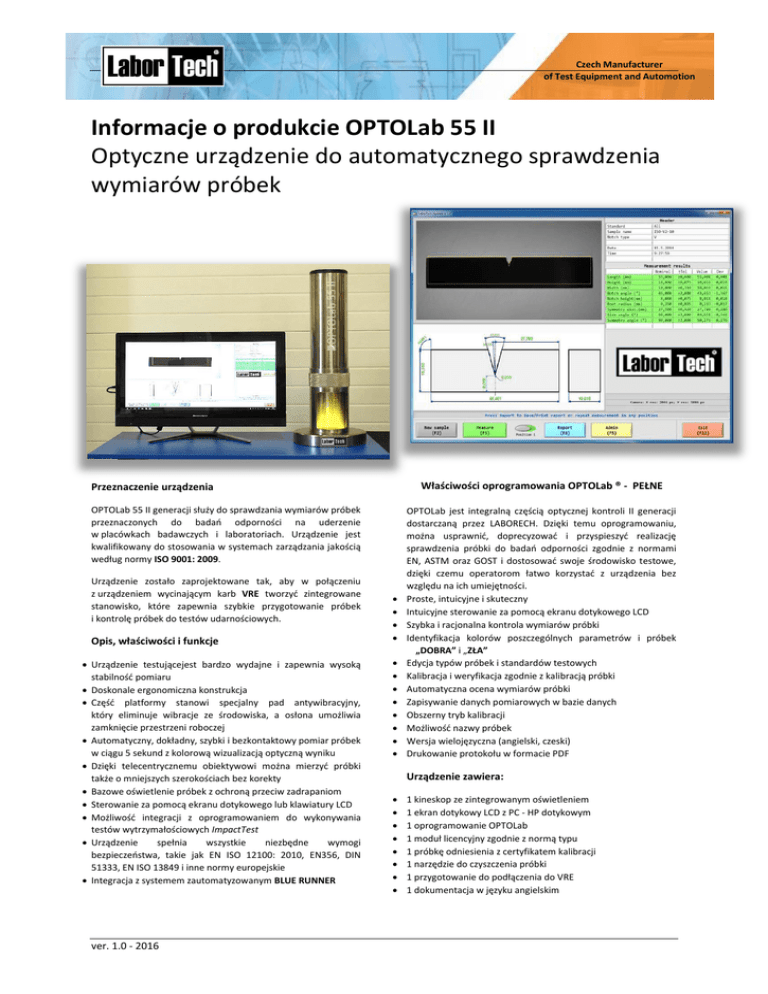 Czech Manufacturer of Test Equipment and Automotion Informacje o produkcie OPTOLab 55 II Optyczne urządzenie do automatycznego sprawdzenia wymiarów próbek Właściwości oprogramowania OPTOLab ® - PEŁNE Przeznaczenie urządzenia OPTOLab 55 II generacji służy do sprawdzania wymiarów próbek przeznaczonych do badań odporności na uderzenie w placówkach badawczych i laboratoriach. Urządzenie jest kwalifikowany do stosowania w systemach zarządzania jakością według normy ISO 9001: 2009. Urządzenie zostało zaprojektowane tak, aby w połączeniu z urządzeniem wycinającym karb VRE tworzyć zintegrowane stanowisko, które zapewnia szybkie przygotowanie próbek i kontrolę próbek do testów udarnościowych. Opis, właściwości i funkcje Urządzenie testującejest bardzo wydajne i zapewnia wysoką stabilność pomiaru Doskonale ergonomiczna konstrukcja Część platformy stanowi specjalny pad antywibracyjny, który eliminuje wibracje ze środowiska, a osłona umożliwia zamknięcie przestrzeni roboczej Automatyczny, dokładny, szybki i bezkontaktowy pomiar próbek w ciągu 5 sekund z kolorową wizualizacją optyczną wyniku Dzięki telecentrycznemu obiektywowi można mierzyć próbki także o mniejszych szerokościach bez korekty Bazowe oświetlenie próbek z ochroną przeciw zadrapaniom Sterowanie za pomocą ekranu dotykowego lub klawiatury LCD Możliwość integracji z oprogramowaniem do wykonywania testów wytrzymałościowych ImpactTest Urządzenie spełnia wszystkie niezbędne wymogi bezpieczeństwa, takie jak EN ISO 12100: 2010, EN356, DIN 51333, EN ISO 13849 i inne normy europejskie Integracja z systemem zautomatyzowanym BLUE RUNNER ver. 1.0 - 2016 OPTOLab jest integralną częścią optycznej kontroli II generacji dostarczaną przez LABORECH. Dzięki temu oprogramowaniu, można usprawnić, doprecyzować i przyspieszyć realizację sprawdzenia próbki do badań odporności zgodnie z normami EN, ASTM oraz GOST i dostosować swoje środowisko testowe, dzięki czemu operatorom łatwo korzystać z urządzenia bez względu na ich umiejętności. Proste, intuicyjne i skuteczny Intuicyjne sterowanie za pomocą ekranu dotykowego LCD Szybka i racjonalna kontrola wymiarów próbki Identyfikacja kolorów poszczególnych parametrów i próbek „DOBRA” i „ZŁA” Edycja typów próbek i standardów testowych Kalibracja i weryfikacja zgodnie z kalibracją próbki Automatyczna ocena wymiarów próbki Zapisywanie danych pomiarowych w bazie danych Obszerny tryb kalibracji Możliwość nazwy próbek Wersja wielojęzyczna (angielski, czeski) Drukowanie protokołu w formacie PDF Urządzenie zawiera: 1 kineskop ze zintegrowanym oświetleniem 1 ekran dotykowy LCD z PC - HP dotykowym 1 oprogramowanie OPTOLab 1 moduł licencyjny zgodnie z normą typu 1 próbkę odniesienia z certyfikatem kalibracji 1 narzędzie do czyszczenia próbki 1 przygotowanie do podłączenia do VRE 1 dokumentacja w języku angielskim Dane techniczne Jednostka Czech Manufacturer of Test Equipment and Automotion Typ maszyny Optyczna, pionowa Typ oświetlenia LED Obiektyw Telecentryczny Sprawdzenie według normy Zniekształcenie OPTOLab 55 II EN, ASTM, GOST % System operacyjny < 0,1% Windows 10 Kolor wykończenia NI (RAL 5015) Wymiary (średnica x wysokość) mm 240 x 704 Waga kg 32 Napięcie V 230V/50 Hz Moc wejściowa VA 10 Zmiany techniczne zastrzeżone przez producenta 03.08.2016 r. Wyłączne przedstawicielstwo w Polsce: LaborTech Polska ul. Chemików 1B/516 32-600 Oświęcim, Polska. Tel.: +48 733 806 980 [email protected], www.labortech.pl Producent: LABORTECH s.r.o., Rolnická 130a, 747 05 Opava, Czech republic. Tel.: +420 553 731 956, +420 553 775 327 Mob.: +420 602 527 646, +420 731 656 723, [email protected], www.labortech.cz, Czech republic ver. 1.0 - 2016