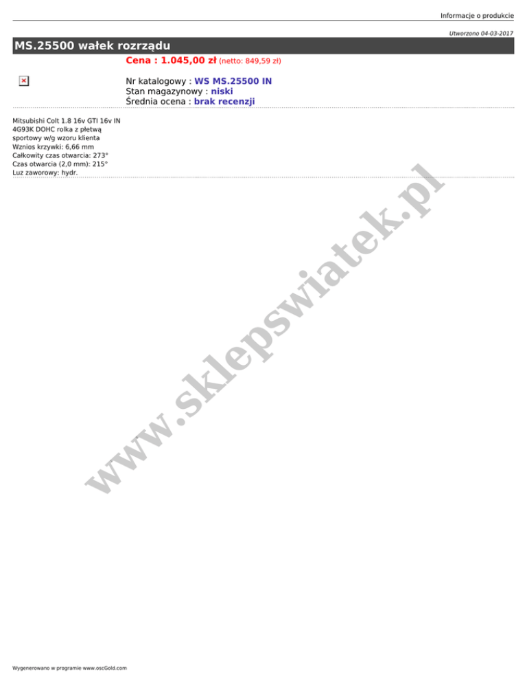 Informacje o produkcie Utworzono 04-03-2017 MS.25500 wałek rozrządu Cena : 1.045,00 zł (netto: 849,59 zł) Nr katalogowy : WS MS.25500 IN Stan magazynowy : niski Średnia ocena : brak recenzji w w w .s kl ep sw ia te k. pl Mitsubishi Colt 1.8 16v GTI 16v IN 4G93K DOHC rolka z płetwą sportowy w/g wzoru klienta Wznios krzywki: 6,66 mm Całkowity czas otwarcia: 273° Czas otwarcia (2,0 mm): 215° Luz zaworowy: hydr. Wygenerowano w programie www.oscGold.com