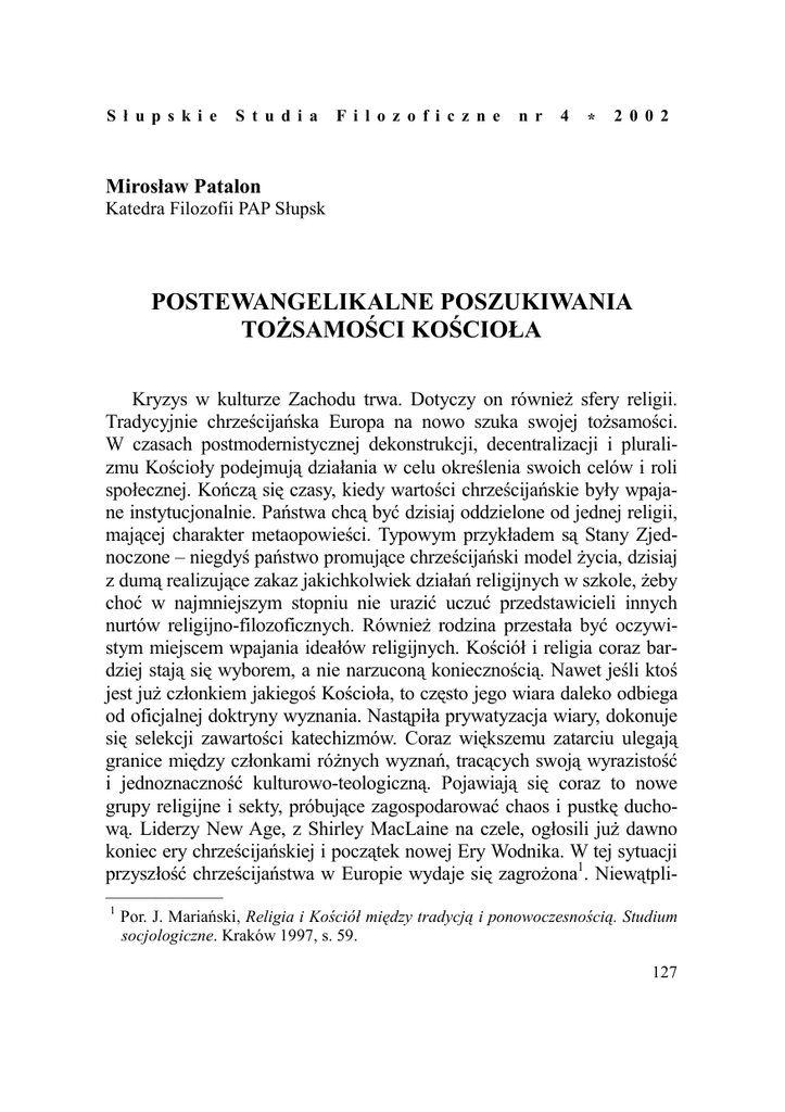 S ł u p s k i e S t u d i a F i l o z o f i c z n e n r 4 * 2 0 0 2 Mirosław Patalon Katedra Filozofii PAP Słupsk POSTEWANGELIKALNE POSZUKIWANIA TOśSAMOŚCI KOŚCIOŁA Kryzys w kulturze Zachodu trwa. Dotyczy on równieŜ sfery religii. Tradycyjnie chrześcijańska Europa na nowo szuka swojej toŜsamości. W czasach postmodernistycznej dekonstrukcji, decentralizacji i pluralizmu Kościoły podejmują działania w celu określenia swoich celów i roli społecznej. Kończą się czasy, kiedy wartości chrześcijańskie były wpajane instytucjonalnie. Państwa chcą być dzisiaj oddzielone od jednej religii, mającej charakter metaopowieści. Typowym przykładem są Stany Zjednoczone – niegdyś państwo promujące chrześcijański model Ŝycia, dzisiaj z dumą realizujące zakaz jakichkolwiek działań religijnych w szkole, Ŝeby choć w najmniejszym stopniu nie urazić uczuć przedstawicieli innych nurtów religijno-filozoficznych. RównieŜ rodzina przestała być oczywistym miejscem wpajania ideałów religijnych. Kościół i religia coraz bardziej stają się wyborem, a nie narzuconą koniecznością. Nawet jeśli ktoś jest juŜ członkiem jakiegoś Kościoła, to często jego wiara daleko odbiega od oficjalnej doktryny wyznania. Nastąpiła prywatyzacja wiary, dokonuje się selekcji zawartości katechizmów. Coraz większemu zatarciu ulegają granice między członkami róŜnych wyznań, tracących swoją wyrazistość i jednoznaczność kulturowo-teologiczną. Pojawiają się coraz to nowe grupy religijne i sekty, próbujące zagospodarować chaos i pustkę duchową. Liderzy New Age, z Shirley MacLaine na czele, ogłosili juŜ dawno koniec ery chrześcijańskiej i początek nowej Ery Wodnika. W tej sytuacji przyszłość chrześcijaństwa w Europie wydaje się zagroŜona1. Niewątpli——————— 1 Por. J. Mariański, Religia i Kościół między tradycją i ponowoczesnością. Studium socjologiczne. Kraków 1997, s. 59. 127 wie zmiany kulturowe zmuszają poszczególne denominacje do twórczych reakcji i w tym sensie są zjawiskiem pozytywnym, bowiem stanowią siłę sprawczą nowych trendów, ognisk zapalnych, koncepcji teologicznych. Katolicyzm wobec postmodernizmu Mogłoby się wydawać, Ŝe Kościół katolicki niechętnie odpowiada na postmodernistyczne wyzwania, poniewaŜ nie przeszedł jeszcze przez fazę modernizmu. Pius X, potępiając oficjalnie w 1907 roku modernizm rozumiany jako gloryfikacja rozumu kosztem wiary, naraził się na zarzuty o wsteczność, nienaukowość, zacofanie. Ale przecieŜ takŜe postmodernizm oskarŜany jest o nienaukowość tylko dlatego, Ŝe odchodzi od pozytywistycznie pojętej nauki. MoŜe więc Kościół katolicki bliŜszy jest współczesnej kulturze niŜ modernistyczne Kościoły protestanckie, szczególnie te w wersji liberalnej? PrzecieŜ katolicka symbolika, przeŜywanie wiary, subiektywizm i uczuciowość korespondują z postmodernizmem bardziej niŜ protestancka kalkulacja, dogmatyczny chłód i akcent połoŜony na rozumowe pojmowanie wiary. Max Weber dostrzegał wyraźną róŜnicę pomiędzy Kościołem katolickim a Kościołami protestanckimi w ich sposobie przeŜywania wiary i stosunku do dogmatów, co ma zdecydowany wpływ na większą racjonalizację wiary w protestantyzmie niŜ w katolicyzmie2. TakŜe Leszek Kołakowski w swej pracy poświęconej chrześcijaństwu bezwyznaniowemu XVII wieku stwierdza, Ŝe „Kościół katolicki zawsze był o wiele bardziej tolerancyjny wobec mistycyzmu niŜ kościoły reformowane, które im bardziej stabilizowały się pod względem organizacyjnym, tym mniej były zdolne do tolerancji wobec poczynań mistycznych”3. Obecnie w Europie Zachodniej odŜywa zainteresowanie katolicyzmem, a jeszcze bardziej prawosławiem. Mówi się o modzie na ikony. Niektórzy znani przedstawiciele świata protestanckiego (np. Franky Schaeffer) decydują się nawet na oficjalne przejście do Kościoła prawosławnego. Pociągająca jest jego tajemniczość, niedopowiedzenie, emocjonalność. Robert Ślesiński, zaangaŜowany w dialog katolicko-prawo——————— 2 Zob. M. Weber, Drogi zbawienia i ich wpływ na sposób Ŝycia. W: tegoŜ, Szkice z socjologii religii. Warszawa 1995, s. 249. 3 L. Kołakowski, Świadomość religijna i więź kościelna. Warszawa 1997, s. 42. 128 sławny, w artykule pt. Postmodernizm a duchowe bogactwa Wschodu chrześcijańskiego stwierdza, Ŝe nowoŜytność jest przede wszystkim zjawiskiem zachodnim i – w związku z tym, Ŝe roszczenia ery nowoŜytnej straciły juŜ swą popularność – głos Wschodu, zarówno chrześcijański, jak teŜ niechrześcijański, do tej pory pozostający w cieniu i milczący, moŜe wreszcie się spotkać z bardziej przychylnym przyjęciem4. TakŜe Kościół katolicki coraz częściej miewa postmodernistyczne oblicze. Multimedialna msza dla młodzieŜy, odprawiona w połowie 1998 roku przez Prymasa Glempa w Gnieźnie, zafascynowała tysiące uczestniczących w niej młodych ludzi. Niektórzy katoliccy komentatorzy traktują jednak postmodernizm jak zagroŜenie, któremu naleŜy przeciwdziałać, poniewaŜ tak naprawdę współczesny człowiek uwikłany jest w zaklęty krąg uŜywania, rozkoszy, pieniądza, narkotyków, zabawy5. Ks. Alfred Dyr widzi w postmodernizmie zagroŜenie dla właściwego zrozumienia liturgii. Boi się wieloznaczności w interpretacji symboli liturgicznych, brak szacunku ministrantów do celebranta nazywa analogią do postmodernistycznego zakwestionowania autorytetów, a niechlujstwo w ubiorze prowadzących liturgię uwaŜa za wynik ducha postmodernizmu. Wszelkie zmiany są zatem niepoŜądane i naleŜy bronić ustalonej liturgii przed próbami dostosowania jej do współczesnej kultury6. Pewną ostroŜność w przyjmowaniu nowych wzorców zaleca takŜe Jan Paweł II, który w encyklice Veritatis Splendor wyraźnie domaga się jednoznacznego nauczania w tak podstawowych sprawach, jak: jaka jest natura człowi