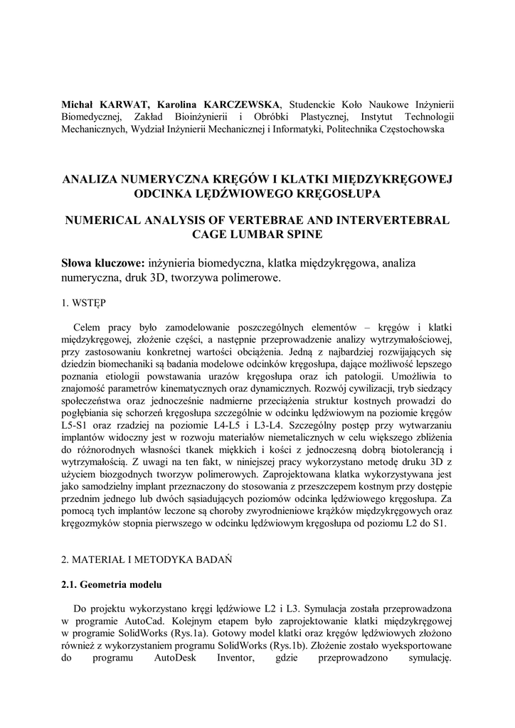 Michał KARWAT, Karolina KARCZEWSKA, Studenckie Koło Naukowe Inżynierii Biomedycznej, Zakład Bioinżynierii i Obróbki Plastycznej, Instytut Technologii Mechanicznych, Wydział Inżynierii Mechanicznej i Informatyki, Politechnika Częstochowska ANALIZA NUMERYCZNA KRĘGÓW I KLATKI MIĘDZYKRĘGOWEJ ODCINKA LĘDŹWIOWEGO KRĘGOSŁUPA NUMERICAL ANALYSIS OF VERTEBRAE AND INTERVERTEBRAL CAGE LUMBAR SPINE Słowa kluczowe: inżynieria biomedyczna, klatka międzykręgowa, analiza numeryczna, druk 3D, tworzywa polimerowe. 1. WSTĘP Celem pracy było zamodelowanie poszczególnych elementów – kręgów i klatki międzykręgowej, złożenie części, a następnie przeprowadzenie analizy wytrzymałościowej, przy zastosowaniu konkretnej wartości obciążenia. Jedną z najbardziej rozwijających się dziedzin biomechaniki są badania modelowe odcinków kręgosłupa, dające możliwość lepszego poznania etiologii powstawania urazów kręgosłupa oraz ich patologii. Umożliwia to znajomość parametrów kinematycznych oraz dynamicznych. Rozwój cywilizacji, tryb siedzący społeczeństwa oraz jednocześnie nadmierne przeciążenia struktur kostnych prowadzi do pogłębiania się schorzeń kręgosłupa szczególnie w odcinku lędźwiowym na poziomie kręgów L5-S1 oraz rzadziej na poziomie L4-L5 i L3-L4. Szczególny postęp przy wytwarzaniu implantów widoczny jest w rozwoju materiałów niemetalicznych w celu większego zbliżenia do różnorodnych własności tkanek miękkich i kości z jednoczesną dobrą biotolerancją i wytrzymałością. Z uwagi na ten fakt, w niniejszej pracy wykorzystano metodę druku 3D z użyciem biozgodnych tworzyw polimerowych. Zaprojektowana klatka wykorzystywana jest jako samodzielny implant przeznaczony do stosowania z przeszczepem kostnym przy dostępie przednim jednego lub dwóch sąsiadujących poziomów odcinka lędźwiowego kręgosłupa. Za pomocą tych implantów leczone są choroby zwyrodnieniowe krążków międzykręgowych oraz kręgozmyków stopnia pierwszego w odcinku lędźwiowym kręgosłupa od poziomu L2 do S1. 2. MATERIAŁ I METODYKA BADAŃ 2.1. Geometria modelu Do projektu wykorzystano kręgi lędźwiowe L2 i L3. Symulacja została przeprowadzona w programie AutoCad. Kolejnym etapem było zaprojektowanie klatki międzykręgowej w programie SolidWorks (Rys.1a). Gotowy model klatki oraz kręgów lędźwiowych złożono również z wykorzystaniem programu SolidWorks (Rys.1b). Złożenie zostało wyeksportowane do programu AutoDesk Inventor, gdzie przeprowadzono symulację. XIII Konferencja Naukowa Majówka Młodych Biomechaników im. prof. Dagmary Tejszerskiej s. 66 W dalszej części pracy stworzona geometria modelu kręgów oraz klatki międzykręgowej została zapisana w formacie STL, co umożliwiło wydruk 3D. Rys.1. Klatka międzykręgowa (a), umieszczenie klatki między kręgami (b) 2.2 Model materiału Każdy model kręgów wraz z klatką międzykręgową został wydrukowany przy użyciu trzech materiałów: polietylenu (PET), poliwęglanu (PC) oraz polilaktydu (PLA). Wymienione materiały charakteryzują się następującymi cechami: biotolerancją, odpornością na korozję oraz dobrą wytrzymałością przy obciążeniu statycznym i dynamicznym. 2.3 Analiza MES Model numeryczny zbudowano w systemie AutoDesk Inventor w celu wyznaczenia stanu przemieszczeń i naprężeń w częściach składowych implantu i kręgów. Po dyskretyzacji modelu utwierdzono całkowicie wybraną powierzchnię oraz nałożono siłę o wartości 150 N. Symulację przeprowadzono w trzech etapach: przed nałożeniem obciążenia, w trakcie obciążenia oraz po całkowitym obciążeniu. LITERATURA [1] Gzik M.: Biomechanika kręgosłupa człowieka. Wyd. Politechniki Śląskiej, Gliwice 2007 [2] Borkowki P.: Analiza Biomechaniczna Sztucznego Krążka Międzykręgowego. BioAlgorithms And Med.-Systems, Vol.1/2,2005, pp.143-146 [3] Ciupik L., Kierzykowska A.,Jędrych Ł.: Biomateriały stosowane na implanty DERO: historia, współczesność, przyszłość. Spondyloimplantologia zaawansowanego leczenia kręgosłupa systemem DERO, Zielona Góra 2005, s.37-46