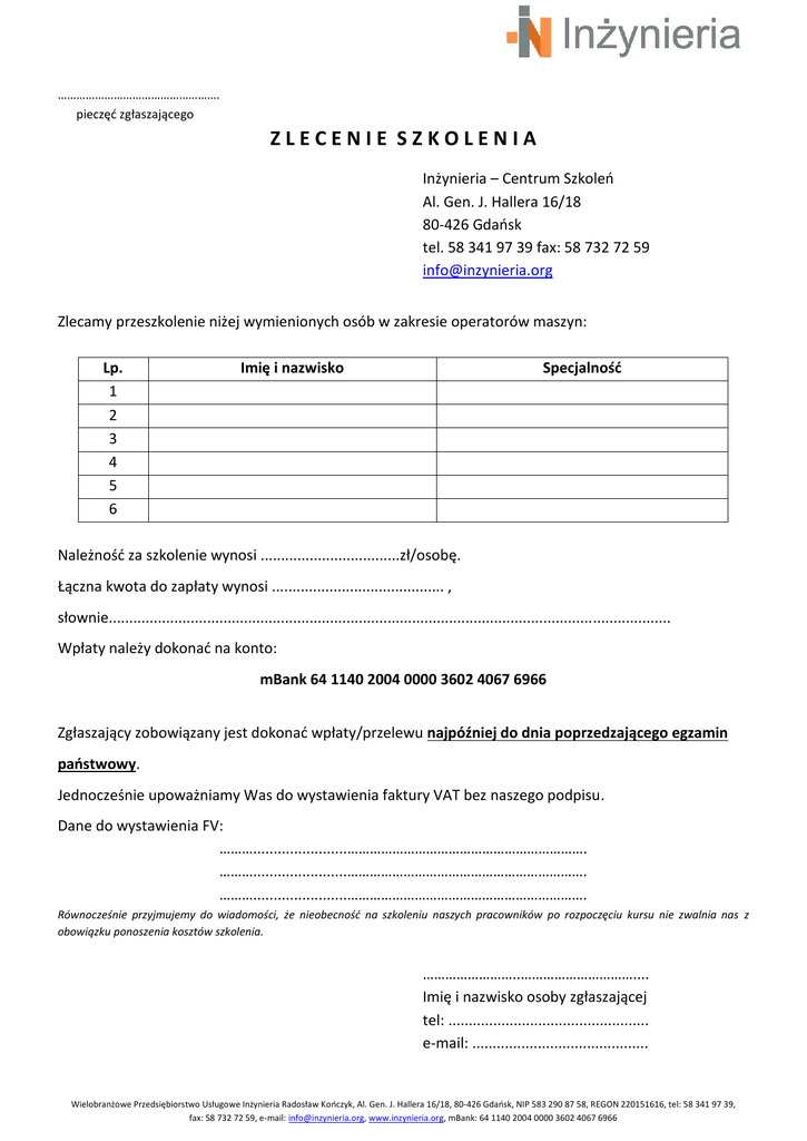 ……………………………………………. pieczęć zgłaszającego ZLECENIE SZKOLENIA Inżynieria – Centrum Szkoleń Al. Gen. J. Hallera 16/18 80-426 Gdańsk tel. 58 341 97 39 fax: 58 732 72 59 [email protected] Zlecamy przeszkolenie niżej wymienionych osób w zakresie operatorów maszyn: Lp. 1 2 3 4 5 6 Imię i nazwisko Specjalność Należność za szkolenie wynosi ..................................zł/osobę. Łączna kwota do zapłaty wynosi .......................................... , słownie......................................................................................................................................... Wpłaty należy dokonać na konto: mBank 64 1140 2004 0000 3602 4067 6966 Zgłaszający zobowiązany jest dokonać wpłaty/przelewu najpóźniej do dnia poprzedzającego egzamin państwowy. Jednocześnie upoważniamy Was do wystawienia faktury VAT bez naszego podpisu. Dane do wystawienia FV: ……….......................………………………………………………………. ……….......................………………………………………………………. ……….......................………………………………………………………. Równocześnie przyjmujemy do wiadomości, że nieobecność na szkoleniu naszych pracowników po rozpoczęciu kursu nie zwalnia nas z obowiązku ponoszenia kosztów szkolenia. ……………………..………………………….... Imię i nazwisko osoby zgłaszającej tel: ................................................. e-mail: ........................................... Wielobranżowe Przedsiębiorstwo Usługowe Inżynieria Radosław Kończyk, Al. Gen. J. Hallera 16/18, 80-426 Gdańsk, NIP 583 290 87 58, REGON 220151616, tel: 58 341 97 39, fax: 58 732 72 59, e-mail: [email protected], www.inzynieria.org, mBank: 64 1140 2004 0000 3602 4067 6966
