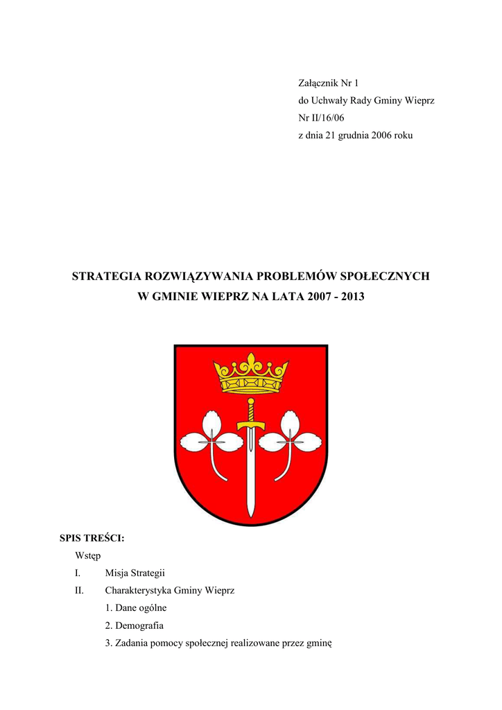 Załącznik Nr 1 do Uchwały Rady Gminy Wieprz Nr II/16/06 z dnia 21 grudnia 2006 roku STRATEGIA ROZWIĄZYWANIA PROBLEMÓW SPOŁECZNYCH W GMINIE WIEPRZ NA LATA 2007 - 2013 SPIS TREŚCI: Wstęp I. Misja Strategii II. Charakterystyka Gminy Wieprz 1. Dane ogólne 2. Demografia 3. Zadania pomocy społecznej realizowane przez gminę III. Diagnoza i analiza problemów społecznych A. Charakterystyka problemów społecznych 1. Ubóstwo. 1.1 Ogólne zdefiniowanie problemu 1.2 Rozmiary problemu i analiza danych 1.3 Konkluzje 2. Bezrobocie 2.1 Ogólne zdefiniowanie problemu 2.2 Rozmiary problemu i analiza danych 2.3 Konkluzje 3. Niepełnosprawność 3.1 Ogólne zdefiniowanie problemu 3.2 Rozmiary problemu i analiza danych 3.3 Konkluzje 4. Długotrwała lub ciężka choroba 4.1 Ogólne zdefiniowanie problemu 4.2 Rozmiary problemu i analiza danych 4.3 Konkluzje 5. Starość 5.1 Ogólne zdefiniowanie problemu 5.2 Rozmiary problemu i analiza danych 5.3 Konkluzje 6. Alkoholizm 6.1 Ogólne zdefiniowanie problemu 2 6.2 Rozmiary problemu i analiza danych 6.3 Konkluzje 7. Przemoc w rodzinie 7.1 Ogólne zdefiniowanie problemu 7.2 Rozmiary problemu i analiza danych 7.3 Konkluzje 8. Bezradność w sprawach opiekuńczo-wychowawczych i prowadzeniu gospodarstwa domowego 8.1 Ogólne zdefiniowanie problemu 8.2 Rozmiary problemu i analiza danych 8.3 Konkluzje 9. Trudności w przystosowaniu do życia po opuszczeniu zakładu karnego. 9.1 Ogólne zdefiniowanie problemu 9.2 Rozmiary problemu i analiza danych 9.3 Konkluzje 10. Gospodarka mieszkaniowa 10.1 Ogólne zdefiniowanie problemu 10.2 Rozmiary problemu i analiza danych 10.3 Konkluzje B. Zasoby i możliwości w Gminie Wieprz C. Deficyty i ograniczenia w Gminie Wieprz IV. Cele i działania. V. Ewaluacja Strategii Rozwiązywania Problemów Społecznych. 3 Wstęp Przeobrażenia ustrojowe w Polsce wywarły znaczny wpływ na wszystkie dziedziny życia społecznego. Konsekwencją przystąpienia Polski do Unii Europejskiej jest pojawienie się nowych zadań z zakresu polityki społecznej. Realizacja zadań postawionych przed pomocą społeczną na poziomie społeczności lokalnej, jak i na poziomie rodziny i jednostki 4 oraz konieczność wypracowania ustawowych i niekonwencjonalnych form pomocy, wymaga profesjonalnego oraz systemowego diagnozowania problemów w skali gminy. Strategia Rozwiązywania Problemów Społecznych określa najważniejsze działania, które należy zrealizować, aby umożliwić osobom i rodzinom przezwyciężenie trudnych sytuacji życiowych, których nie są one w stanie pokonać wykorzystując własne środki, możliwości i uprawnienia, a tym samym zmienić stan rzeczy występujących w obrębie danej społeczności, które oceniane są negatywnie i przyczynić się do rozwoju społeczności. Przy opracowaniu Gminnej Strategii Rozwiązywania Problemów Społecznych oraz wszystkich programów i projektów, budowanych dla osiągnięcia celów tej strategii konieczne jest uwzględnienie następujących zasad: Solidarności - tworzenie w gminie wspólnoty zdolnej do generowania procesów samopomocy, przedkładanie wspólnych interesów członków społeczeństwa nad interesami poszczególnych klas lub warstw. Pomocniczości - przyjęcie określonego porządku, w jakim różne instytucje społeczne dostarczają jednostce wsparcia, gdy samodzielnie nie jest w stanie zaspokoić swoich potrzeb. Dobra wspólnego - takie działania władz publicznych, które uwzględniają korzyści i interesy wszystkich obywateli i polegają na szukaniu kompromisów, gdzie interesy te są sprzeczne. Samopomocy - istnienie i rozwój pomocy wzajemnej ludzi zmagających się z podobnymi problemami życiowymi oraz pomocy silniejszych dla słabszych, zazwyczaj w ramach nieformalnych grup. Przezorności - bezpieczeństwo socjalne jednostki nie może być efektem świadczeń ze strony społeczeństwa, ale wynikać powinno także z odpowiedzialności człowieka za przyszłość własną i rodziny. Wielosektorowości - równoczesne funkcjonowanie publicznych podmiotów polityki społecznej, organizacji pozarządowych i instytucji rynkowych działających dla wspólnego dobra społeczeństwa. Obowiązek opracowania Strategii Rozwiązywania Problemów Społecznych wynika wprost z art. 17 ust. 1 ustawy o pomocy społecznej z dnia 12 marca 2004r. (Dz. U. Nr 64, 5 poz. 593 z późn. zm.) w brzmieniu: „Do zadań własnych gminy o charakterze obowiązkowym należy: 1. opracowanie i realizacja gminnej strategii rozwiązywania problemów społecznych ze szczególnym uwzględnieniem programów pomocy społecznej, profilaktyki i rozwiązywania problemów alkoholowych i innych, których celem jest integracja osób i rodzin z grup szczególnego ryzyka;” Przy opracowywaniu dokumentu wzięto pod uwagę także inne akty prawne: - ustawa z dnia 24 kwietnia 2003r. o działalności pożytku publicznego i o wolontariacie (Dz. U. z 2003r. Nr 96, poz. 873 z późn. zm.), - ustawa z dnia 13 czerwca 2003r. o zatrudnieniu socjalnym (Dz. U. z 2003r. Nr 122, poz. 1143 z późn.zm.), - ustawa z dnia 20 kwietnia 2004r. o promocji zatrudnienia i instytucjach rynku pracy (Dz. U. z 2004r. Nr 99, poz. 1001), - ustawa z dnia 26 października 1982r. o wychowaniu w trzeźwości i przeciwdziałaniu alkoholizmowi (Dz. U. z 2002r. Nr 147, poz. 1231 z późn. zm.), - ustawa z dnia 27 sierpnia 1997r. o rehabilitacji zawodowej i społecznej oraz zatrudnianiu osób niepełnosprawnych (Dz. U. z 1997r. Nr 123, poz. 776 z późn. zm. ), - ustawa z dnia 28 listopada 2003r. o świadczeniach rodzinnych (Dz. U. z 2003r. Nr 228, poz. 2255 z późn. zm.), - ustawa z dnia 29 lipca 2005r. o przeciwdziałaniu przemocy w rodzinie (Dz. U. z 2005r. Nr 180 poz. 1493), - ustawa z dnia 19 sierpnia 1994r. o ochronie zdrowia psychicznego (Dz. U. z 1994r. Nr 111, poz. 535 z późn. zm.), - ustawa z dnia 7 września 1991r. o systemie oświaty (Dz. U. z 2003r. Nr 58, poz. 514 z późn. zm.), - ustawa z dnia 20 grudnia 1996r. o gospodarce k