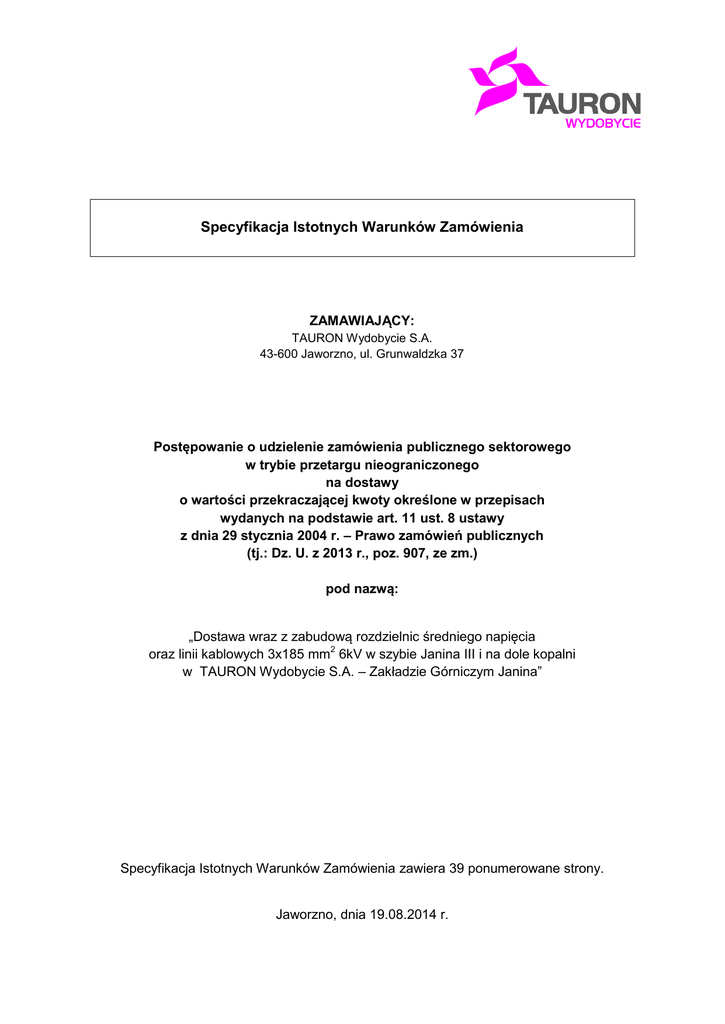 Specyfikacja Istotnych Warunków Zamówienia ZAMAWIAJĄCY: TAURON Wydobycie S.A. 43-600 Jaworzno, ul. Grunwaldzka 37 Postępowanie o udzielenie zamówienia publicznego sektorowego w trybie przetargu nieograniczonego na dostawy o wartości przekraczającej kwoty określone w przepisach wydanych na podstawie art. 11 ust. 8 ustawy z dnia 29 stycznia 2004 r. – Prawo zamówień publicznych (tj.: Dz. U. z 2013 r., poz. 907, ze zm.) pod nazwą: „Dostawa wraz z zabudową rozdzielnic średniego napięcia oraz linii kablowych 3x185 mm2 6kV w szybie Janina III i na dole kopalni w TAURON Wydobycie S.A. – Zakładzie Górniczym Janina” Specyfikacja Istotnych Warunków Zamówienia zawiera 39 ponumerowane strony. Jaworzno, dnia 19.08.2014 r. Nr referencyjny: 37/2014/EEZP/JW SPIS TREŚCI: Rozdział 1. Informacje ogólne ........................................................................................... 4 1.1. Dane Zamawiającego .............................................................................................. 4 1.2. Oznaczenie jednostki organizacyjnej lub osoby trzeciej, której powierzono przeprowadzenie Postępowania .............................................................................. 4 1.3. Udzielenie zamówienia w imieniu innych Zamawiających ........................................ 4 1.4. Informacje o sposobie porozumiewania się Zamawiającego z Wykonawcami ......... 4 1.5. Wykaz osób uprawnionych ze strony Zamawiającego do porozumiewania się z Wykonawcami ....................................................................................................... 5 1.6. Tryb udzielenia zamówienia ..................................................................................... 5 1.7. Definicje: .................................................................................................................. 5 Rozdział 2. Przedmiot Zamówienia ................................................................................... 7 2.1. Opis Przedmiotu Zamówienia .................................................................................. 7 2.2. Informacja o dopuszczalności składania Ofert częściowych ...................................12 2.3. Informacja o dopuszczalności składania Ofert wariantowych ..................................13 2.4. Informacja o warunkach zawarcia Umowy ramowej ................................................13 2.5. Informacja o prawie opcji oraz zamówieniach uzupełniających ...............................13 2.6. Miejsce realizacji zamówienia .................................................................................13 2.7. Termin wykonania zamówienia ...............................................................................13 Rozdział 3. Warunki udziału Wykonawców w Postępowaniu ............................................14 3.1. Warunki udziału w Postępowaniu oraz opis sposobu dokonywania oceny spełnienia tych warunków ........................................................................................................14 3.2. Dokumenty lub oświadczenia jakie mają dostarczyć Wykonawcy w celu potwierdzenia spełnienia warunków udziału w Postępowaniu .................................15 3.3. Wymagania dla dostaw oraz dokumenty i oświadczenia na potwierdzenie spełnienia tych wymagań.........................................................................................................19 3.4. Informacje dla Wykonawców wspólnie ubiegających się o udzielenie zamówienia .20 3.5. Zasady udziału podwykonawców ............................................................................21 3.6. Zasady korzystania z potencjału osób trzecich .......................................................22 Rozdział 4. Postępowanie ...............................................................................................23 4.1. Zasady udzielania wyjaśnień dotyczących treści SIWZ ...........................................23 4.2. Opis sposobu przygotowania oferty ........................................................................23 4.2.1. Zawartość oferty .......................................................................................23 4.2.2. Szczegółowy opis sposobu przygotowywania oferty .................................24 4.2.3. Opis sposobu obliczenia Ceny ..................................................................26 4.2.4. Termin związania ofertą ............................................................................26 4.2.5. Zmiana lub wycofanie oferty......................................................................27 2 Nr referencyjny: 37/2014/EEZP/JW 4.2.6. Miejsce oraz termin składania ofert, zwrot oferty .......................................27 4.2.7. Wyjaśnienia dotyczące treści składanych ofert i poprawiania oczywistych omyłek ......................................................................................................27 4.3. Wymagania dotyczące wadium...............................................................................28 4.3.1. Wysokość wadium ....................................................................................28 4.3.2. Forma wadium ..........................................................................................28 4.3.3. Termin i miejsce wniesienia wadium .........................................................29 4.3.4. Zwrot, zatrzymanie wadium .......................................................................29 4.4. Otwarcie ofert .........................................................................................................29 4.5. Opis kryteriów, którymi Zamawiający będzie się kierował przy wyborze oferty, wraz z podaniem znaczenia tych kryteriów i sposobu oceny ofert ...................................30 4.5.1. Przyjęte kryteria i przypisane wagi: ...........................................................30 4.5.2. Sposób oceny ofert .........................