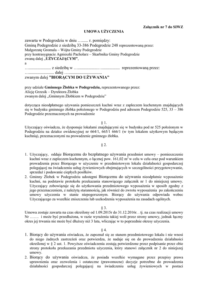 Załącznik nr 7 do SIWZ UMOWA UŻYCZENIA zawarta w Podegrodziu w dniu …...... r. pomiędzy: Gminą Podegrodzie z siedzibą 33-386 Podegrodzie 248 reprezentowaną przez: Małgorzatę Gromala – Wójta Gminy Podegrodzie przy kontrasygnacie Agnieszki Pacholarz – Skarbnika Gminy Podegrodzie zwaną dalej „UŻYCZAJĄCYM”, a …..................... z siedzibą w …...................…................. reprezentowaną przez: …........................ dalej …................................ zwanym dalej ”BIORĄCYM DO UŻYWANIA” przy udziale Gminnego Żłobka w Podegrodziu, reprezentowanego przez: Alicję Grzesik – Dyrektora Żłobka zwanym dalej „Gminnym Żłobkiem w Podegrodziu” dotycząca nieodpłatnego używania pomieszczeń kuchni wraz z zapleczem kuchennym znajdujących się w budynku gminnego żłobka położonego w Podegrodziu pod adresem Podegrodzie 525, 33 – 386 Podegrodzie przeznaczonych na prowadzenie § 1. Użyczający oświadcza, że dysponuje lokalami znajdującymi się w budynku pod nr 525 położonym w Podegrodziu na działce ewidencyjnej nr 664/1, 665/1 666/1 (w tym lokalem użytkowym będącym kuchnią), przeznaczonymi na prowadzenie gminnego żłobka. § 2. 1. Użyczający, oddaje Biorącemu do bezpłatnego używania przedmiot umowy – pomieszczenie kuchni wraz z zapleczem kuchennym, o łącznej pow. 161,02 m2 w celu w celu oraz pod warunkiem prowadzenia przez Biorącego w użyczenie w przedmiotowym lokalu działalności gospodarczej polegającej na świadczeniu usług żywieniowych obejmujących w szczególności przygotowywanie, sprzedaż i podawanie ciepłych posiłków. 2. Gminny Żłobek w Podegrodziu udostępni Biorącemu do używania nieodpłatnie wyposażenie kuchni, na podstawie protokołu przekazania stanowiącego załącznik nr 1 do niniejszej umowy. Użyczający zobowiązuje się do użytkowania przedmiotowego wyposażenia w sposób zgodny z jego przeznaczeniem, z należytą starannością, jak również do zwrotu wyposażenia po zakończeniu umowy użyczenia w stanie niepogorszonym. Biorący do używania odpowiada wobec Użyczającego za wszelkie zniszczenia lub uszkodzenia wyposażenia na zasadach ogólnych. § 3. Umowa zostaje zawarta na czas określony od 1.09.2015r do 31.12.2016r. . tj. na czas realizacji umowy Nr ……. i może być przedłużona, w razie wyrażenia takiej woli przez strony umowy, jednak łączny okres jej trwania nie może być dłuższy niż 3 lata, wliczając w to poprzednie okresy użyczenia. § 4. 1. Biorący do używania oświadcza, że zapoznał się ze stanem przedmiotowego lokalu i nie wnosi do niego żadnych zastrzeżeń oraz potwierdza, że nadaje się on do prowadzenia działalności określonej w § 2 ust. 1. Powyższe oświadczenia zostają potwierdzone przez podpisanie przez obie strony protokołu przekazania przedmiotu użyczenia, który stanowi załącznik nr 2 do niniejszej umowy. 2. Biorący do używania oświadcza, że posiada wszelkie wymagane przez przepisy prawa uprawnienia oraz zezwolenia i ostateczne (prawomocne) decyzje potrzebne do prowadzenia działalności gospodarczej polegającej na świadczeniu usług żywieniowych w postaci przygotowywania i podawania ciepłych posiłków i zobowiązuje się do każdorazowego okazania stosownych dokumentów potwierdzających posiadanie powyższych uprawnień, zezwoleń i decyzji – na każde żądanie Użyczającego. 3. Biorący do używania oświadcza, że usługi żywieniowe świadczone w lokalu udostępnionym w ramach niniejszej umowy świadczy na własną odpowiedzialność i ryzyko. W przypadku wystąpienia jakiejkolwiek szkody po stronie osób trzecich, odpowiedzialność Użyczającego jest wyłączona, zaś Biorący do używania odpowiada na zasadach ogólnych w pełnym zakresie. 4. Użyczający oświadcza, że wyraża zgodę na prowadzenie w przedmiotowym lokalu działalności gospodarczej, o której mowa w § 2 ust. 1. §5. 1. Użyczający zapewni Biorącemu do używania dostęp do mediów i instalacji komunalnych, tj. do energii elektrycznej oraz sieci wodnej i kanalizacji. 2. Biorący do używania zobowiązuje się do pokrywania kosztów związanych z utrzymaniem przedmiotu umowy a w szczególności kosztów zużycia energii elektrycznej, ogrzewania. 3. Biorący do używania kosztami, o których mowa w ust. 2, zostanie obciążony; 1) przez Użyczającego wg nast. klucza; a) koszty energii elektrycznej dla ogrzewania, klimatyzacji, oświetlenia zewnętrznego, wytwarzania ciepłej wody – wg. wskaźnika procentowego zajmowanej powierzchni do powierzchni ogółem, b) energia elektryczna – wg wskazań podlicznika, c) koszty zużycia wody – wg wskazań wodomierza, d) ścieków – wg zużycia wody (tj. wg wskazań wodomierza) na podstawie wystawionej co miesiąc faktury VAT rachunku płatnej w terminie do 20 każdego miesiąca za miesiąc poprzedni; 2) bezpośrednio przez dostawcę usługi wywozu nieczystości stałych i dostawa gazu butlowego. 4. Strony zgodnie postanawiają, że do czasu zainstalowania podliczników, wodomierzy, o których mowa w ust. 3, obciążenia z tytułu użytkowania lokalu wyliczane będą na podstawie szacunku. § 6. 1. Biorący do używania zobowiązuje się do: 1) używania użyczonego lokalu z należytą starannością, zgodnie z jego przeznaczeniem i właściwościami oraz prowadzenia w nim działalności w ramach i zgodnie z posiadanymi zezwoleniami oraz obowiązującymi przepisami prawa, 2) niezmieniania przeznaczenia przedmiotu użyczenia bez porozumienia i pisemnej zgody Użyczającego, 3) nie dokonywania bez uprzedniej pisemnej zgody Użyczającego jakichkolwiek zmian w przedmiocie użyczenia, 4) pokrywania kosztów drobnych napraw i prac konserwacyjnych lokalu, które z mocy prawa obciążają użyczonego, 5) utrzymywania właściwego stanu pomieszczeń i instalacji wewnętrznych oraz zapewnienia ich prawidłowej eksploatacji. 2. Biorący do używania nie może oddawać przedmiotu użyczenia osob