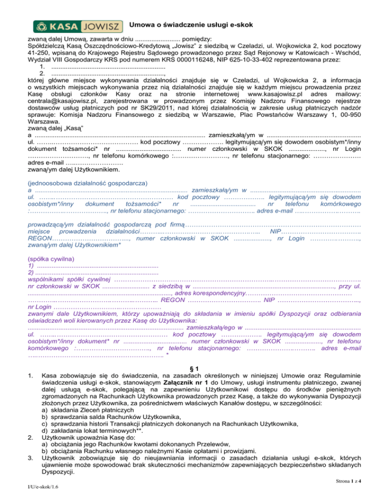 Umowa o świadczenie usługi e-skok zwaną dalej Umową, zawarta w dniu ......................... pomiędzy: Spółdzielczą Kasą Oszczędnościowo-Kredytową „Jowisz” z siedzibą w Czeladzi, ul. Wojkowicka 2, kod pocztowy 41-250, wpisaną do Krajowego Rejestru Sądowego prowadzonego przez Sąd Rejonowy w Katowicach - Wschód, Wydział VIII Gospodarczy KRS pod numerem KRS 0000116248, NIP 625-10-33-402 reprezentowana przez: 1. ............................................................... 2. .............................................................., której główne miejsce wykonywania działalności znajduje się w Czeladzi, ul Wojkowicka 2, a informacja o wszystkich miejscach wykonywania przez nią działalności znajduje się w każdym miejscu prowadzenia przez Kasę obsługi członków Kasy oraz na stronie internetowej www.kasajowisz.pl adres mailowy: [email protected], zarejestrowana w prowadzonym przez Komisję Nadzoru Finansowego rejestrze dostawców usług płatniczych pod nr SK29/2011, nad której działalnością w zakresie usług płatniczych nadzór sprawuje: Komisja Nadzoru Finansowego z siedzibą w Warszawie, Plac Powstańców Warszawy 1, 00-950 Warszawa. zwaną dalej „Kasą” a .............................................................................................. zamieszkałą/ym w .................................................... ul. ……..………………………………… kod pocztowy ………………. legitymującą/ym się dowodem osobistym*/inny dokument tożsamości* nr .................................... numer członkowski w SKOK ...................., nr Login ………………………., nr telefonu komórkowego :……………………., nr telefonu stacjonarnego: …………………. adres e-mail …..…………………. zwaną/ym dalej Użytkownikiem. (jednoosobowa działalność gospodarcza) a .................................................................................... zamieszkałą/ym w ............................................................. ul. ……..……………………………………………… kod pocztowy ………………. legitymującą/ym się dowodem osobistym*/inny dokument tożsamości* nr .................................... nr telefonu komórkowego :……………..………………., nr telefonu stacjonarnego: …………………………. adres e-mail …..…………….………. prowadzącą/ym działalność gospodarczą pod firmą……………………………………………………………………… miejsce prowadzenia działalności………...……………………...………….….. NIP………………………………. REGON……………………………..., numer członkowski w SKOK ...................., nr Login ………….………., zwaną/ym dalej Użytkownikiem* (spółka cywilna) 1) ................................................................... 2) .................................................................... wspólnikami spółki cywilnej ………………………………………………………………..…………………………………. nr członkowski w SKOK .......................... z siedzibą w .............................................................................., przy ul. ..............................................................................., adres korespondencyjny.………………………………………… …………..…………………….………..……….. REGON ……………………………. NIP ……………………………….., nr Login …………………………..……………… zwanymi dale Użytkownikiem, którzy upoważniają do składania w imieniu spółki Dyspozycji oraz odbierania oświadczeń woli kierowanych przez Kasę do Użytkownika: ...................................................................................... zamieszkałą/ego w ................................................................ ul. ……..…………………………………………… kod pocztowy ………………. legitymującą/ym się dowodem osobistym*/inny dokument* nr ................................... numer członkowski w SKOK ...................., nr telefonu komórkowego :……………………………., nr telefonu stacjonarnego: ………………….………. adres e-mail …..…………………………………………………. * 1. 2. 3. §1 Kasa zobowiązuje się do świadczenia, na zasadach określonych w niniejszej Umowie oraz Regulaminie świadczenia usługi e-skok, stanowiącym Załącznik nr 1 do Umowy, usługi instrumentu płatniczego, zwanej dalej usługą e-skok, polegającą na zapewnieniu Użytkownikowi dostępu do środków pieniężnych zgromadzonych na Rachunkach Użytkownika prowadzonych przez Kasę, a także do wykonywania Dyspozycji złożonych przez Użytkownika, za pośrednictwem właściwych Kanałów dostępu, w szczególności: a) składania Zleceń płatniczych b) sprawdzania salda Rachunków Użytkownika, c) sprawdzania historii Transakcji płatniczych dokonanych na Rachunkach Użytkownika, d) zakładania lokat terminowych**. Użytkownik upoważnia Kasę do: a) obciążania jego Rachunków kwotami dokonanych Przelewów, b) obciążania Rachunku własnego należnymi Kasie opłatami i prowizjami. Użytkownik zobowiązuje się do nieujawniania informacji o zasadach działania usługi e-skok, których ujawnienie może spowodować brak skuteczności mechanizmów zapewniających bezpieczeństwo składanych Dyspozycji. Strona 1 z 4 I/U/e-skok/1.6 §2 Rachunkiem własnym Użytkownika będzie Rachunek nr………………………………………………………………. 1. 2. 1. 2. 3. 4. 5. 6. 7. 1. 2. 3. 4. 5. 6. 1. 2. 1. 2. 3. 4. 5. 1. 2. §3 Usługa e-skok udostępniana jest po zawarciu Umowy, najpóźniej w ciągu 24 godzin od jej zawarcia. Korzystanie z usługi e-skok jest możliwe za pośrednictwem: a) s
