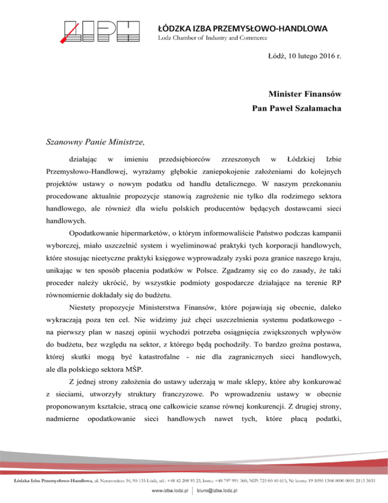 Łódź, 10 lutego 2016 r. Minister Finansów Pan Paweł Szałamacha Szanowny Panie Ministrze, działając w imieniu przedsiębiorców zrzeszonych w Łódzkiej Izbie Przemysłowo-Handlowej, wyrażamy głębokie zaniepokojenie założeniami do kolejnych projektów ustawy o nowym podatku od handlu detalicznego. W naszym przekonaniu procedowane aktualnie propozycje stanowią zagrożenie nie tylko dla rodzimego sektora handlowego, ale również dla wielu polskich producentów będących dostawcami sieci handlowych. Opodatkowanie hipermarketów, o którym informowaliście Państwo podczas kampanii wyborczej, miało uszczelnić system i wyeliminować praktyki tych korporacji handlowych, które stosując nieetyczne praktyki księgowe wyprowadzały zyski poza granice naszego kraju, unikając w ten sposób płacenia podatków w Polsce. Zgadzamy się co do zasady, że taki proceder należy ukrócić, by wszystkie podmioty gospodarcze działające na terenie RP równomiernie dokładały się do budżetu. Niestety propozycje Ministerstwa Finansów, które pojawiają się obecnie, daleko wykraczają poza ten cel. Nie widzimy już chęci uszczelnienia systemu podatkowego na pierwszy plan w naszej opinii wychodzi potrzeba osiągnięcia zwiększonych wpływów do budżetu, bez względu na sektor, z którego będą pochodziły. To bardzo groźna postawa, której skutki mogą być katastrofalne - nie dla zagranicznych sieci handlowych, ale dla polskiego sektora MŚP. Z jednej strony założenia do ustawy uderzają w małe sklepy, które aby konkurować z sieciami, utworzyły struktury franczyzowe. Po wprowadzeniu ustawy w obecnie proponowanym kształcie, stracą one całkowicie szanse równej konkurencji. Z drugiej strony, nadmierne opodatkowanie sieci handlowych nawet tych, które płacą podatki, spowoduje tendencję do przerzucania poniesionych kosztów na polskich producentów, którzy są głównymi dostawcami hipermarketów i dyskontów. Nie zostanie zatem osiągnięty efekt opodatkowania tych, którzy nie płacą należnych podatków - proponowane przez Państwa obciążenia zapłacimy my, polscy przedsiębiorcy. Należy przy tym zwrócić uwagę, że część sieci handlu detalicznego powstała w Polsce i dzięki determinacji i przedsiębiorczości właścicieli tu właśnie się rozwinęła. Tym firmom należy się takie samo wsparcie państwa polskiego jak wszystkim innym, bo to one są w stanie w przyszłości konkurować na rynkach zagranicznych wzmacniając w ten sposób naszą gospodarkę. Dodatkowo zwracamy uwagę na brak ścisłej definicji handlu detalicznego, która przy takim podejściu fiskalnym może spowodować zobowiązania w firmach z branż B2B, które łączą przeważającą sprzedaż do innych podmiotów gospodarczych ze sprzedażą konsumencką. Mając na uwadze wszystkie powyższe fakty, stanowczo protestujemy przeciw takiemu sposobowi myślenia o nowych obciążeniach fiskalnych. W kilkuletniej perspektywie, zamiast planowanych wpływów, przyniosą one niepowetowane straty w polskiej gospodarce. Popierając jednak ideę uszczelnienia systemu proponujemy wprowadzenie jednolitej stawki opodatkowania bez progów obrotowych, które mogą budzić zastrzeżenia co do równości konkurencji i blokować rozwój firm, na poziomie nie wyższym niż 0,5% wartości przychodów ze sprzedaży netto. Jednocześnie postulujemy, aby podatek ten był naliczany narastająco i odliczany od płaconego podatku CIT w przypadku osób prawnych lub podatku PIT w przypadku osób fizycznych prowadzących działalność gospodarczą. Taki system spowoduję, że wzrost obciążeń dotknie tylko tych, którzy unikają opodatkowania. Firmy uczciwie płacące podatki, ich dostawcy i pracownicy, nie odczują żadnych negatywnych skutków. Uważamy ponadto, że należy opodatkowanie to powiązać ze sprzedażą towarów (by nie dotknęło usług) oraz ze sprzedażą konsumencką - a więc taką, która na bazie odrębnych przepisów wymaga wystawiania paragonów fiskalnych. Sprzedaż zachodząca pomiędzy podmiotami gospodarczymi powinna być z tego zwolniona. Wierząc w dobre intencje Pana Ministra mamy nadzieję, że nasze stanowisko zostanie wzięte pod uwagę, a propozycje, które uważamy za bardzo wyważone, zyskają zwolenników w ministerstwie. Naszym wspólnym celem winna być silna polska gospodarka, oparta na zasadach równości gospodarczej - tylko ona zapewni równowagę budżetową państwu i dobrobyt jego obywatelom. Licząc na odpowiedź i konkretne działania, a także deklarując współpracę przy konsultacjach projektu, z wyrazami poważania w imieniu Zarządu i Rady Łódzkiej Izby Przemysłowo-Handlowej Michał Haze Wiceprezes ŁIPH Do wiadomości: - Krajowa Izba Gospodarcza, - Posłowie i Senatorowie Ziemi Łódzkiej, - media.