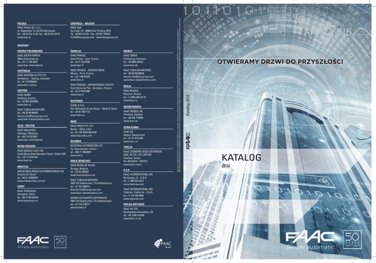 FAAC SpA Via Calari 10 - 40069 Zola Predosa (BO) Tel. +39 051 61724 - Fax +39 051 758518 [email protected] - www.faacgroup.com ODDZIAŁY AFRYKA POŁUDNIOWA FRANCJA NIEMCY FAAC SOUTH AFRICA 2040 Johannesburg tel. +27 11 794 4525 www.faac.international FAAC FRANCE Saint Priest - Lyon, France tel. +33 4 72218700 www.faac.fr FAAC GMBH Freilassing, Germany tel. +49 8654 49810 www.faac.de AUSTRALIA FAAC FRANCE - AGENCE PARIS Massy - Paris, France tel. +33 1 69191620 www.faac.fr FAAC TUBULAR MOTORS tel. +49 30 56796645 [email protected] www.faac-tubularmotors.com FAAC AUSTRALIA PTY LTD Homebush – Sydney, Australia tel. +61 2 87565644 www.faac.com.au AUSTRIA FAAC GMBH Salzburg, Austria tel. +43 662 8533950 www.faac.at FAAC TUBULAR MOTORS tel. +49 30 56796645 [email protected] www.faac-tubularmotors.com AZJA - PACYFIK FAAC MALAYSIA Selangor, Malaysia tel. +60 3 5123 0033 www.faac.international BLISKI WSCHÓD FAAC MIDDLE EAST FZE Dubai Silicon Oasis Operation Center - Dubai, UAE tel. + 971 4 3724190 www.faac.ae BRAZYLIA INDÚSTRIAS ROSSI ELETROMECÂNICA SA Brasilia DF, Brazil tel. +55 61 33998787 www.rossiportoes.com.br CHINY FAAC SHANGHAI Shanghai, China tel. +86 21 68182970 www.faacgroup.cn FAAC FRANCE - DEPARTEMENT VOLETS Saint Denis de Pile - Bordeaux, France tel. +33 5 57551890 www.faac.fr HISZPANIA CLEM, S.A.U. San Sebastián de los Reyes - Madrid, Spain tel. +34 91 3581110 www.faac.es INDIE FAAC INDIA PVT. LTD Noida – Delhi, India tel. +91 120 3934100/4199 www.faacindia.com IRLANDIA NATIONAL AUTOMATION LTD Co. Roscommon, Ireland tel. +353 71 9663893 www.nal.ie KRAJE BENELUXU FAAC BENELUX NV/SA Brugge, Belgium tel. +32 50 320202 www.faacbenelux.com FAAC TUBULAR MOTORS 7007 CN Doetinchem, The Netherlands tel. +31 475 406014 [email protected] www.faac-tubularmotors.com KEMKO AUTOMATIC ENTRANCES 7007 CN Doetinchem, The Netherlands tel. +31 314 378777 www.kemko.nl ROSJA FAAC RUSSIA Moscow, Russia tel. +7 (495) 646 24 29 www.faac.ru SKANDYNAWIA FAAC NORDIC AB Perstorp, Sweden tel. +46 435 779500 www.faac.se SZWAJCARIA FAAC AG Altdorf, Switzerland tel. +41 41 8713440 www.faac.ch TURCJA FAAC OTOMATİK GEÇİȘ SİSTEMLERİ SAN. VE TİC. LTD. SIRTEKI İstanbul, Turkey tel.+90 (0)212 - 3431311 www.faac.com.tr U.S.A. FAAC INTERNATIONAL INC Rockledge, FL - U.S.A. tel. +1 866 925 3222 www.faacusa.com FAAC INTERNATIONAL INC Fullerton, California - U.S.A. tel. +1 714 446 9800 www.faacusa.com WIELKA BRYTANIA FAAC UK LTD. Basingstoke Hampshire, UK tel. +44 1256 318100 www.faac.co.uk OTWIERAMY DRZWI DO PRZYSZŁOŚCI Katalog 2016 CENTRALA – WŁOCHY FAAC Polska Sp. z o.o. ul. Kopijników 12, 03-274 Warszawa tel.: +48 22 814 14 22, fax: +48 22 814 20 24 www.faac.pl W trosce o ciągłe doskonalenie produktów FAAC S.p.A. zastrzega sobie prawo do wprowadzania modyfi kacji technicznych bez wcześniejszego powiadomienia o zamiarze ich wprowadzenia. Wszystkie prawa zastrzeżone, powielanie w jakiejkolwiek formie, za pomocą dowolnych środków, którejkolwiek z części bądź całości niniejszego dokumentu bez zgody FAAC S.p.A. jest surowo zabronione. POLSKA KATALOG 2016 GIUSEPPE MANINI GDY POMYSŁY ZMIENIAJĄ ŚWIAT Innowacja, to umiejętność działania poza ustaloną praktyką, odwaga do przekraczania granic i tworzenia wielu nowych: są to wartości które wpłynęły na całą historię Grupy FAAC od jej powstania w 1965 roku. Tak wiele różnych rozdziałów, wszystkie oznaczone przez unikalną wizję i pionierski duch, które stanowią stały fundament, na którym Grupa kontynuuje budowę swojej pozycji w świecie. W 50 napęd hydrauliczny, porocznicę powstania firmy, FAAC korzysta z okazji, aby uczcić te wartości. czątek lat 70tych Oddaje hołd dla tym, którzy po raz pierwszy określili nowe cele, urzeczywistniające podejście, które zawsze wyróżniało firmę, jej pracowników i partnerów. Słowa uznania dle poświęcenia wynalazcy i pioniera, który znacznie poprawił jakość i wygodę naszego codziennego życia, najpierw we Włoszech, a następnie na całym świecie. Innowacyjny geniusz, który Giuseppe Manini zaszczepił i pielęgnował w firmie FAAC od początku jej powstania polega na tym, że sukces i zrównoważony, solidny biznes oparty jest na dostarczaniu prostych i skutecznych rozwiązań dla naszych codziennych potrzeb. Rozwiązań, które otworzyły drzwi do wielu, wielu innych. FAAC SpA FAAC EKOLOGIA. Innowacyjność zyskuje nowy wymiar. BEZPIECZE STWO I EKOLO IA FAAC FAAC, pionier w świecie systemów automatyki bramowej, wprowadza na rynek nowe systemy i rozwiązania stanowiące efektywną odpowiedź na zagadnienia znajdujące się w obszarze zain teresowania firmy B w O jest w pełni dostosowane do aktualnie obowiązujących norm i standardów pozwala na zmniejszenie negatywnego wpływu na środowisko, a w rezultacie, zaoferowanie odbiorcy ko cowemu bardziej przyjazne rozwiązania. FAAC Strefa C S WA. Wszystko staje się prostsze i bardziej bezpieczne. zięki Strefie C S WA FAAC jest w stanie zaproponowa systemy i lub urządzenia upraszczające wykonanie systemów automatyki, odpowiadających aktualnie obowiązującym wymogom dyrektywy maszynowej W . Strefa C S WA to szeroka gama oferowanych przez FAAC rozwiąza napędów hy draulicznych i elektromechanicznych z zasilaniem dc i ac , które dzięki zastosowaniu no wych paneli sterujących i lub nowych urządze , wśród których wymieni należy uniwersalny ko der SAF coder patent FAAC , umożliwiających nie tylko wykonanie nowych instalacji w sposób zgodny z wymaganiami ormy uropejskiej, ale i unowocześnienie już wprowadzonych instalacji, bez konieczności wymiany zainstalowanych systemów automatyki. SAFE owy, uniwersalny koder SAF coder zapewnia pełną kontrolę ruchu, natychmiastowe wykrywanie przeszkody oraz przełączanie styku, a ponadto, oferuje następujące korzy ści ożna go zainstalowa w już zamontowanych systemach uchylnych bram garażo wych z napędem hydraulicznym i elektromagnetycznym o zasilaniu ac i