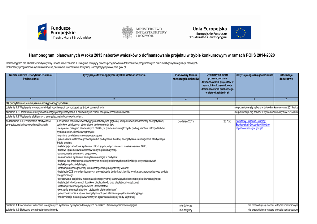 Harmonogram planowanych w roku 2015 naborów wniosków o dofinansowanie projektu w trybie konkursowym w ramach POIiŚ 2014-2020 Harmonogram ma charakter indykatywny i może ulec zmianie z uwagi na trwający proces przyjmowania dokumentów programowych oraz niezbędnych regulacji prawnych. Dokumenty programowe opublikowane są na stronie internetowej Instytucji Zarządzającej www.pois.gov.pl Numer i nazwa Priorytetu/Działania/ Poddziałania Typy projektów mogących uzyskać dofinansowanie Planowany termin rozpoczęcia naborów 1 2 4 Orientacyjna kwota Instytucja ogłaszająca konkurs przeznaczona na dofinansowanie projektów w ramach konkursu – kwota dofinansowania publicznego w złotówkach [mln zł] 5 6 Informacje dodatkowe 7 Oś priorytetowa I Zmniejszenie emisyjności gospodarki działanie 1.1 Wspieranie wytwarzania i dystrybucji energii pochodzącej ze źródeł odnawialnych nie przewiduje się naboru w trybie konkursowym w 2015 roku działanie 1.2 Promowanie efektywności energetycznej i korzystania z odnawialnych źródeł energii w przedsiębiorstwach nie przewiduje się naboru w trybie konkursowym w 2015 roku działanie 1.3 Wspieranie efektywności energetycznej w budynkach, w tym: poddziałanie 1.3.1 Wspieranie efektywności energetycznej w budynkach publicznych 1. Wsparcie projektów inwestycyjnych dotyczących głębokiej kompleksowej modernizacji energetycznej budynków publicznych obejmującej takie elementy jak: • ocieplenie, przegród zewnętrznych obiektu, w tym ścian zewnętrznych, podłóg, dachów i stropodachów wymiana okien, drzwi zewnętrznych; • wymiana oświetlenia na energooszczędne • przebudowa systemów grzewczych (lub podłączenie bardziej energetycznie i ekologicznie efektywnego źródła ciepła) ; • instalacja/przebudowa systemów chłodzących, w tym również z zastosowaniem OZE; • budowa i przebudowa systemów wentylacji i klimatyzacji, • zastosowanie automatyki pogodowej; • zastosowanie systemów zarządzania energią w budynku; • budowa lub przebudowa wewnętrznych instalacji odbiorczych oraz likwidacja dotychczasowych nieefektywnych źródeł ciepła; • instalacja mikrokogeneracji lub mikrotrigeneracji na potrzeby własne; • instalacja OZE w modernizowanych energetycznie budynkach, jeśli to wynika z przeprowadzonego audytu energetycznego • opracowanie projektów modernizacji energetycznej stanowiących element projektu inwestycyjnego; • instalacja indywidualnych liczników ciepła, chłodu oraz ciepłej wody użytkowej; • instalacja zaworów podpionowych i termostatów, • tworzenie zielonych dachów i „żyjących, zielonych ścian”, • przeprowadzenie audytów energetycznych jako elementu projektu inwestycyjnego • modernizacja instalacji wewnętrznych ogrzewania i ciepłej wody użytkowej działanie 1.4 Rozwijanie i wdrażanie inteligentnych systemów dystrybucji działających na niskich i średnich poziomach napięcia działanie 1.5 Efektywna dystrybucja ciepła i chłodu grudzień 2015 nie dotyczy nie dotyczy 207,50 Narodowy Fundusz Ochrony Środowiska i Gospodarki Wodnej http://www.nfosigw.gov.pl/ nie przewiduje się naboru w trybie konkursowym nie przewiduje się naboru w trybie konkursowym Harmonogram planowanych w roku 2015 naborów wniosków o dofinansowanie projektu w trybie konkursowym 1 POIiŚ 2014-2020 2 4 5 6 7 działanie 1.6 Promowanie wykorzystywania wysokosprawnej kogeneracji ciepła i energii elektrycznej w oparciu o zapotrzebowanie na ciepło użytkowe nie przewiduje się naboru w trybie konkursowym w 2015 roku działanie 1.7 Kompleksowa likwidacja niskiej emisji na terenie konurbacji śląsko –dąbrowskiej nie przewiduje się naboru w trybie konkursowym w 2015 roku Oś priorytetowa II Ochrona środowiska, w tym adaptacja do zmian klimatu działanie 2.1 Adaptacja do zmian klimatu wraz z zabezpieczeniem i zwiększeniem odporności na klęski żywiołowe, w szczególności katastrofy naturalne oraz monitoring środowiska działanie 2.2. Gospodarka odpadami komunalnymi Projekty obejmujące swoim zakresem elementy gospodarki odpadami zgodnej z hierarchią sposobów postępowania z odpadami z wyłączeniem instalacji do termicznego przekształcania odpadów grudzień 2015 100,00 Narodowy Fundusz Ochrony Środowiska i Gospodarki Wodnej http://www.nfosigw.gov.pl/ działanie 2.3 Gospodarka wodno-ściekowa w aglomeracjach Projekty dotyczące gospodarki wodno-ściekowej, realizowane w aglomeracjach o wielkości co najmniej 10 000 RLM listopad 2015 4 500,00 Projekty dotyczące gospodarki wodno-ściekowej realizowane w regionach lepiej rozwiniętych w aglomeracjach o wielkości od 2 000 RLM do 10 000 RLM listopad 2015 500,00 Ochrona in-situ lub ex-situ zagrożonych gatunków i siedlisk przyrodniczych: Działania o charakterze dobrych praktyk, związane z ochroną zagrożonych gatunków i siedlisk przyrodniczych listopad 2015 25,00 Opracowanie instrumentów planistycznych dla Natury 2000: planów ochrony listopad 2015 10,00 Rozwój bazy ośrodków prowadzących działalność w zakresie edukacji ekologicznej: Rozwój bazy ośrodków prowadzących działalność w zakresie edukacji podlegających parkom narodowym grudzień 2015 30,00 Wsparcie dla zanieczyszczonych lub zdegradowanych terenów listopad 2015 40,00 Rozwój terenów zieleni w miastach i ich obszarach funkcjonalnych listopad 2015 40,00 Inwentaryzacja terenów zdegradowanych i terenów zanieczyszczonych listopad 2015 4,00 Narodowy Fundusz Ochrony Środowiska i Gospodarki Wodnej http://www.nfosigw.gov.pl/ Narodowy Fundusz Ochrony Środowiska i Gospodarki Wodnej http://www.nfosigw.gov.pl/ Centrum Koordynacji Projektów Środowiskowych www.ckps.lasy.gov.pl Narodowy Fundusz Ochrony Środowiska i Gospodarki Wodnej http://www.nfosigw.gov.pl/ Narodowy Fundusz Ochrony Środowiska i Gospodarki Wodnej http://www.nfosigw.gov.pl/ Narodowy Fundusz Ochrony Środowiska i Gospodarki Wodnej http://www.nfosigw.gov.pl/ Narodowy Fundusz Ochrony Środowiska i Go